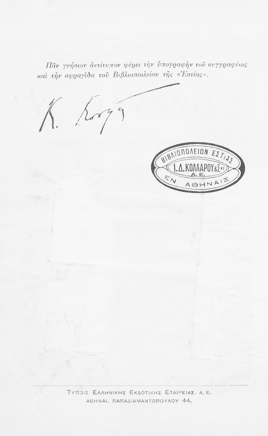 Εντοπισμός πρωτοτύπου: Ελληνικό Λογοτεχνικό και Ιστορικό Αρχείο Κωδικός βιβλιοθήκης: 1939 ΘΟΥ |