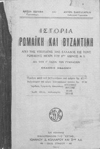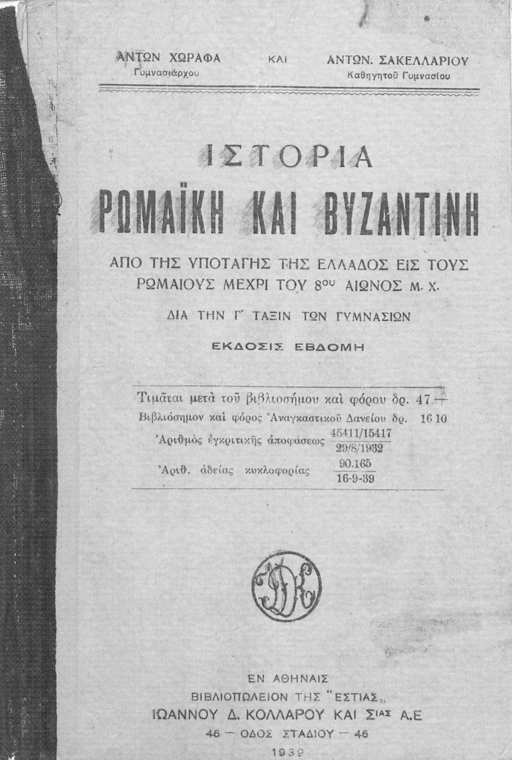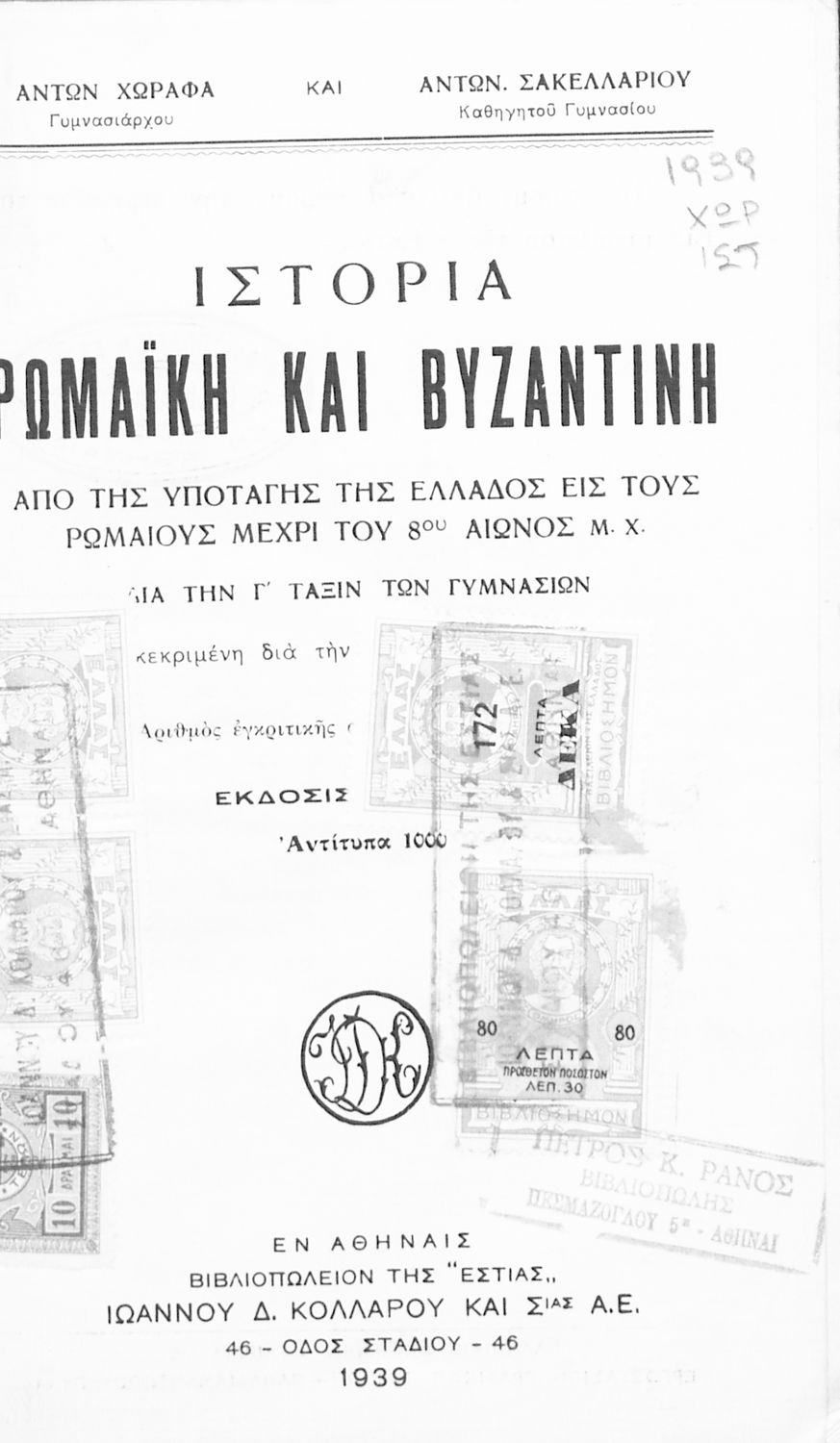 Κωδικός αναγνώρισης: 02-01204 Τίτλος: Ιστορία ρωμαϊκή και βυζαντινή από της υποταγής της Ελλάδος εις τους Ρωμαίους μέχρι του 8ου αιώνος μ.Χ. Δια την Γ΄ τάξιν των Γυμνασίων Συγγραφέας: Αντώνιος Χωραφάς, Αντώνιος Σακελλαρίου Μέγεθος και υπόστρωμα: Σχολικό εγχειρίδιο, σκληρό εξώφυλλο, 172 σελίδες. Εικόνες (ασπρόμαυρες), σκίτσα (ασπρόμαυρα), χάρτες (ασπρόμαυροι). |