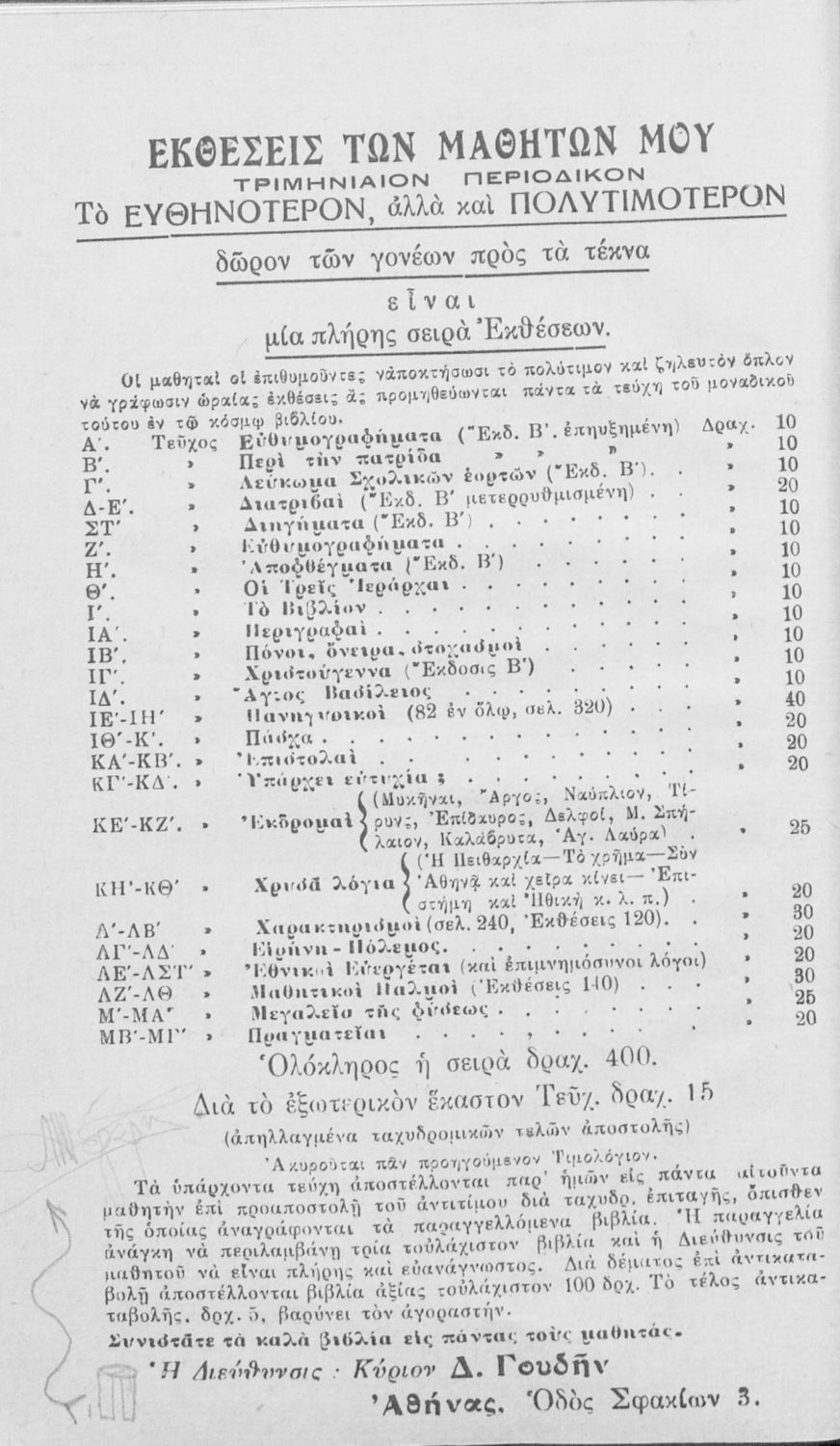 Εκδότης: Π. Δ. Κυριακού Έτος έκδοσης: 1938 Τόπος έκδοσης: Αθήνα Έκδοση: 3η Υπουργική απόφαση / Σύμβαση: 26047/22-3-1938 |
