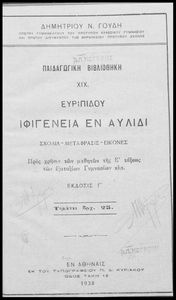 Κωδικός αναγνώρισης: 02-01218 Τίτλος: Ευριπίδου Ιφιγένεια εν Αυλίδι σχόλια, μετάφρασις, εικόνες προς χρήσιν των μαθητών της Ε΄ τάξεως των Εξατάξιων Γυμνασίων κλπ. Συγγραφέας: Ευριπίδης, Δημήτριος Ν. Γουδής (σχόλια) Μέγεθος και υπόστρωμα: Μαθητικό βοήθημα, σκληρό εξώφυλλο, 144 σελίδες. Εικόνες (ασπρόμαυρες), σκίτσα (ασπρόμαυρα). |