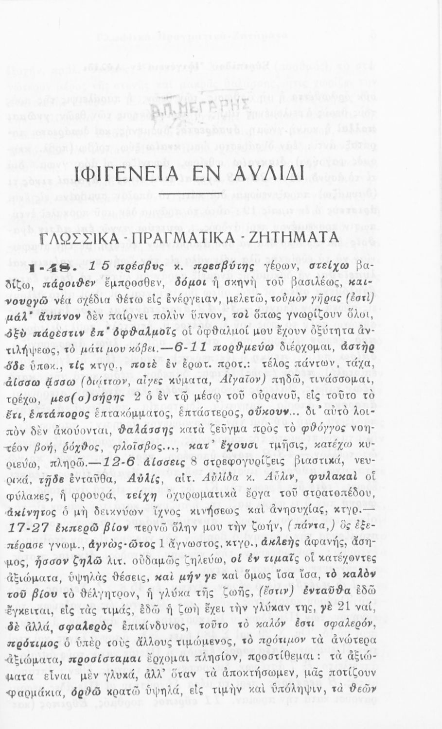 520 ## _aΠαιδαγωγικό βοήθημα Αρχαίων Ελληνικών Ε΄ Γυμνασίου που περιλαμβάνει ερμηνευτικές, γλωσσικές και πραγματολογικές παρατηρήσεις στην τραγωδία του Ευριπίδη Ιφιγένειας εν Αυλίδι