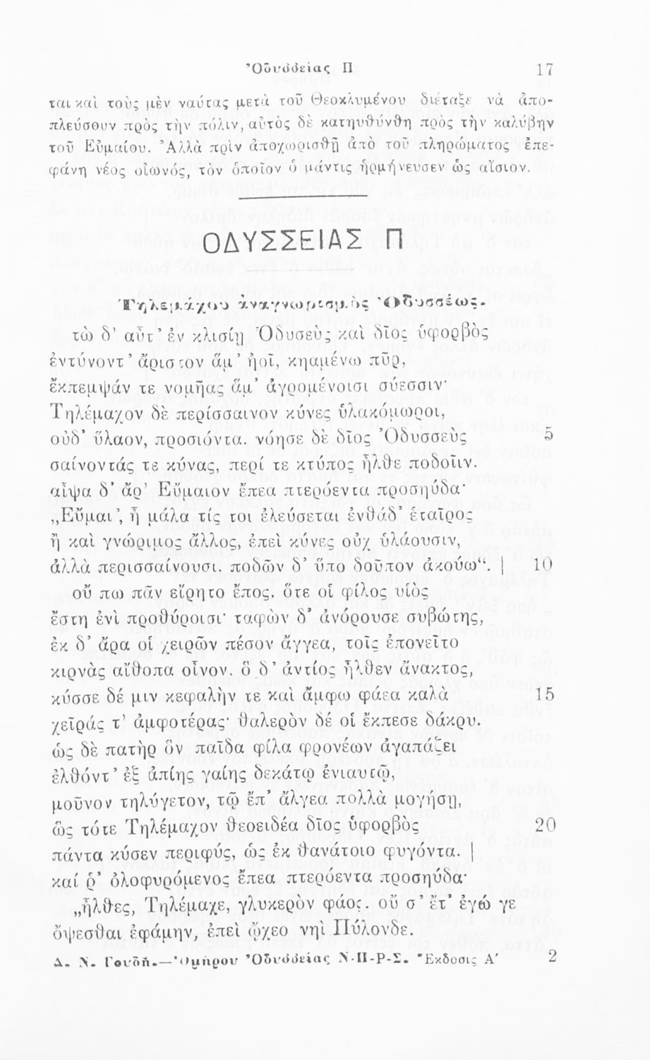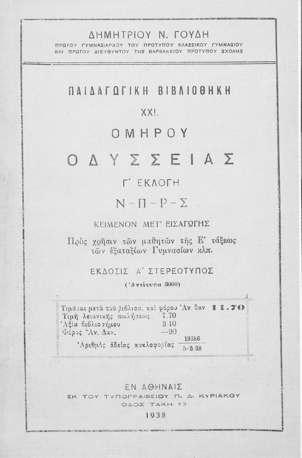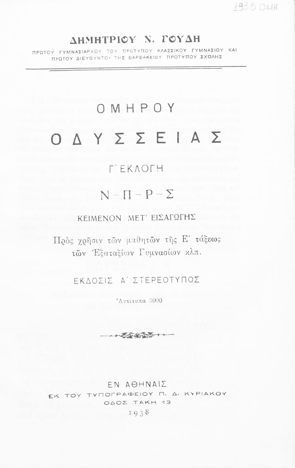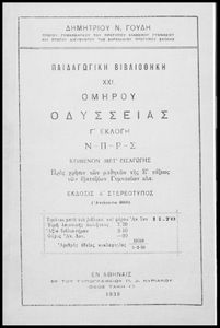 Τίτλος: Ομήρου Οδύσσειας Γ΄ εκλογή Ν-Π-Ρ-Σ προς χρήσιν των μαθητών της Ε΄ τάξεως των Εξαταξίων Γυμνασίων