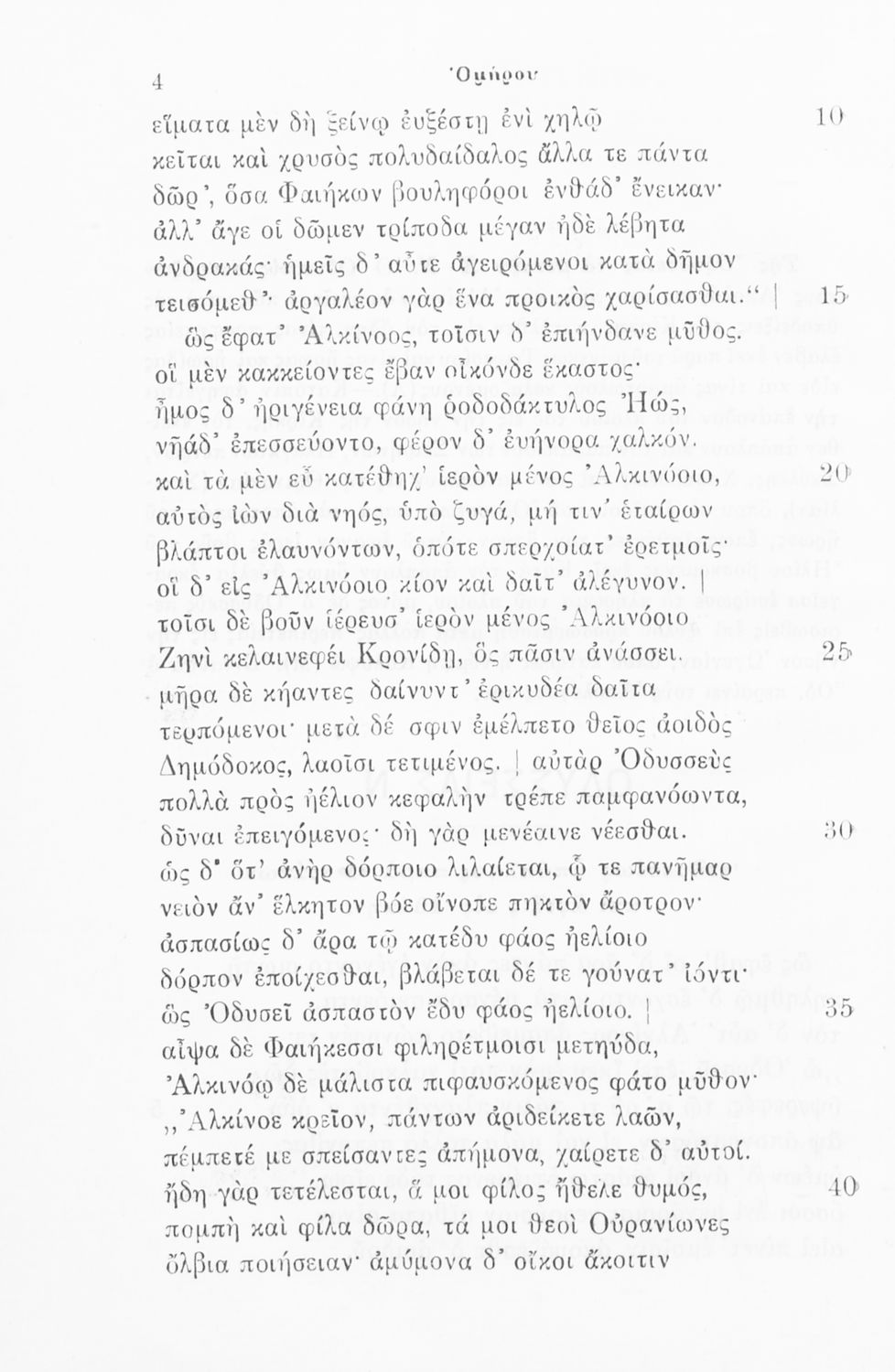 Σχολικό εγχειρίδιο Αρχαίων Ελληνικών για την Δ΄ τάξη των Εξαταξίων Γυμνασίων που περιλαμβάνει εισαγωγή στην Οδύσσεια, αποσπάσματα από τις ραψωδίες Α-Θ-Ι-Κ και γλωσσικά και πραγματολογικά σχόλια.