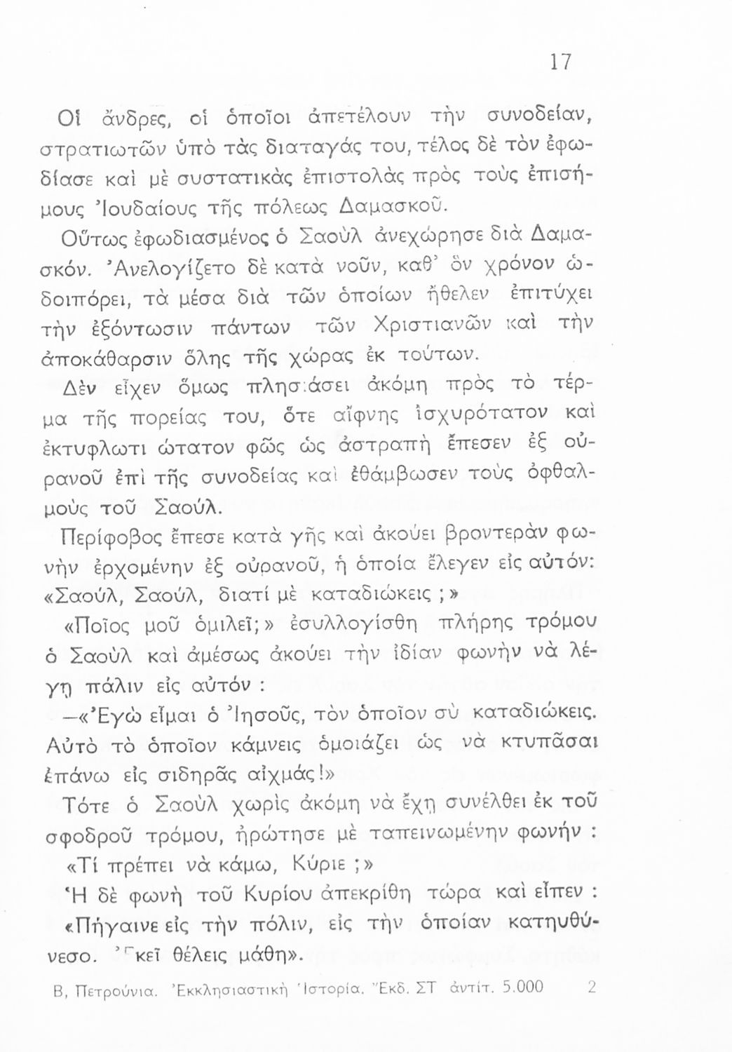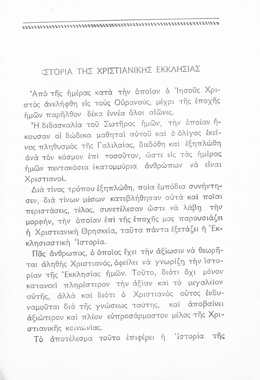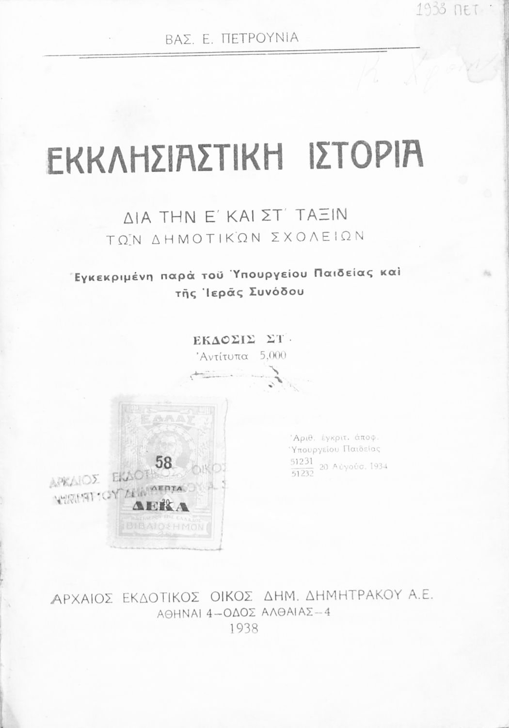 Βαθμίδα εκπαίδευσης: Πρωτοβάθμια Τάξη: Ε' Δημοτικού / ΣΤ' Δημοτικού Μάθημα: Θρησκευτικά Γλώσσα: Απλή καθαρεύουσα Παρουσίαση περιεχομένου: Σχολικό εγχειρίδιο Θρησκευτικών Ε΄ και ΣΤ΄ Δημοτικού που αποτελεί μια ιστορική επισκόπηση της Ορθόδοξης Εκκλησίας από την ίδρυσή της μέχρι την ίδρυση της Εκκλησίας της Ελλάδας. |