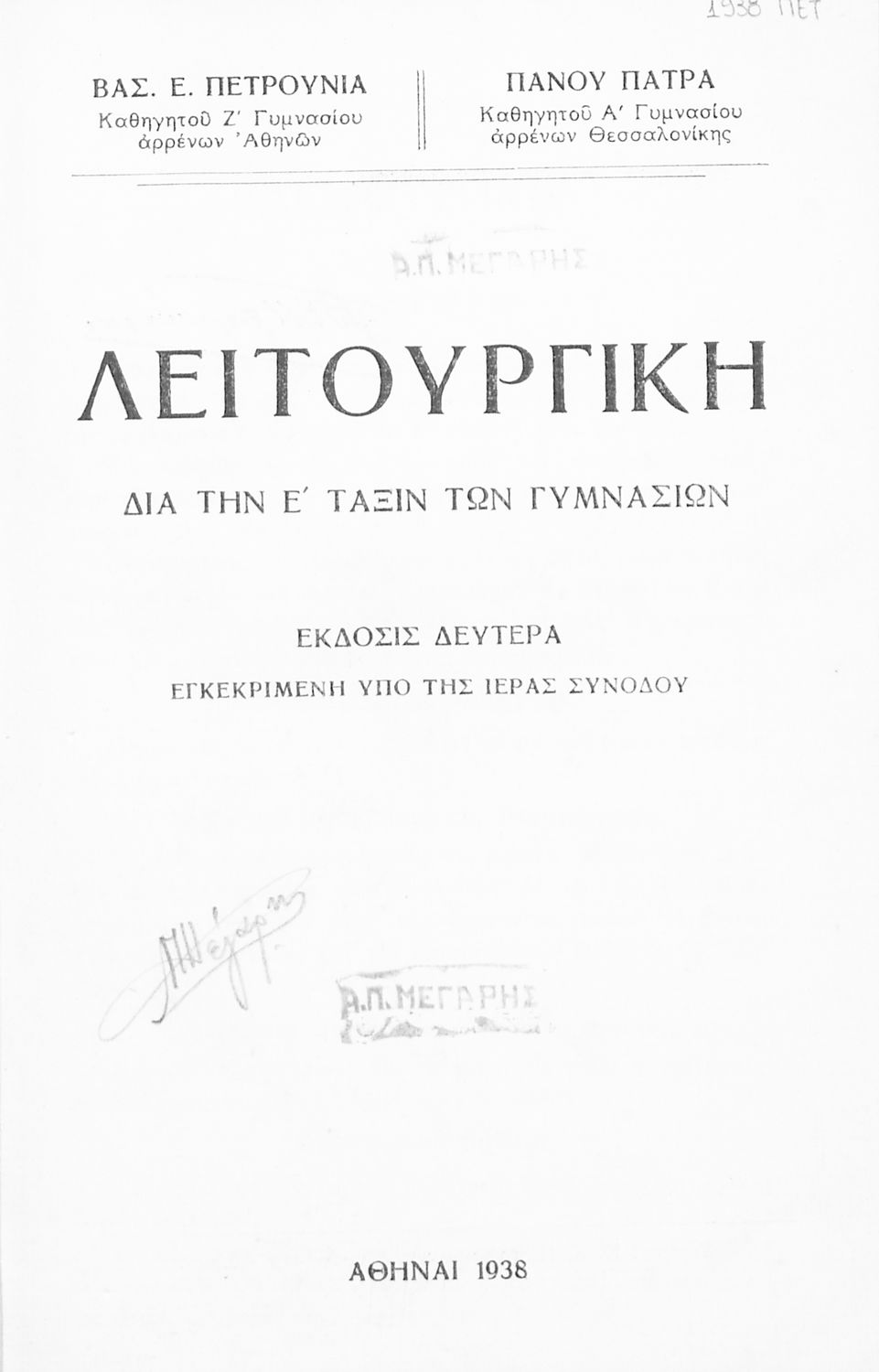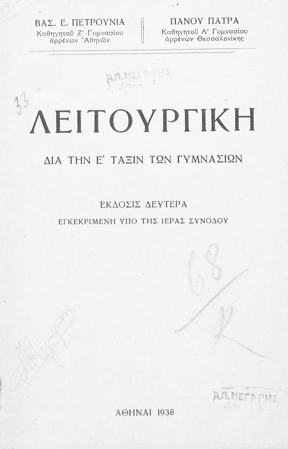 Κωδικός αναγνώρισης: 02-01246 Τίτλος: Λειτουργική διά την Ε΄ τάξιν των Γυμνασίων Συγγραφέας: Βασίλειος Ε. Πετρούνιας, Πάνος Πάτρας Μέγεθος και υπόστρωμα: Μαθητικό βοήθημα, σκληρό εξώφυλλο, 72 σελίδες. |