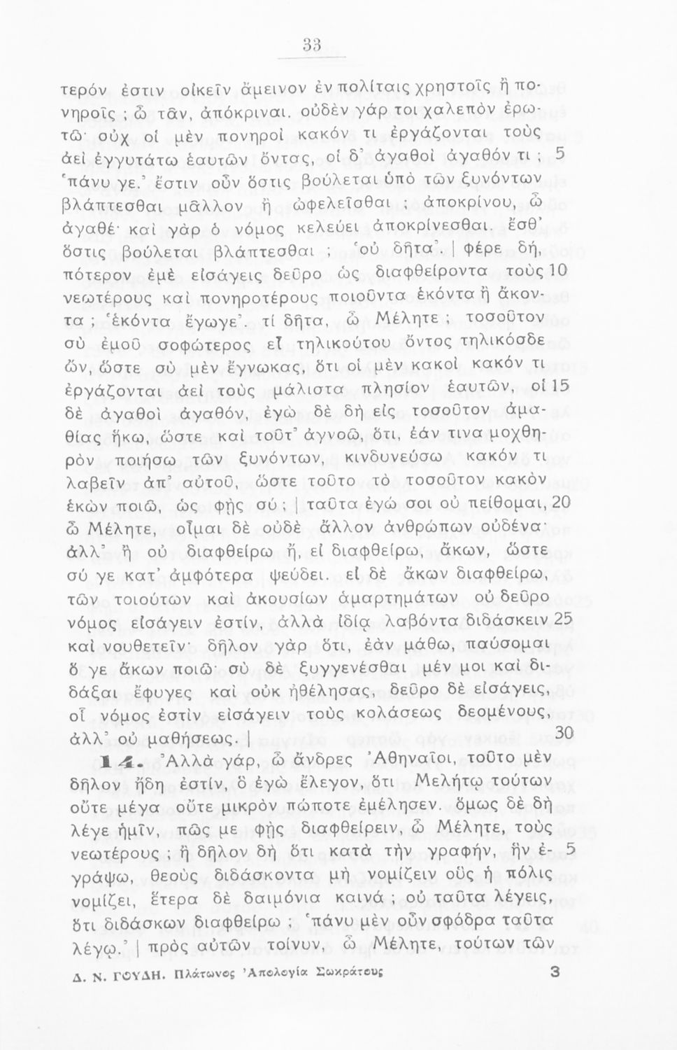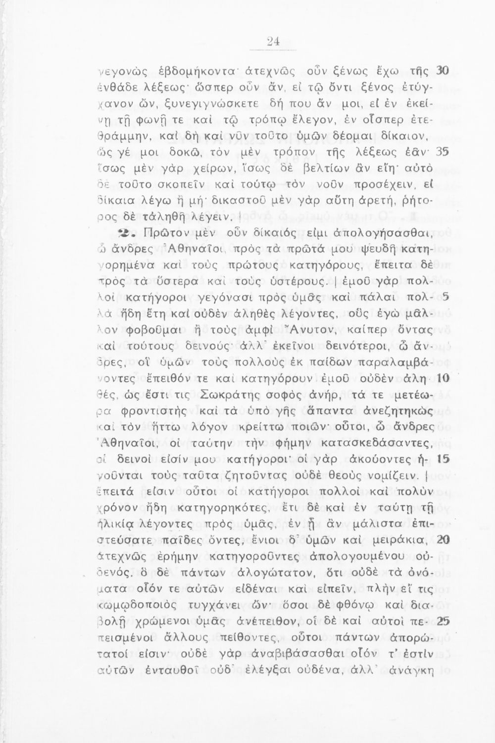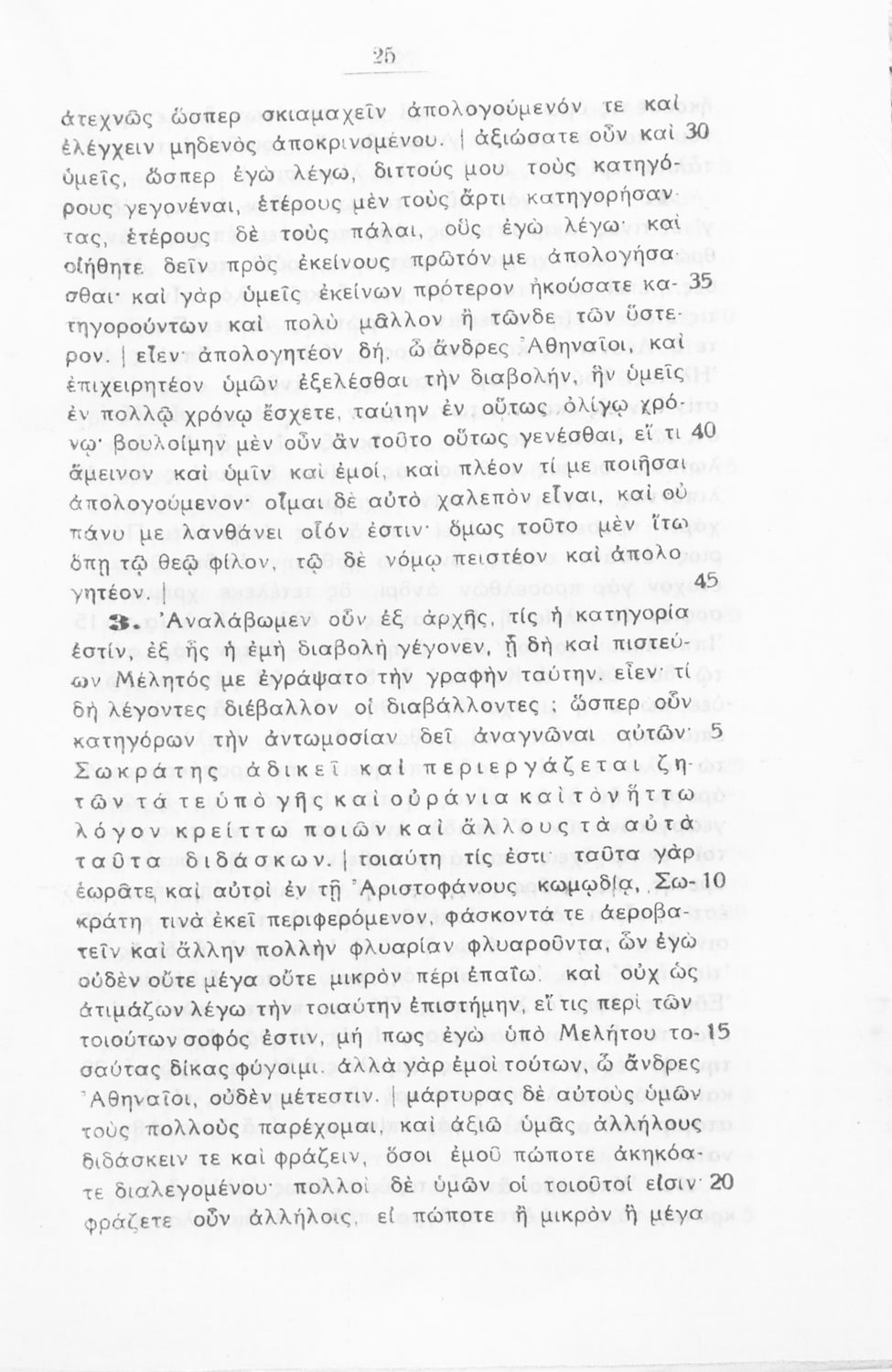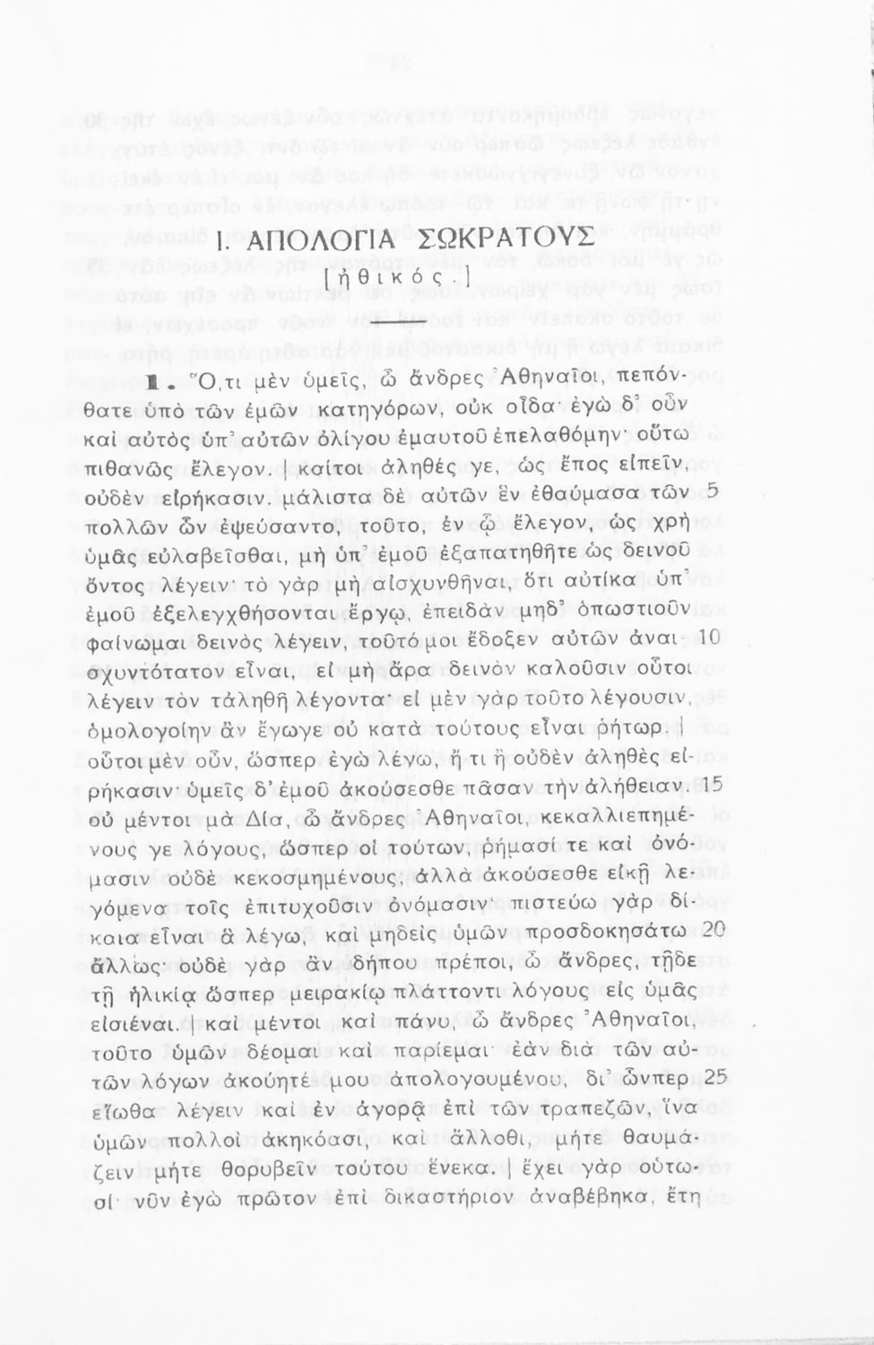 Μαθητικό βοήθημα Αρχαίων Ελληνικών της Γ΄ τάξης των τετρατάξιων Γυμνασίων. Το βιβλίο περιέχει σε μετάφραση το έργο του Πλάτωνα Απολογία του Σωκράτη.