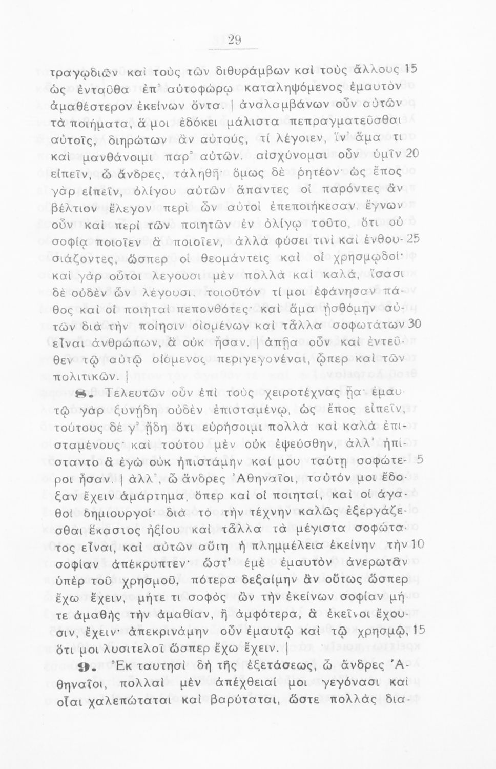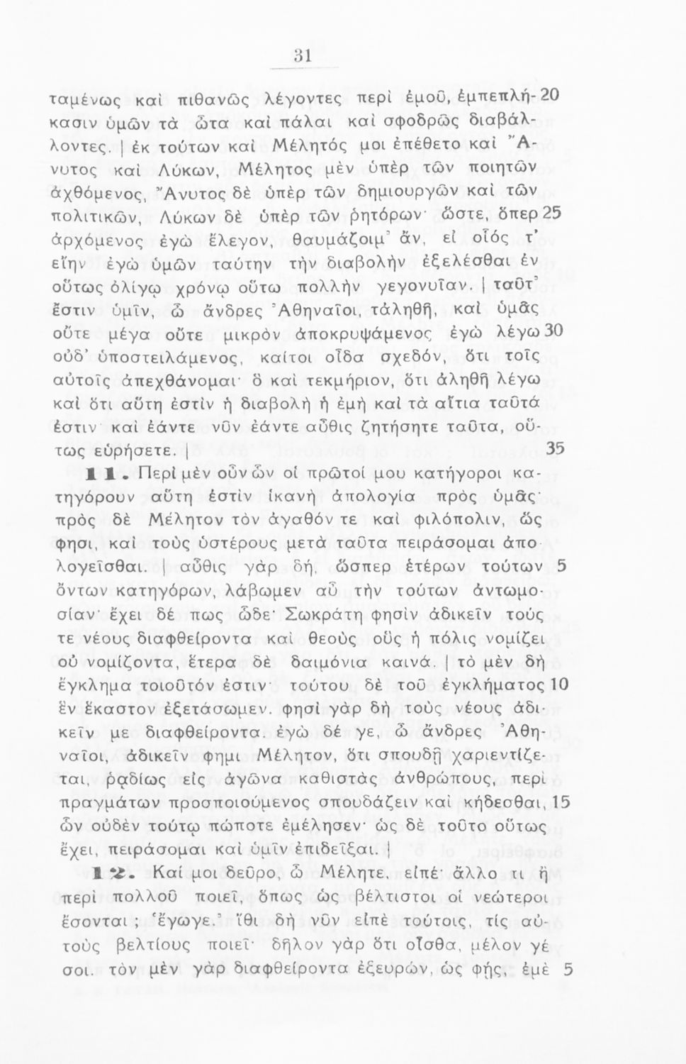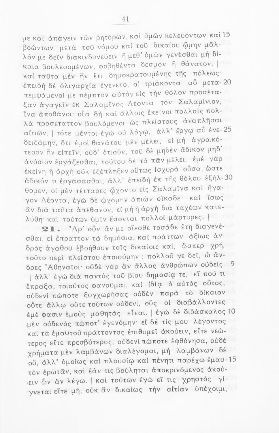 Μαθητικό βοήθημα Αρχαίων Ελληνικών της Γ΄ τάξης των τετρατάξιων Γυμνασίων. Το βιβλίο περιέχει σε μετάφραση το έργο του Πλάτωνα Απολογία του Σωκράτη.