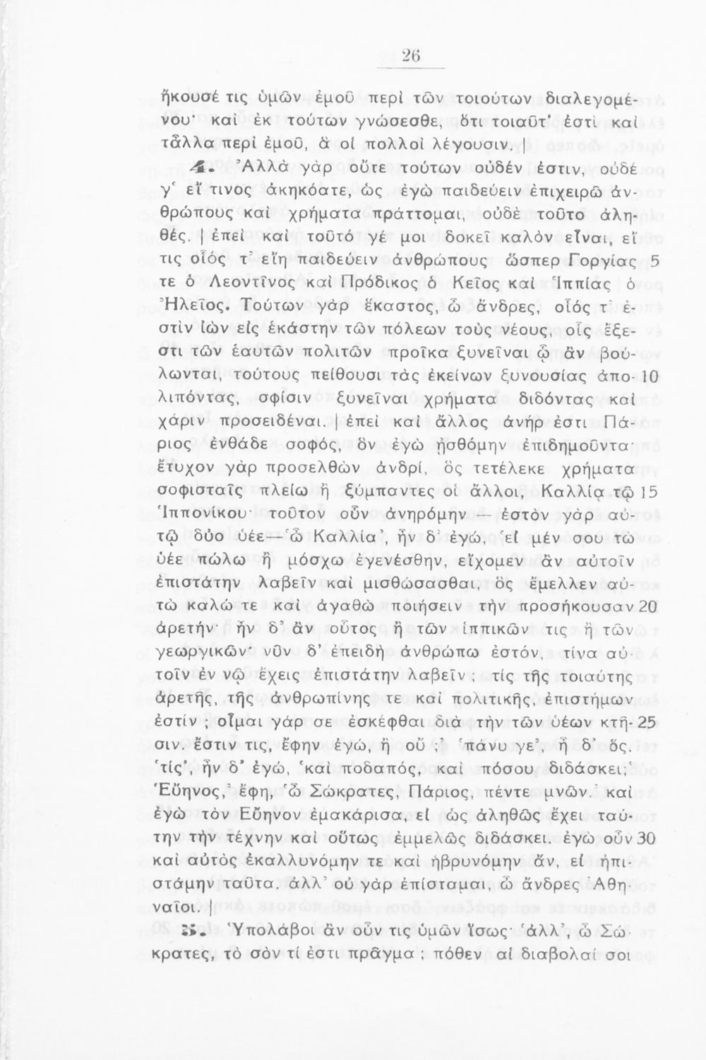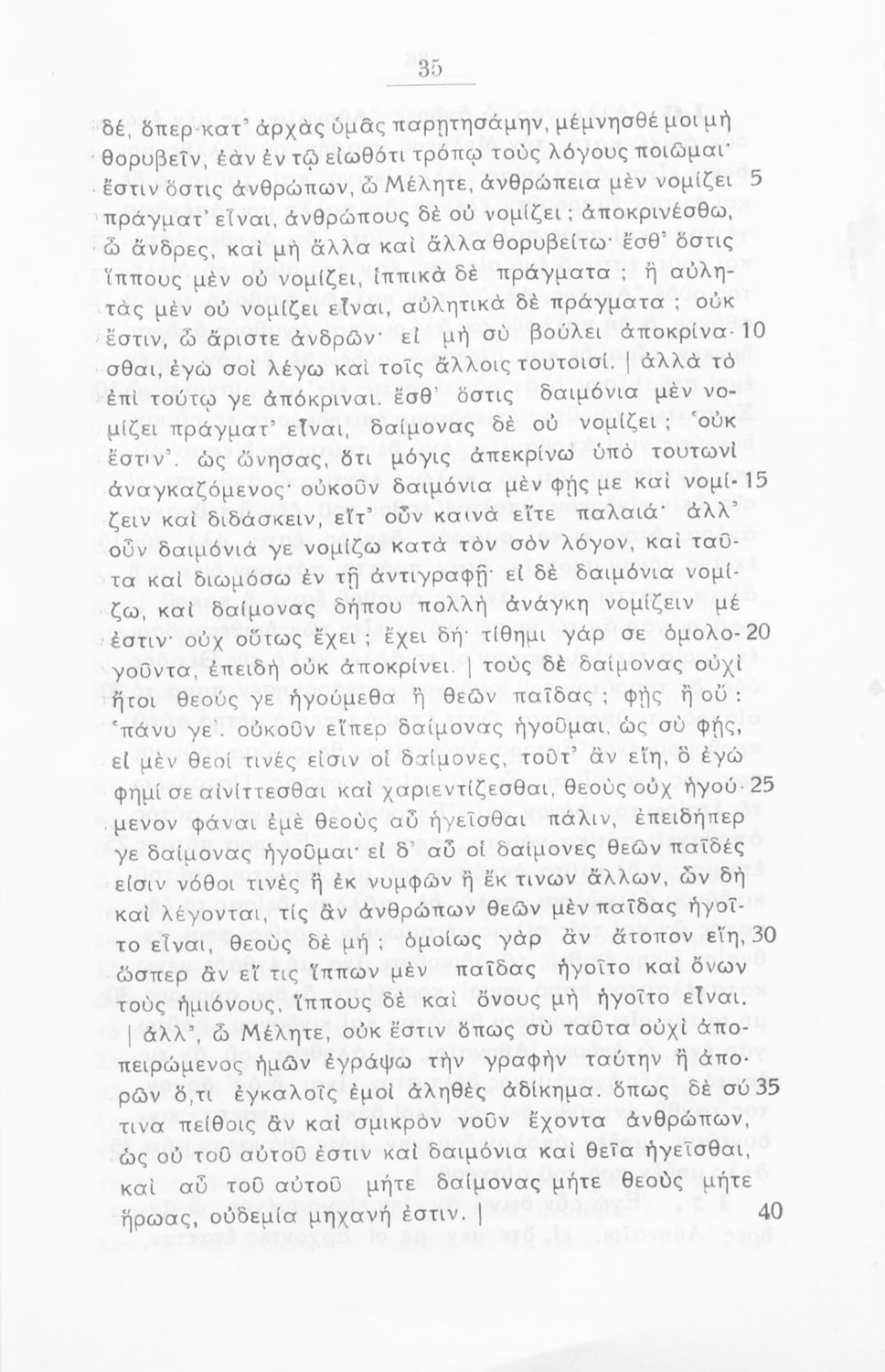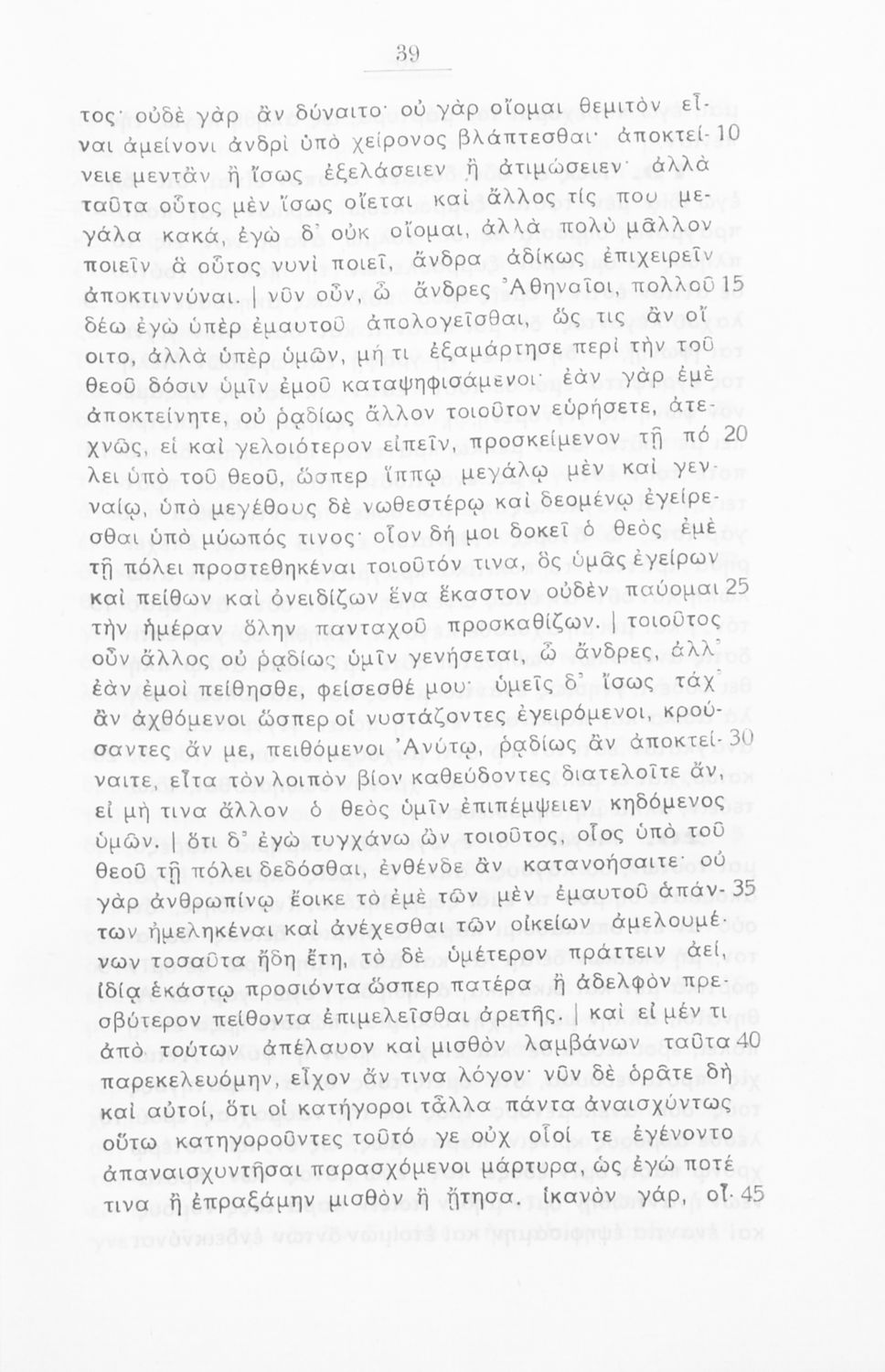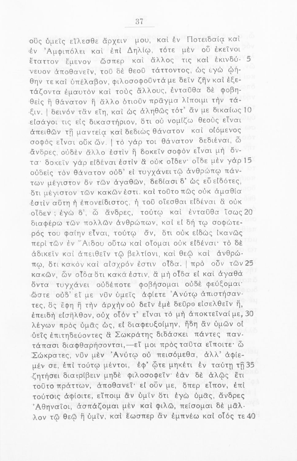 Μαθητικό βοήθημα Αρχαίων Ελληνικών της Γ΄ τάξης των τετρατάξιων Γυμνασίων. Το βιβλίο περιέχει σε μετάφραση το έργο του Πλάτωνα Απολογία του Σωκράτη.