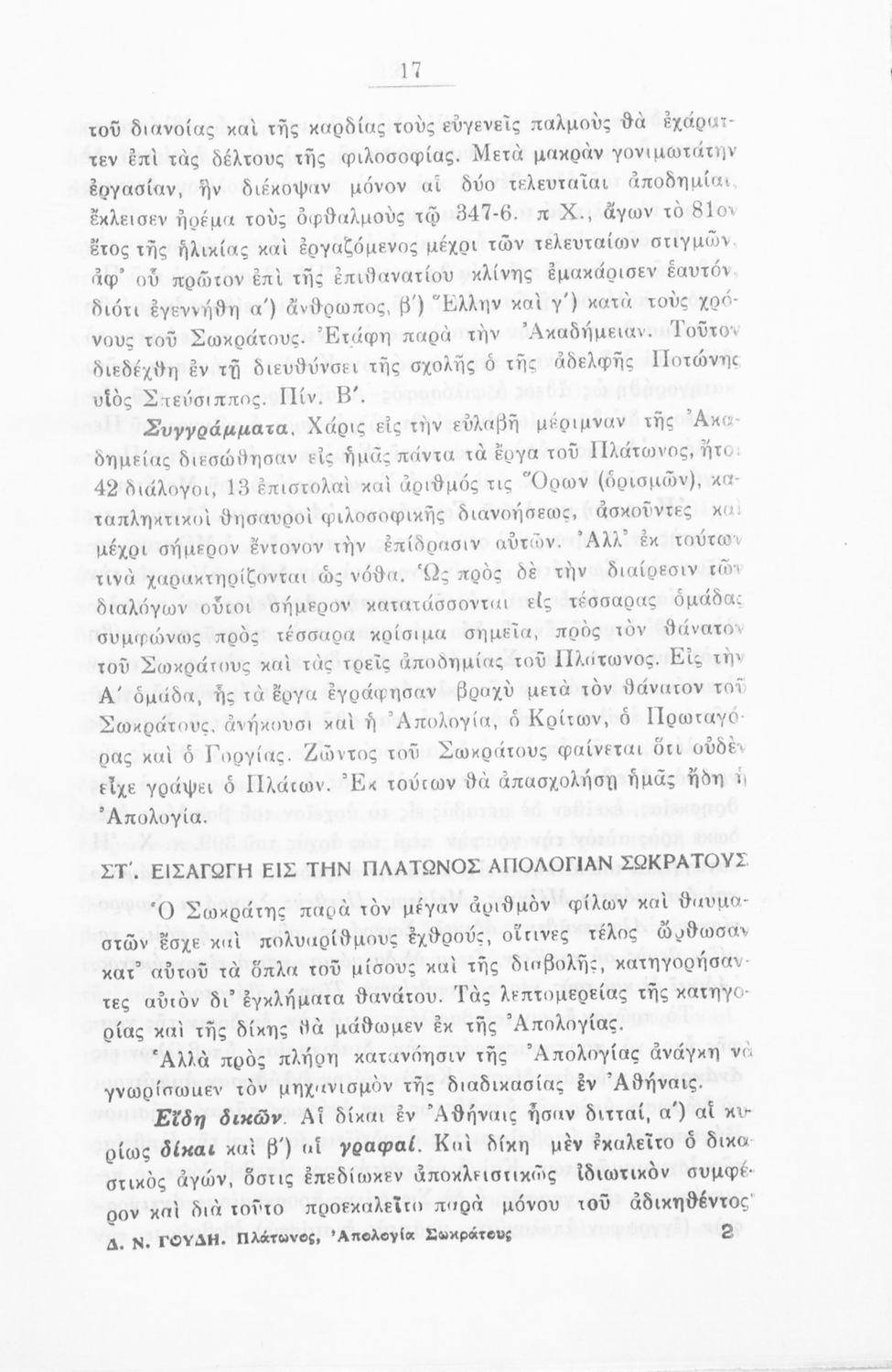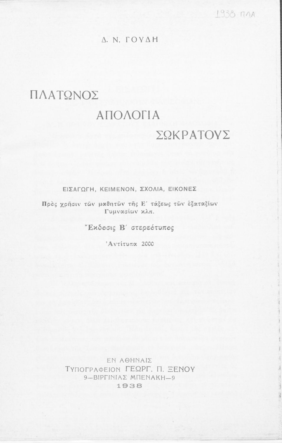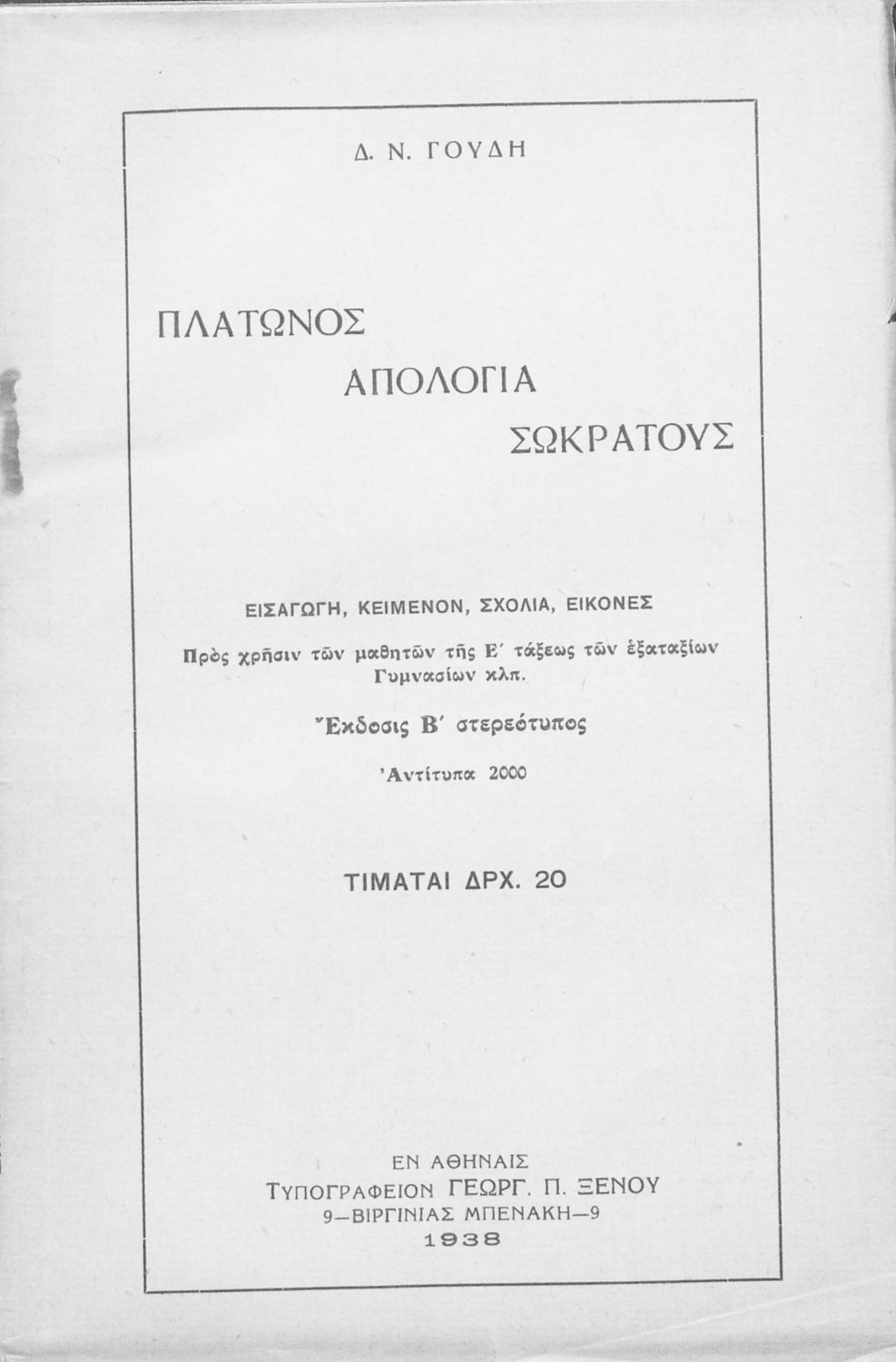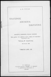 Κωδικός αναγνώρισης: 02-01248 Τίτλος: Πλάτωνος απολογία Σωκράτους προς χρήσιν των μαθητών της Ε΄ τάξεως των Εξαταξίων Γυμνασίων Συγγραφέας: Πλάτων, Δημ. Ν. Γουδής (σχόλια) Μέγεθος και υπόστρωμα: Σχολικό εγχειρίδιο, 112 σελίδες. Σκίτσα (ασπρόμαυρα). |