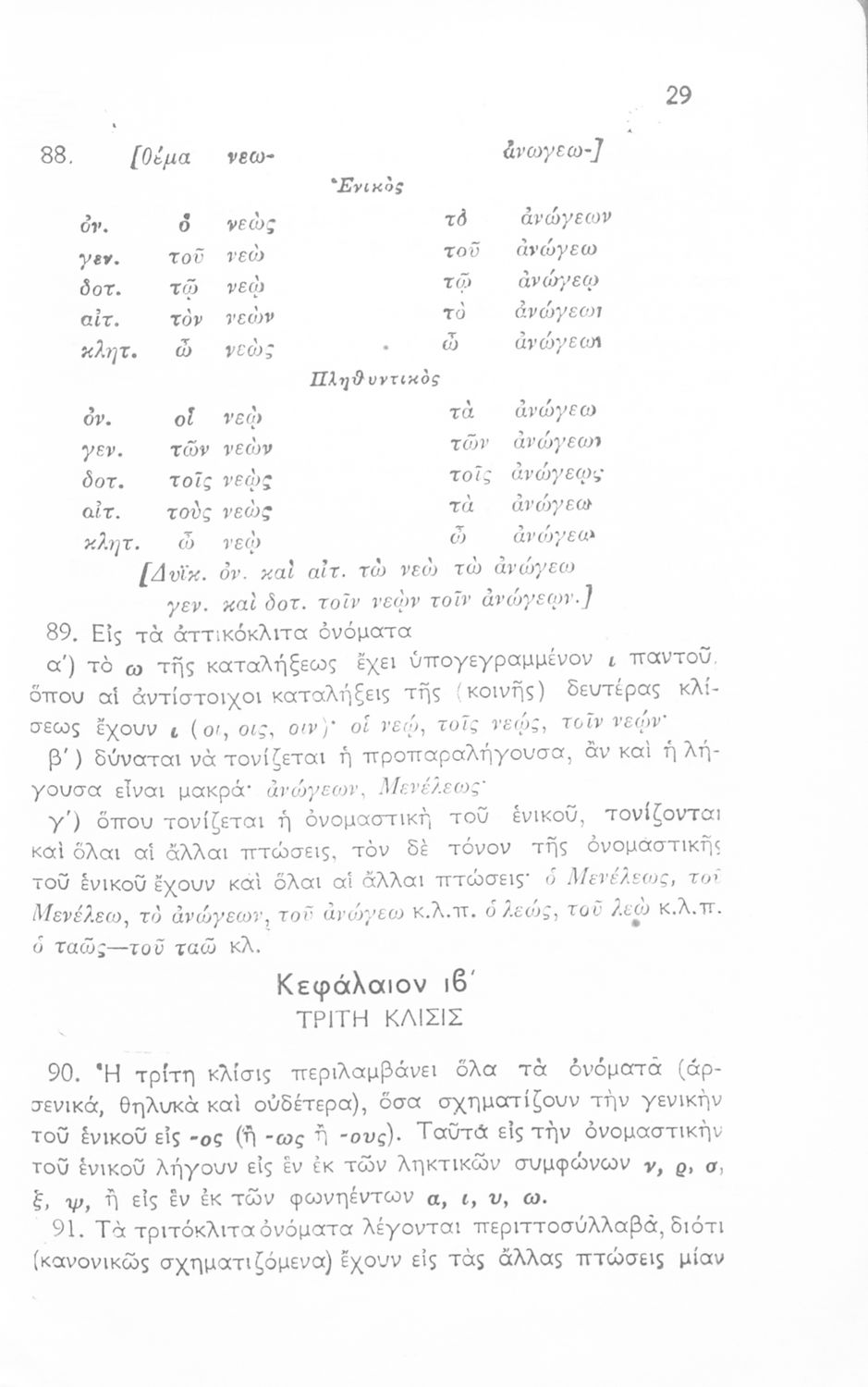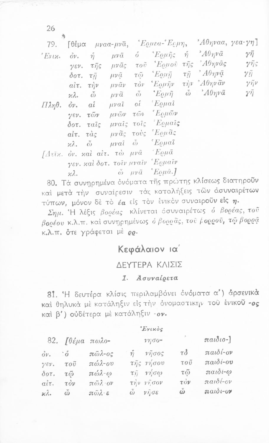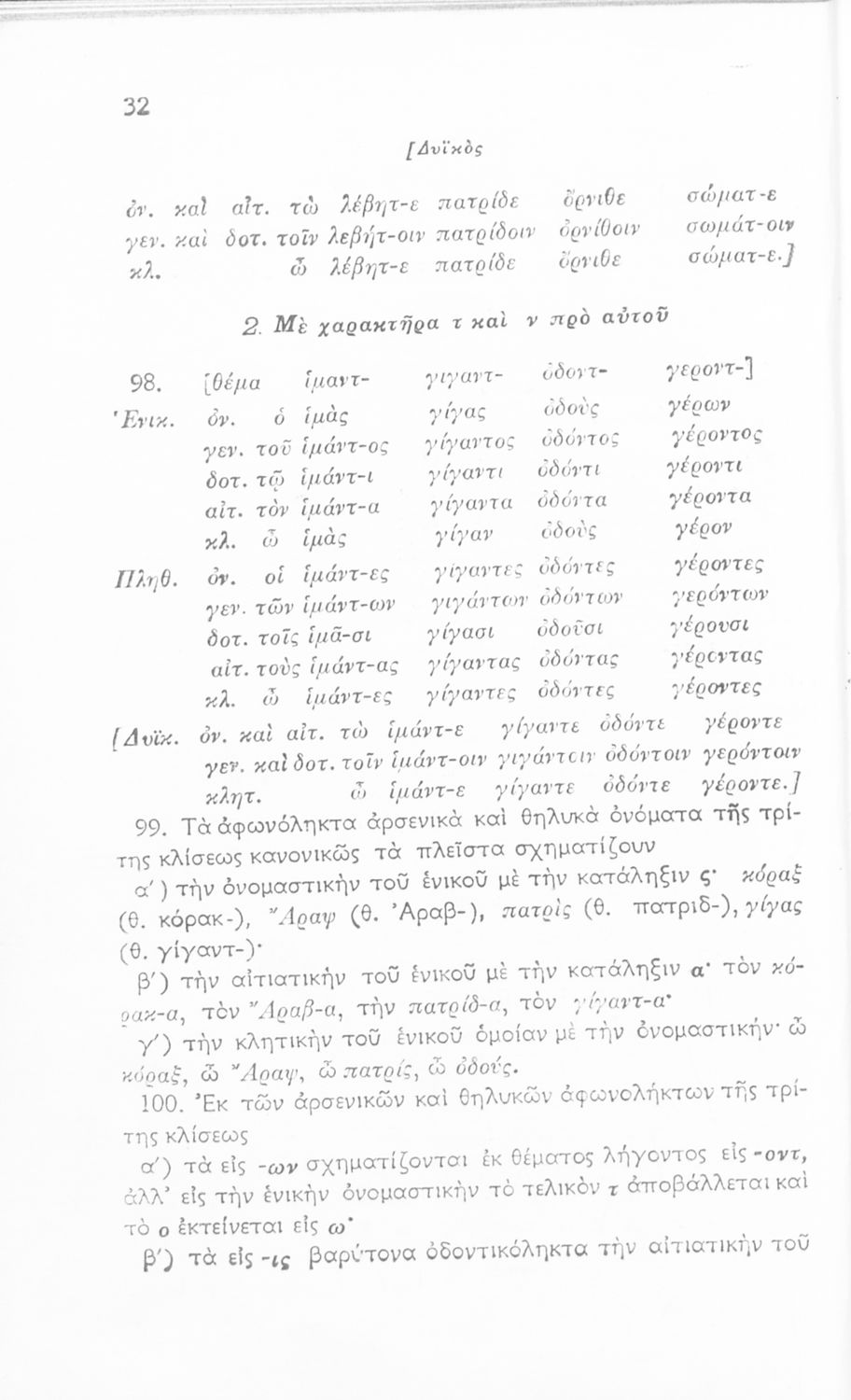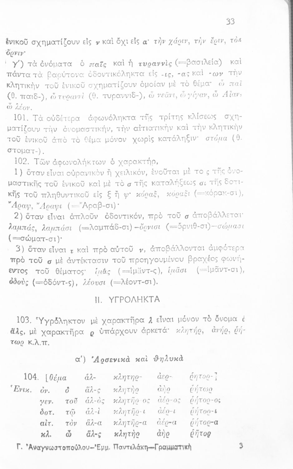 Σχολικό εγχειρίδιο Αρχαίων Ελληνικών Γυμνασίου που περιλαμβάνει τη γραμματική της αρχαίας ελληνικής και είναι χωρισμένο σε φθογγολογικό και τυπολογικό μέρος Περιέχει και κατάλογο ανωμάλων ρημάτων.