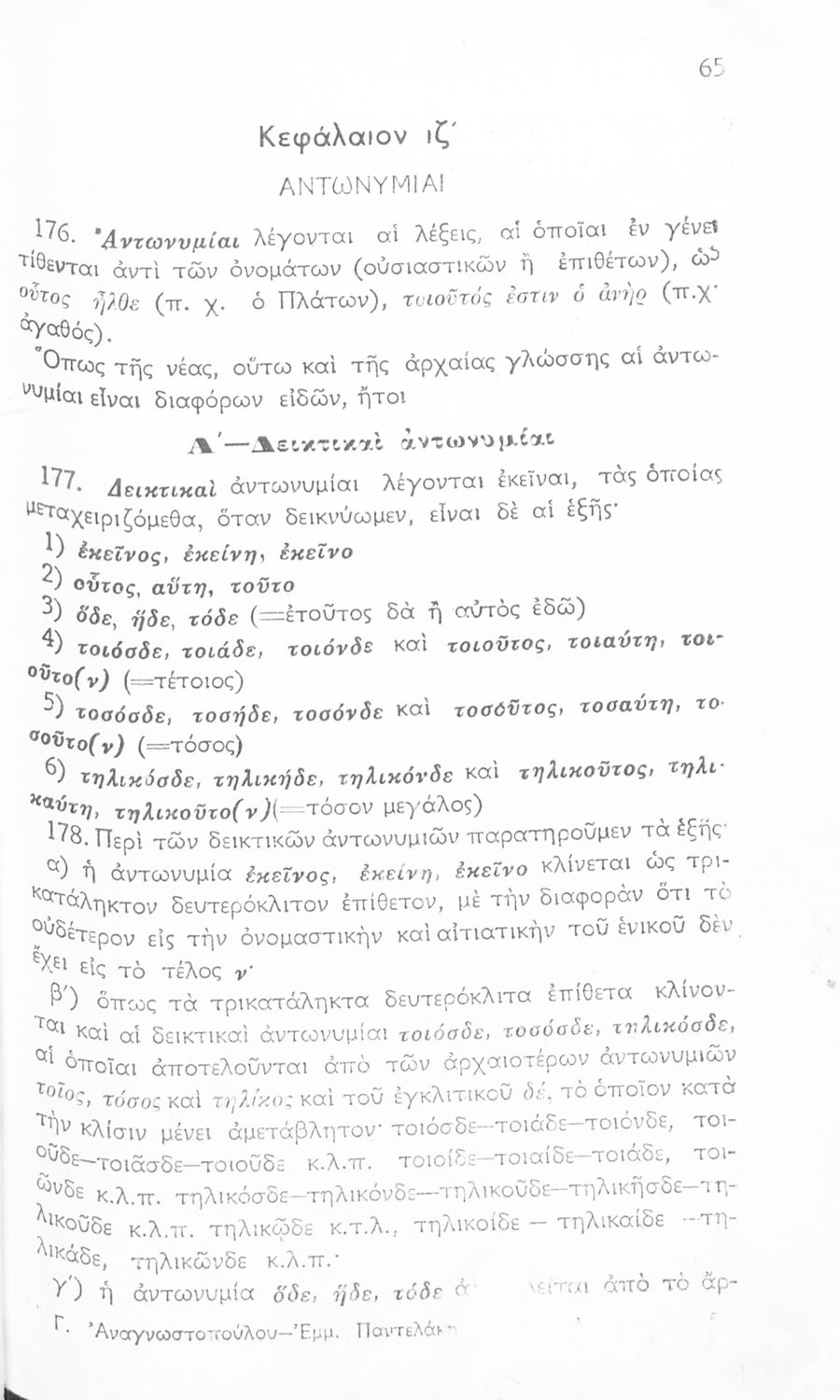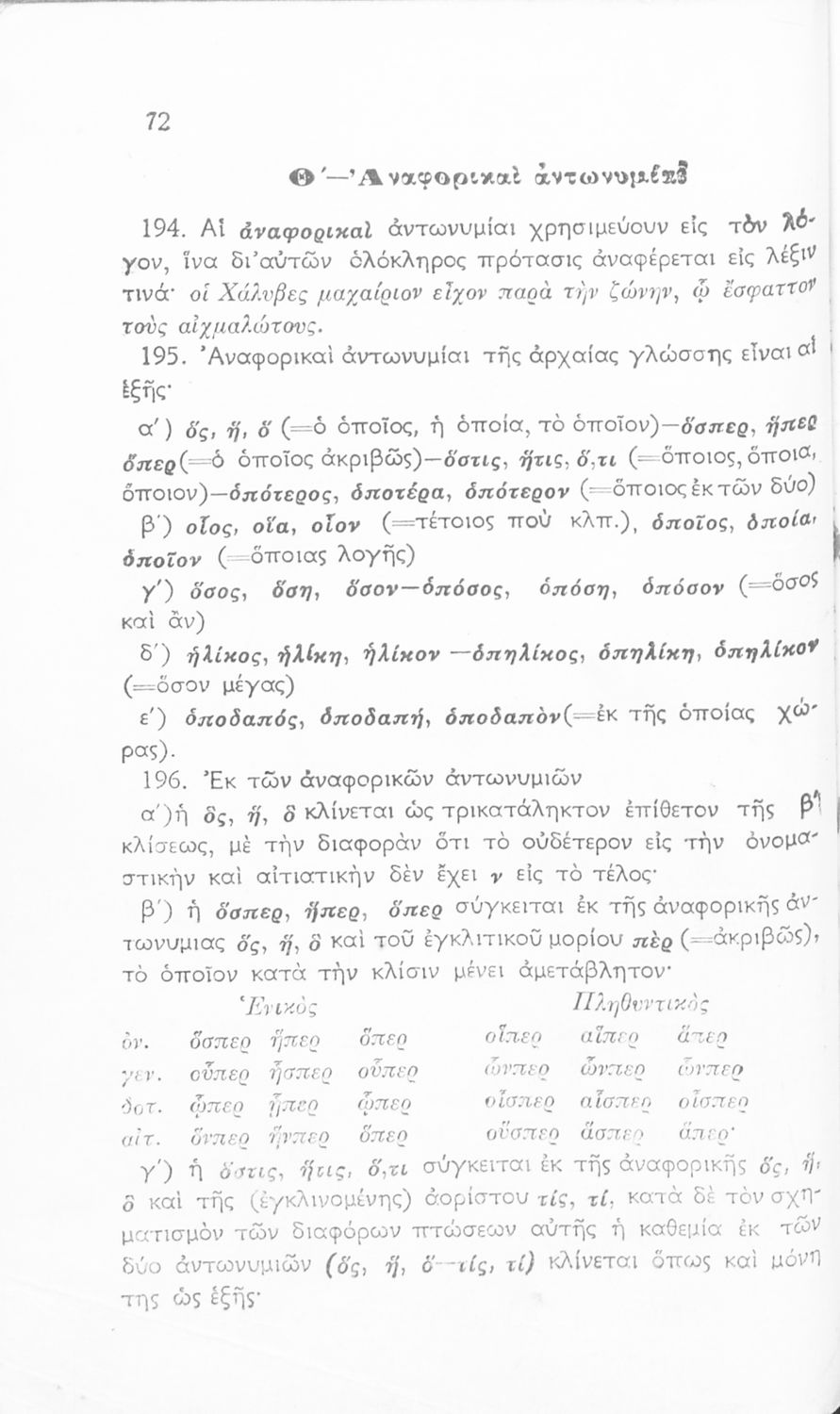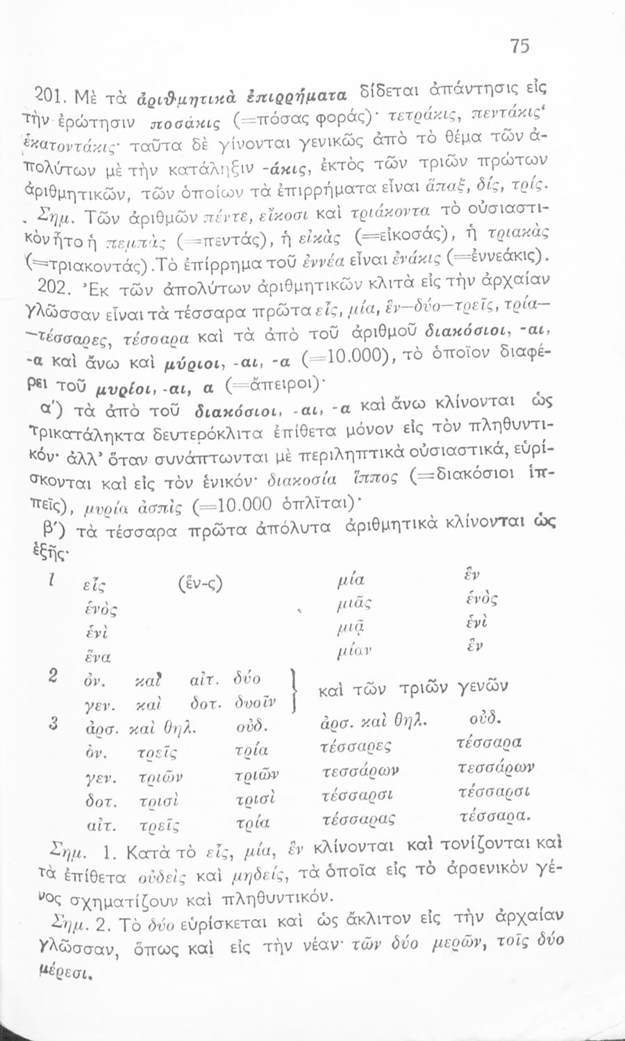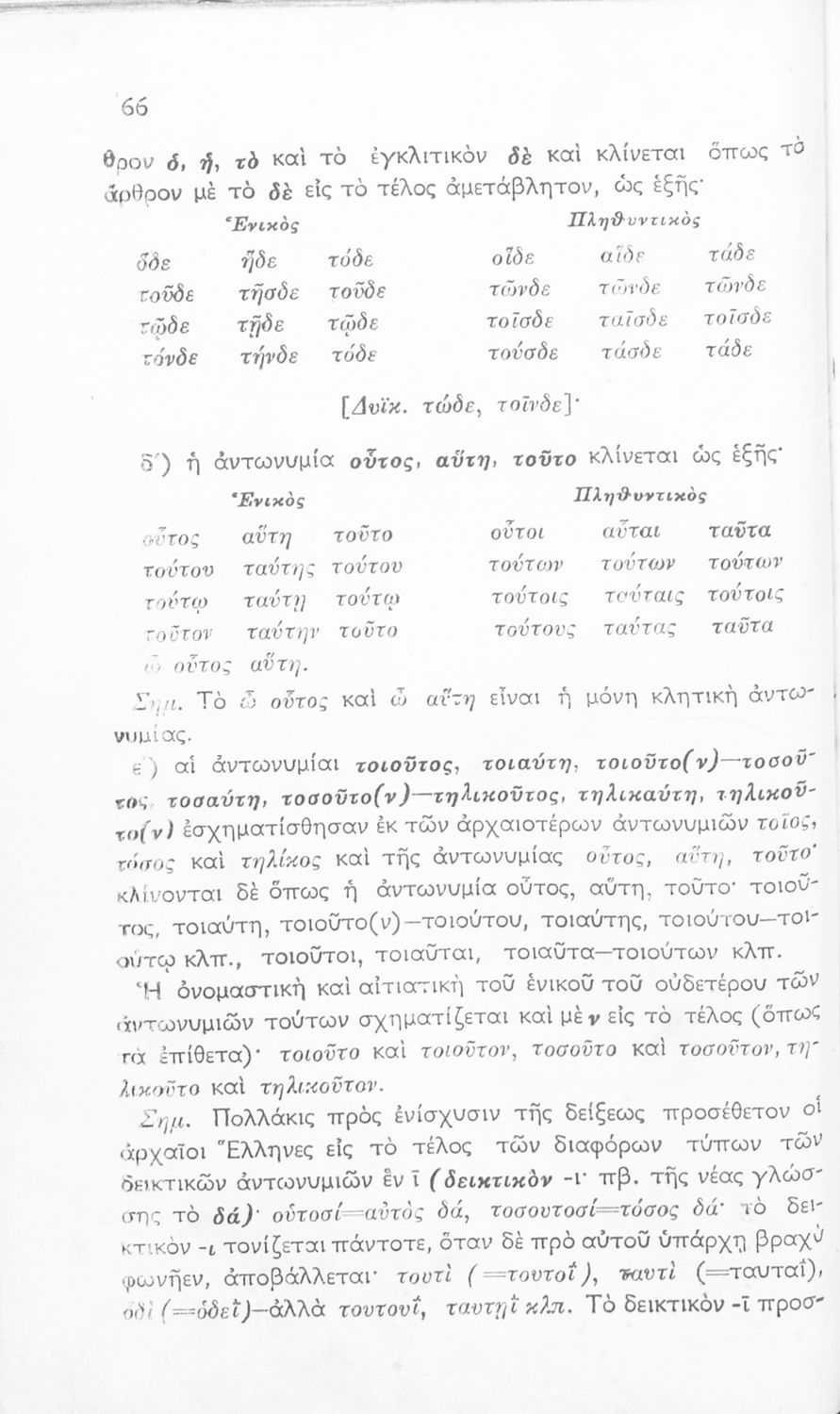Σχολικό εγχειρίδιο Αρχαίων Ελληνικών Γυμνασίου που περιλαμβάνει τη γραμματική της αρχαίας ελληνικής και είναι χωρισμένο σε φθογγολογικό και τυπολογικό μέρος Περιέχει και κατάλογο ανωμάλων ρημάτων.