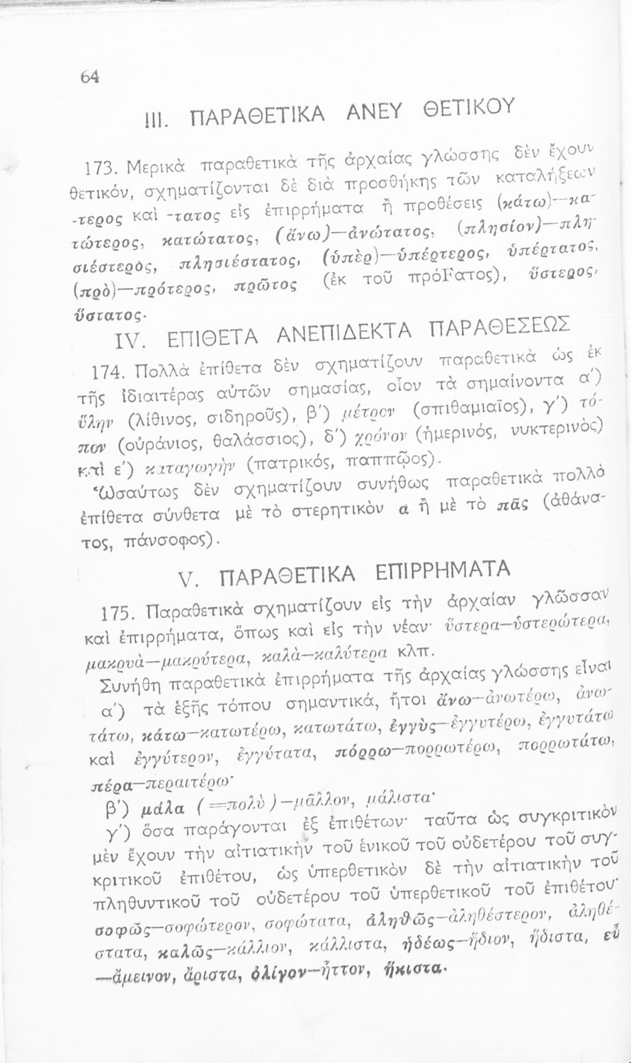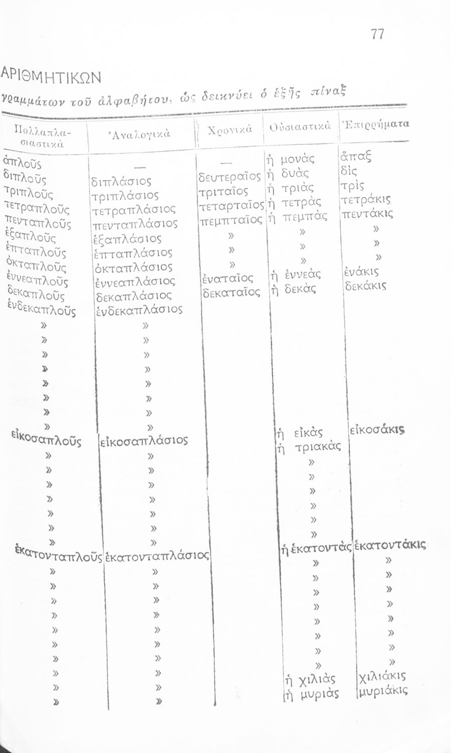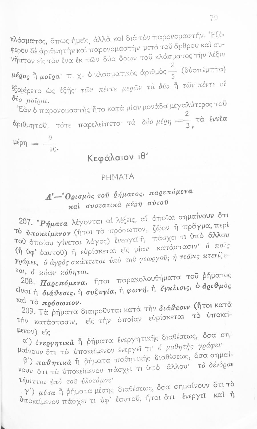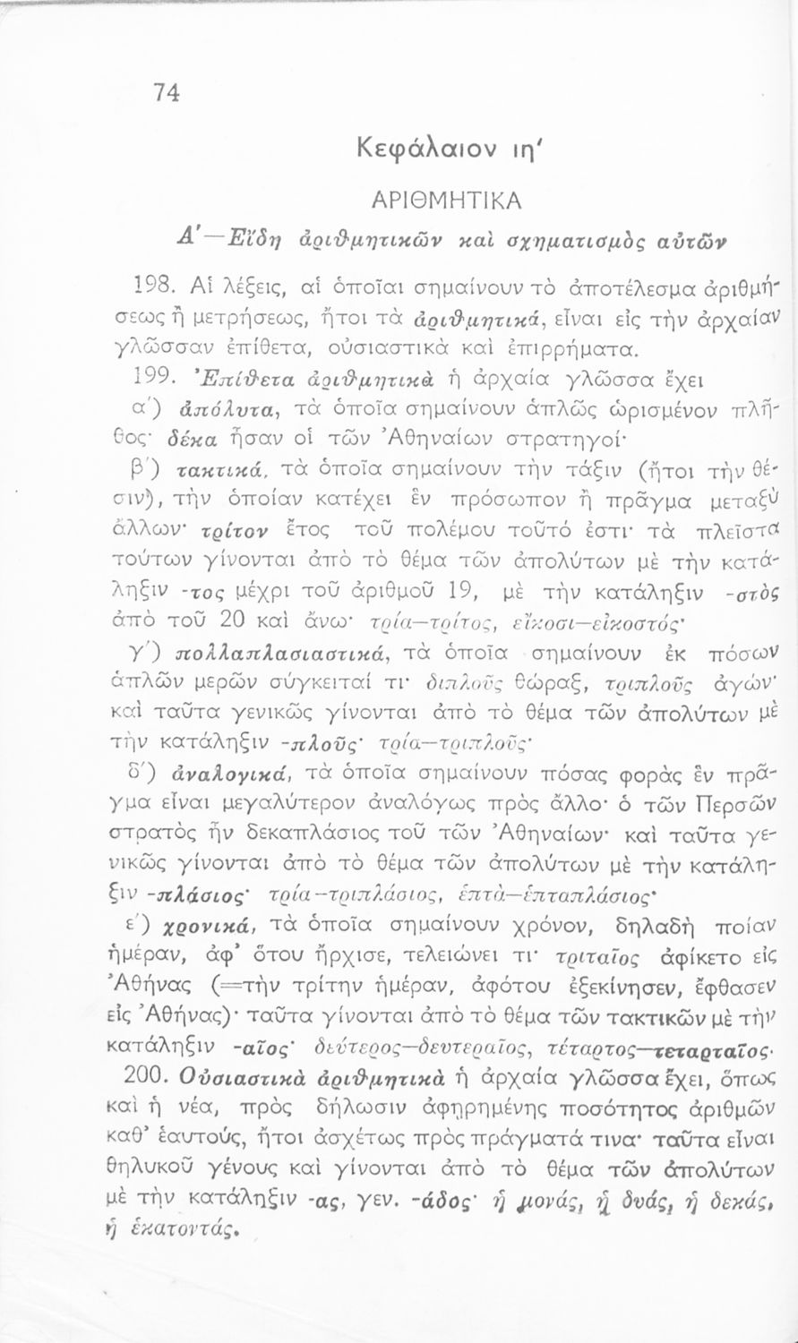 Σχολικό εγχειρίδιο Αρχαίων Ελληνικών για τα Ελληνικά Σχολεία, Παρθεναγωγεία και Γυμνάσια που περιέχει τους κανόνες γραμματικής και είναι χωρισμένο σε φθογγολογικό, τυπολογικό και ετυμολογικό μέρος.