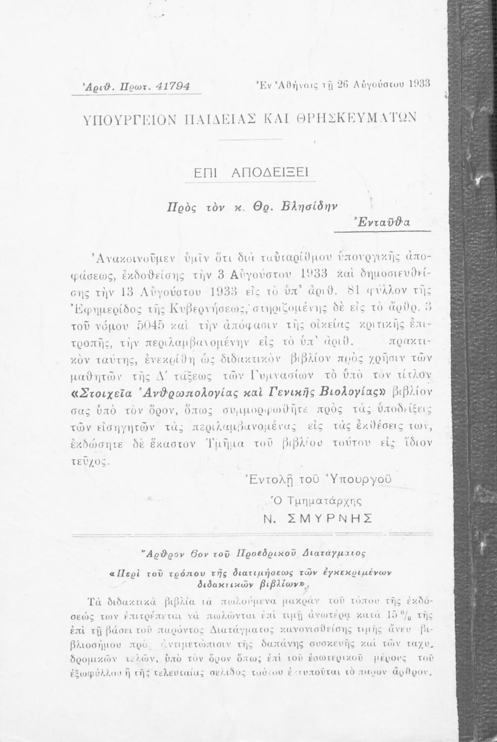 Υπουργική απόφαση / Σύμβαση: 41794/26-8-1933