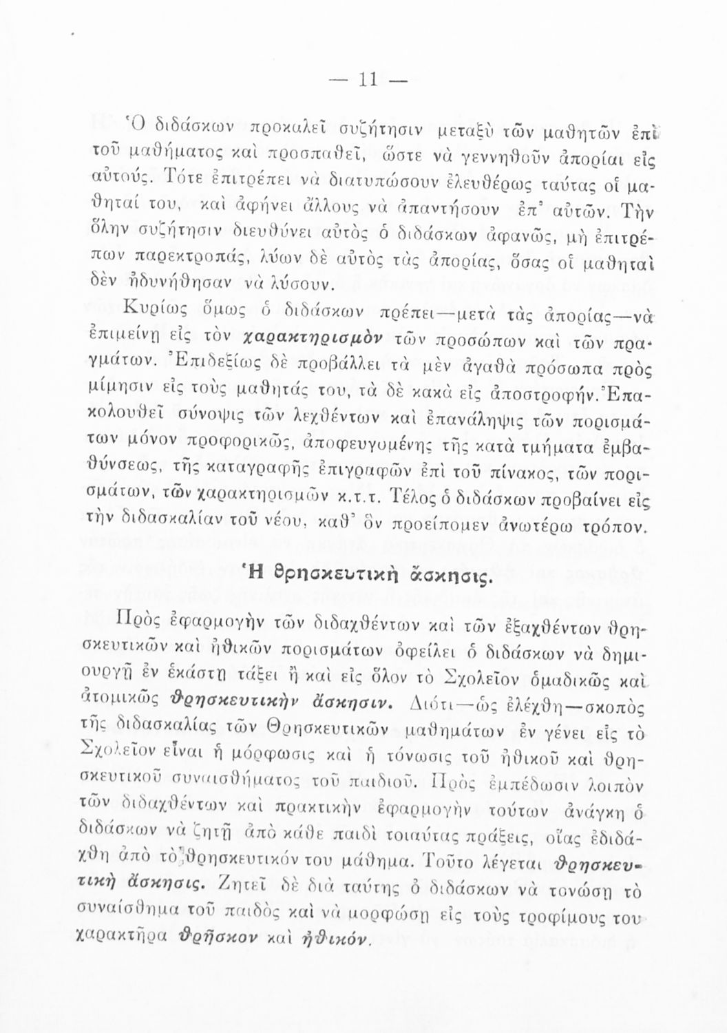 Βαθμίδα εκπαίδευσης: Πρωτοβάθμια Τάξη: Ε' Δημοτικού Μάθημα: Θρησκευτικά Γλώσσα: Απλή καθαρεύουσα Παρουσίαση περιεχομένου: Παιδαγωγικό βοήθημα Θρησκευτικών που περιλαμβάνει εισαγωγή στο σκοπό και τη μέθοδο διδασκαλίας της εκκλησιαστικής ιστορίας, των προσευχών και απολυτίκιων, και την ερμηνεία των περικοπών των ευαγγελίων. Περιέχει και εκτεταμένη ανασκόπηση της Ορθόδοξης Εκκλησίας από την ίδρυσή της μέχρι την ίδρυση της Εκκλησίας της Ελλάδας, απολυτίκια, προσευχές και τροπάρια. |