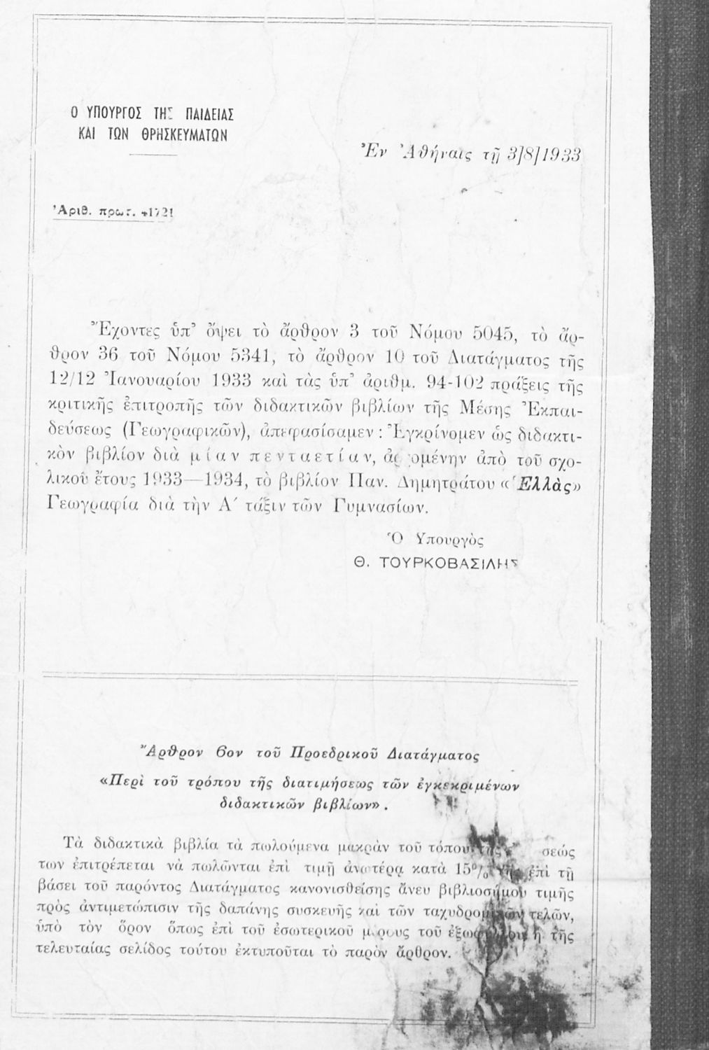 Υπουργική απόφαση / Σύμβαση: 41721/3-8-1933