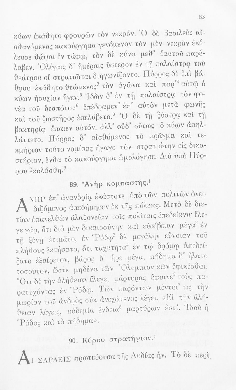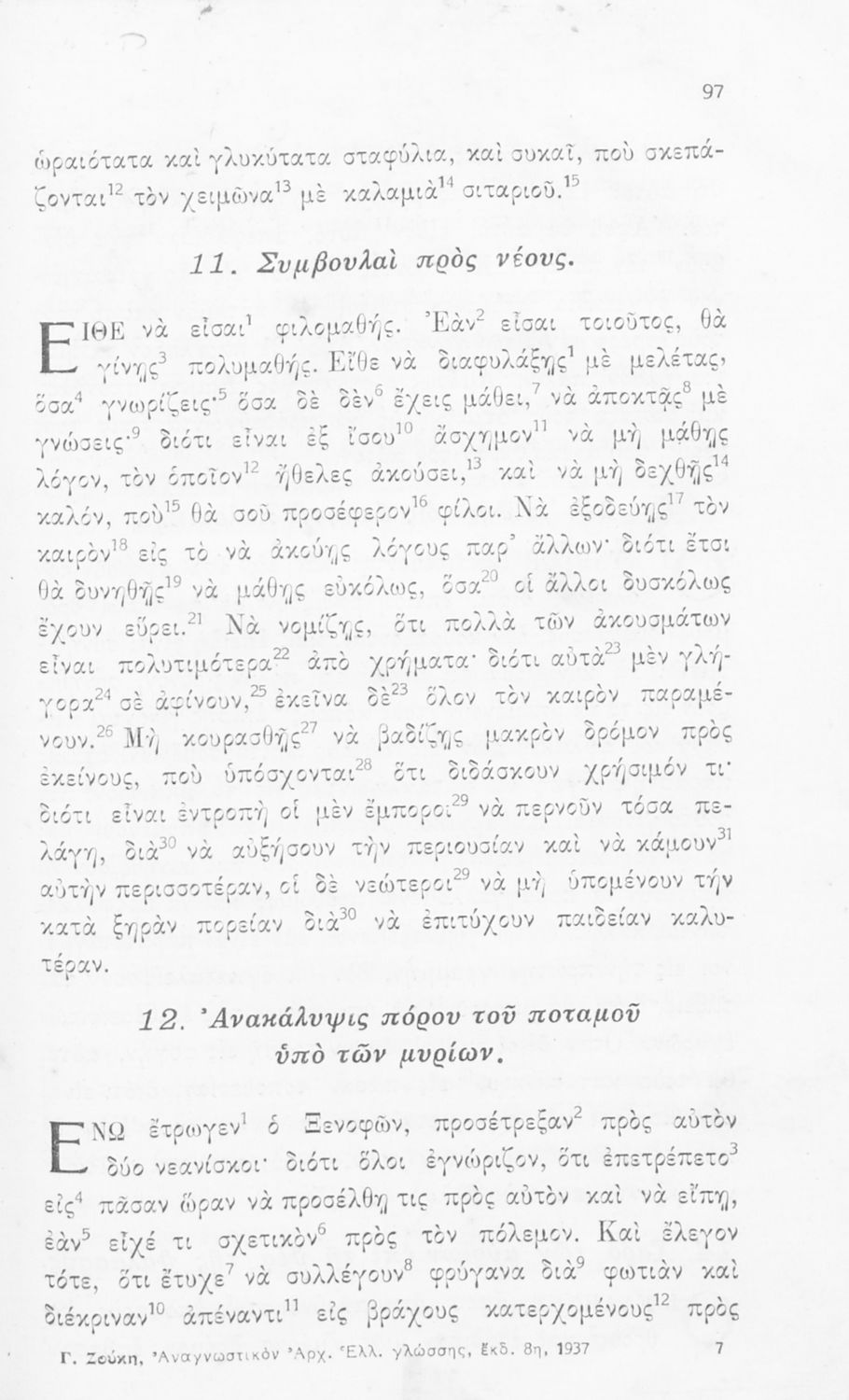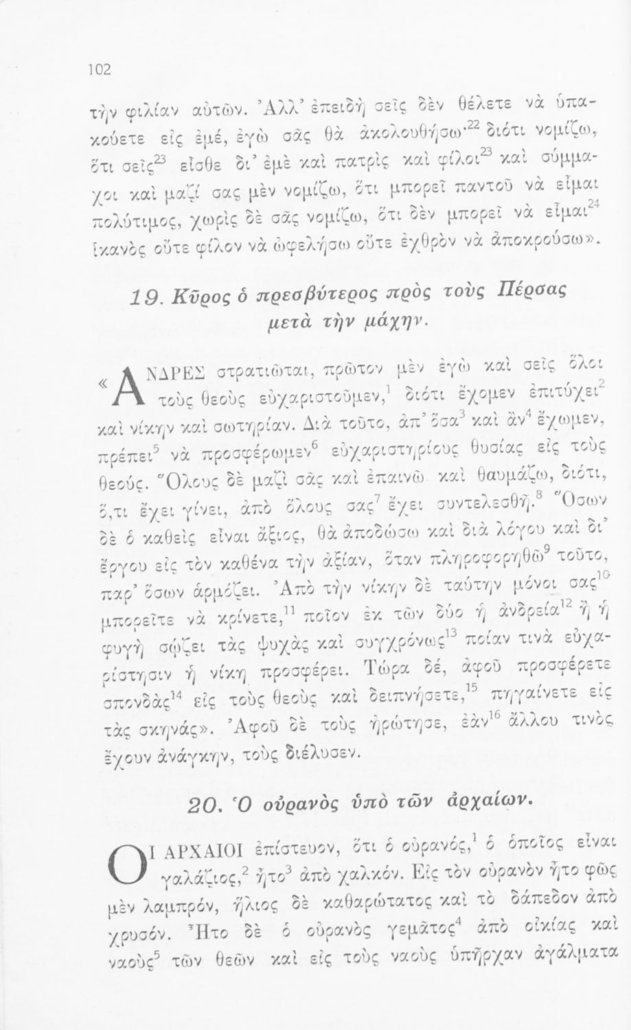 Σχολικό εγχειρίδιο Αρχαίων Ελληνικών Γυμνασίου που περιέχει κείμενα βασισμένα στην αρχαία ελληνική ιστορία και μυθολογία και γραμματικές, συντακτικές και ετυμολογικές παρατηρήσεις.