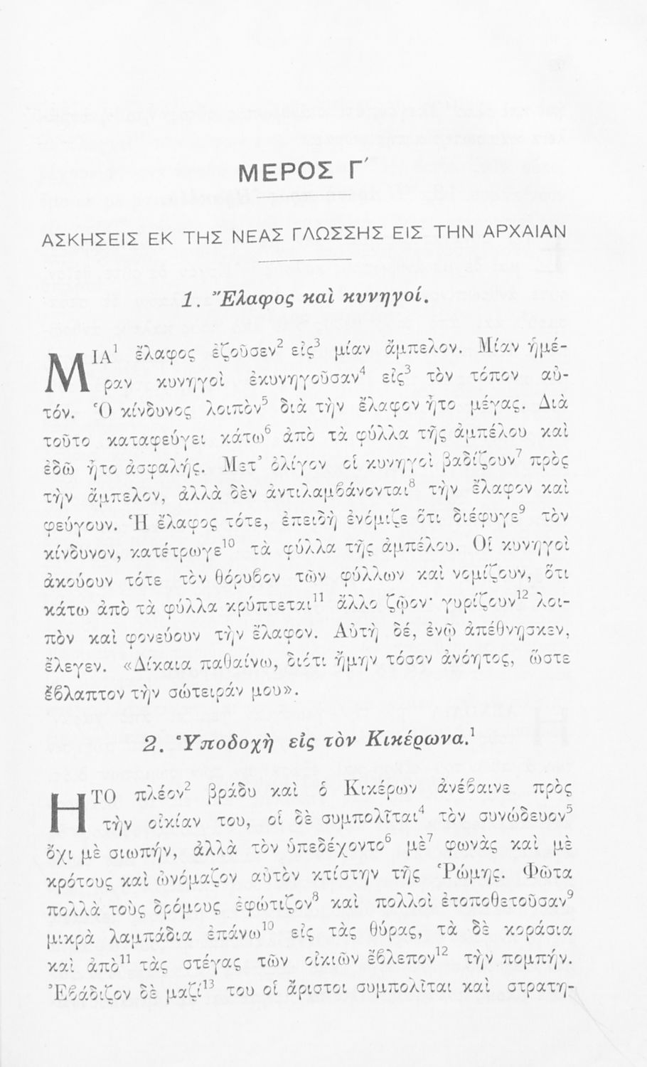 Σχολικό εγχειρίδιο Αρχαίων Ελληνικών για τις Α΄ και Β΄ τάξεις των Εξαταξίων Γυμνασίων που περιλαμβάνει σύντομα κείμενα εμπνευσμένα από την αρχαία ελληνική ιστορία και μυθολογία που χρησιμοποιούνται για τη διδασκαλία γραμματικών και συντακτικών φαινομένων καθώς και ερμηνευτικές σημειώσεις.