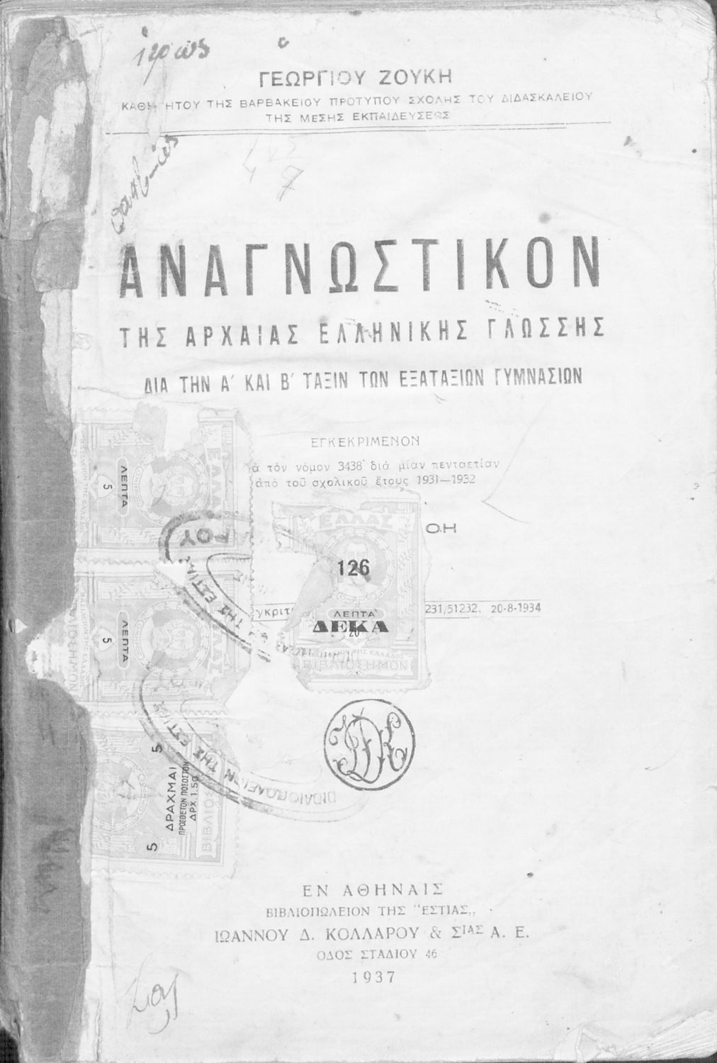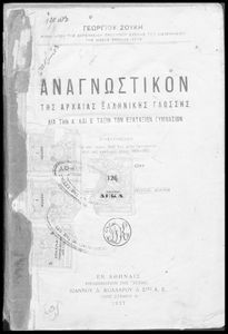 Κωδικός αναγνώρισης: 02-01274 Τίτλος: Αναγνωστικόν της αρχαίας ελληνικής γλώσσης δια την Α΄ και Β΄ τάξιν των Εξαταξίων Γυμνασίων Συγγραφέας: Γεώργιος Ζούκης Μέγεθος και υπόστρωμα: Σχολικό εγχειρίδιο, 142 σελίδες. Σκίτσα (ασπρόμαυρα). |