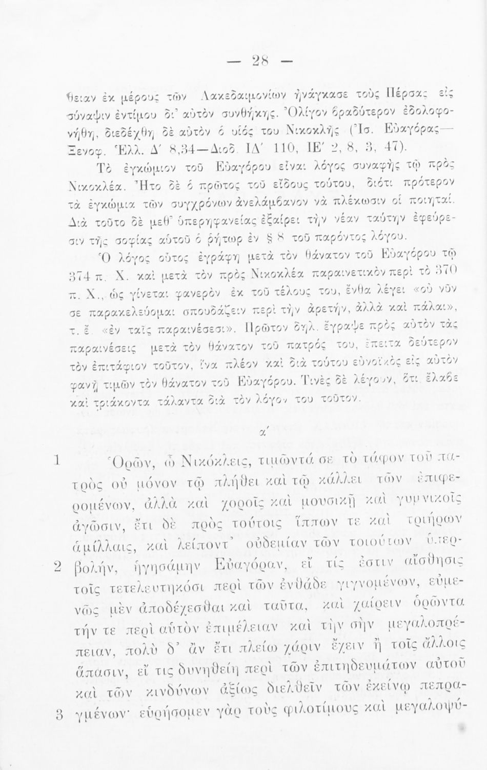 Σχολικό εγχειρίδιο Αρχαίων Ελληνικών Γ΄ Γυμνασίου που περιλαμβάνει σύντομο βιογραφικό σημείωμα του Ισοκράτη, τους Λόγους του Προς Νικοκλέα και Ευαγόρας και ερμηνευτικά και λεξιλογικά σχόλια.