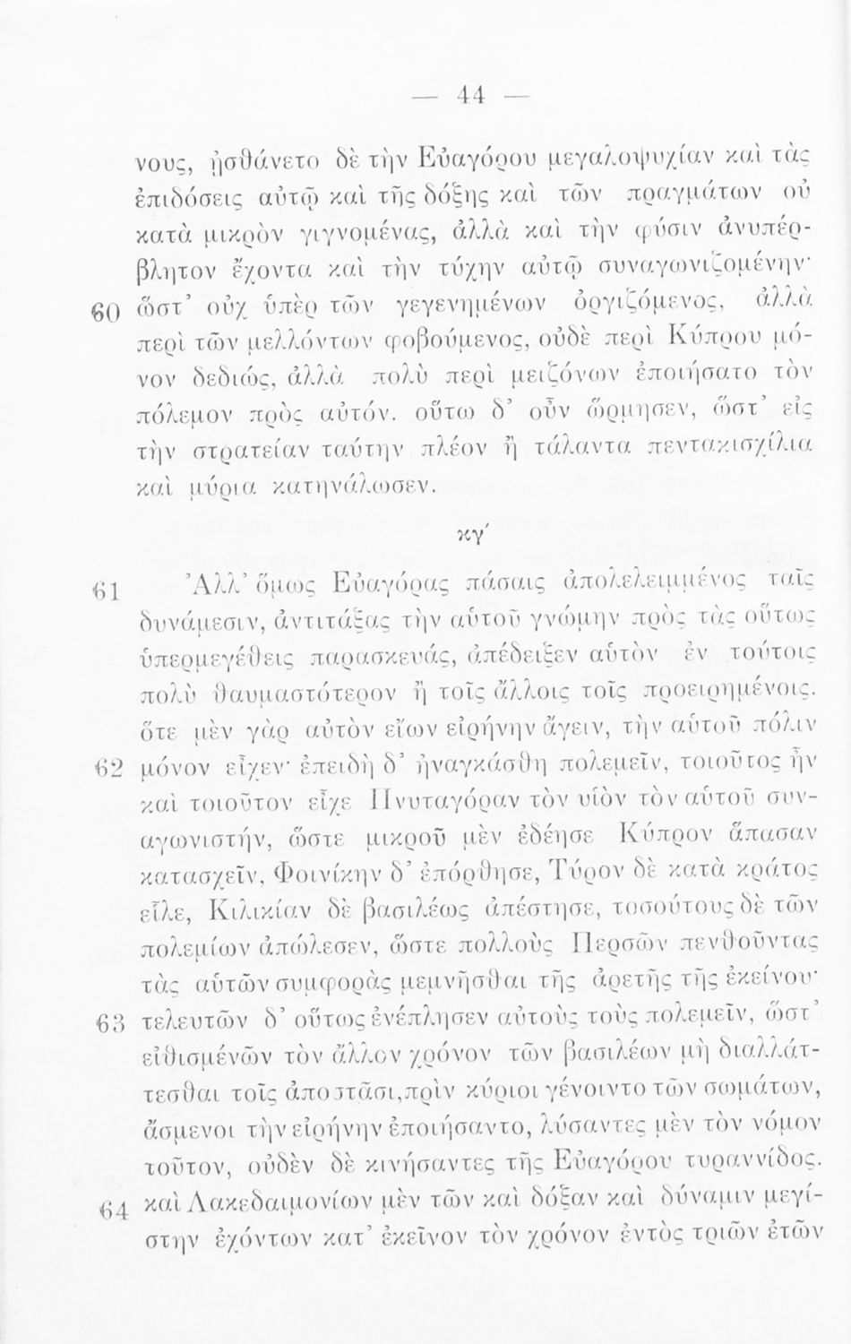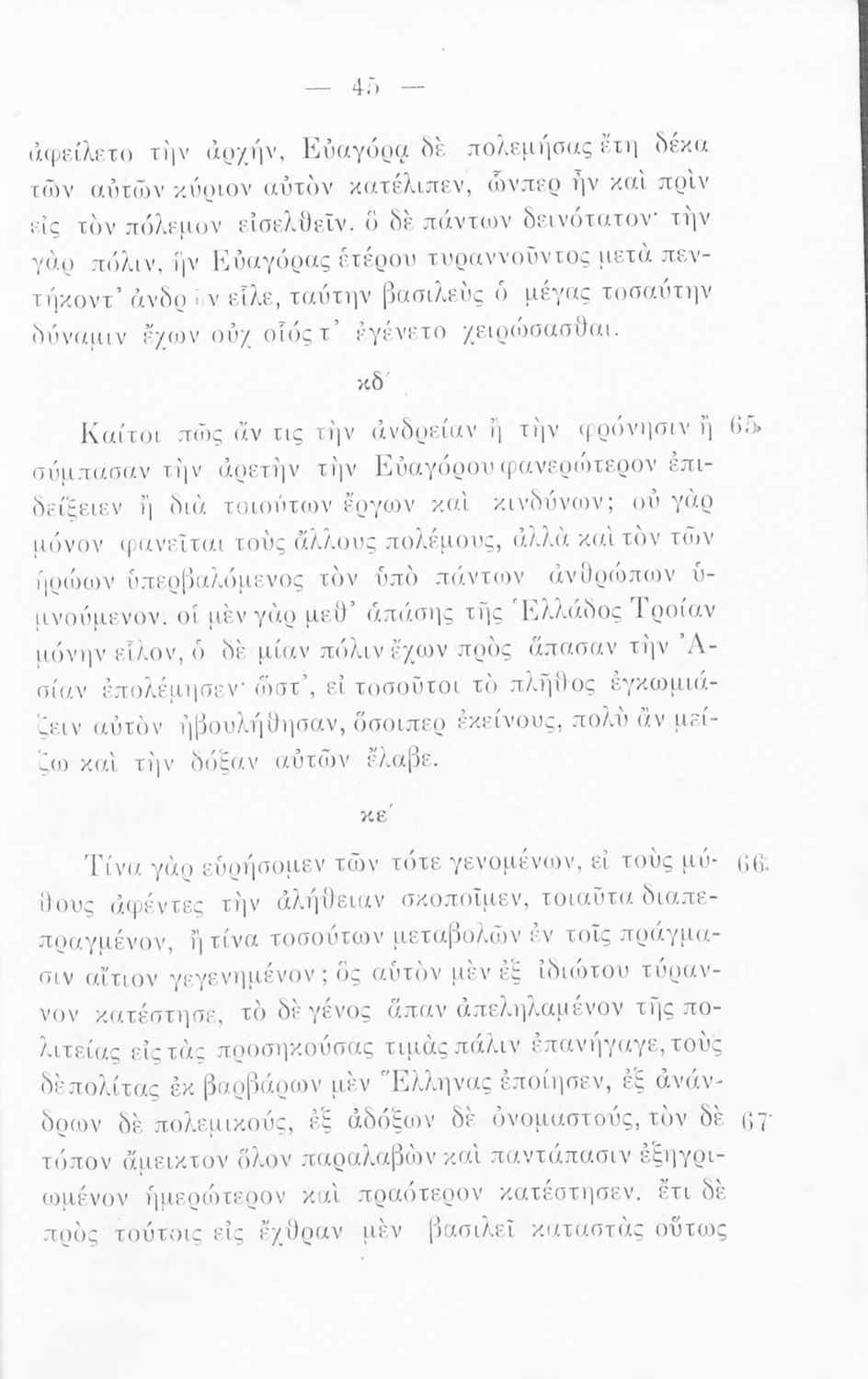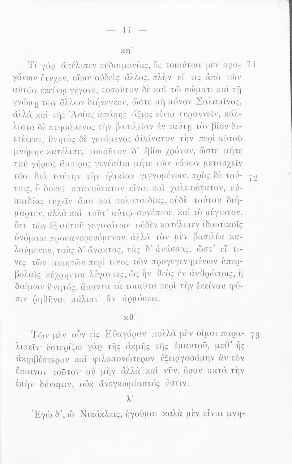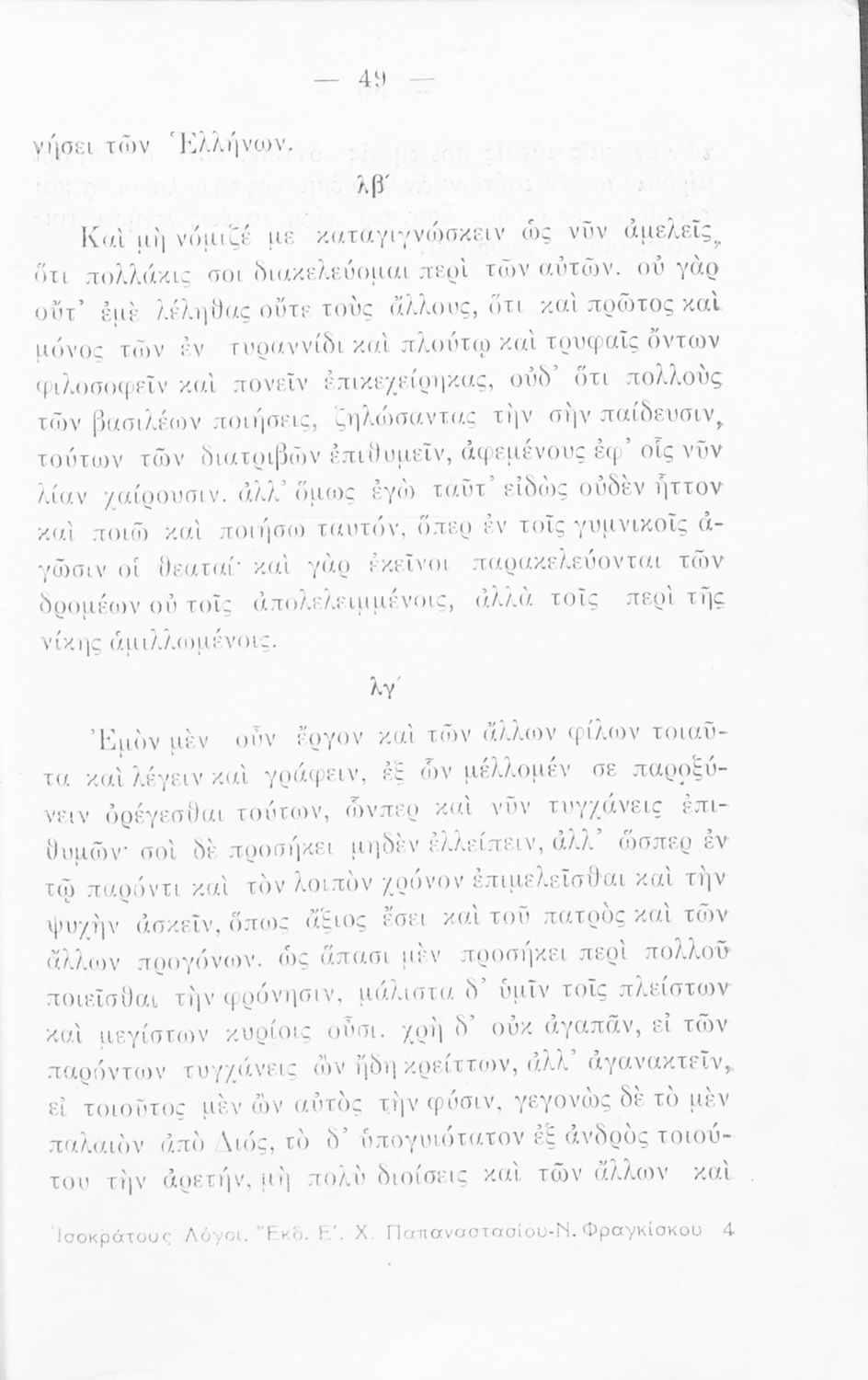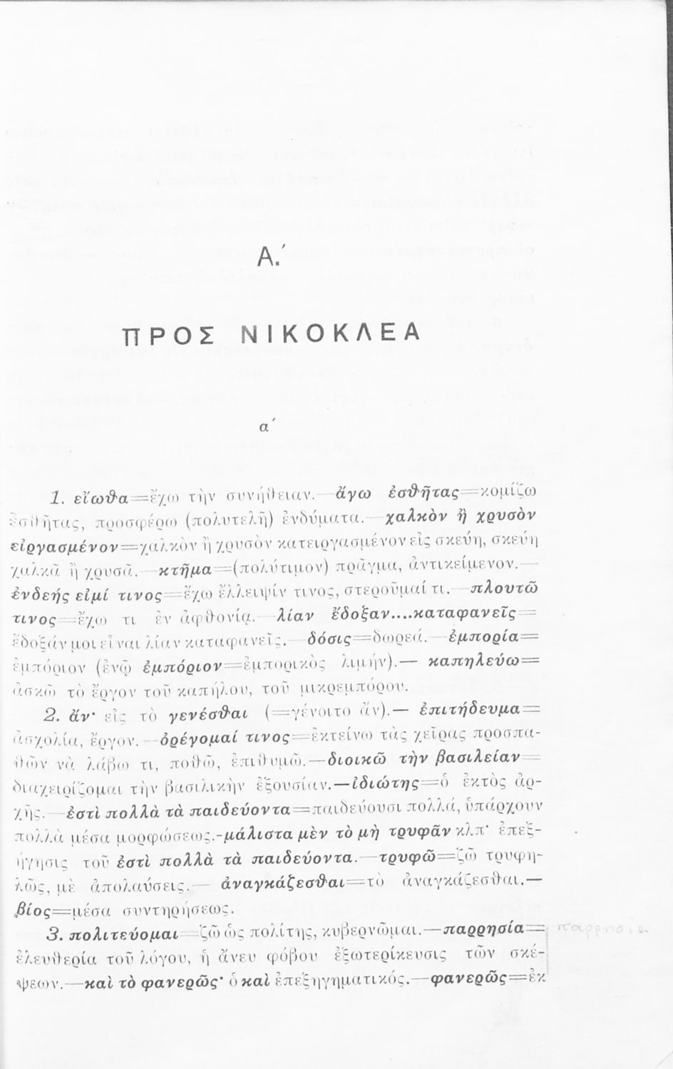 Σχολικό εγχειρίδιο Αρχαίων Ελληνικών Γ΄ Γυμνασίου που περιλαμβάνει σύντομο βιογραφικό σημείωμα του Ισοκράτη, τους Λόγους του Προς Νικοκλέα και Ευαγόρας και ερμηνευτικά και λεξιλογικά σχόλια.