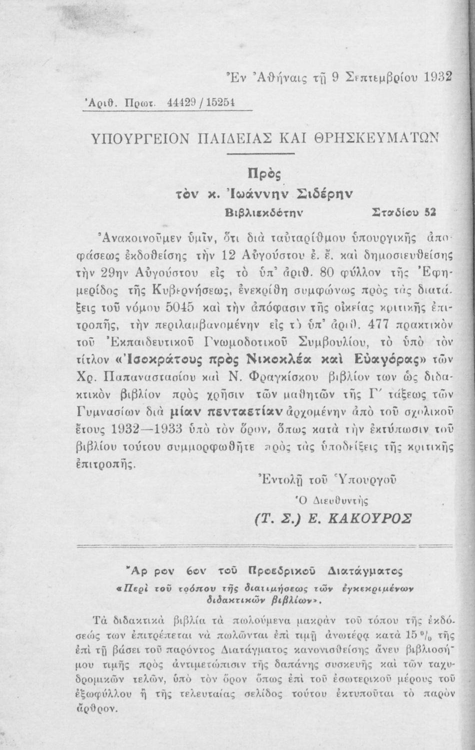 Εκδότης: Ιωάννης Ν. Σιδέρης Έτος έκδοσης: 1937 Τόπος έκδοσης: Αθήνα Έκδοση: 5η Υπουργική απόφαση / Σύμβαση: 44429/15254/9-9-1932 Έτος έγκρισης: 1932 |