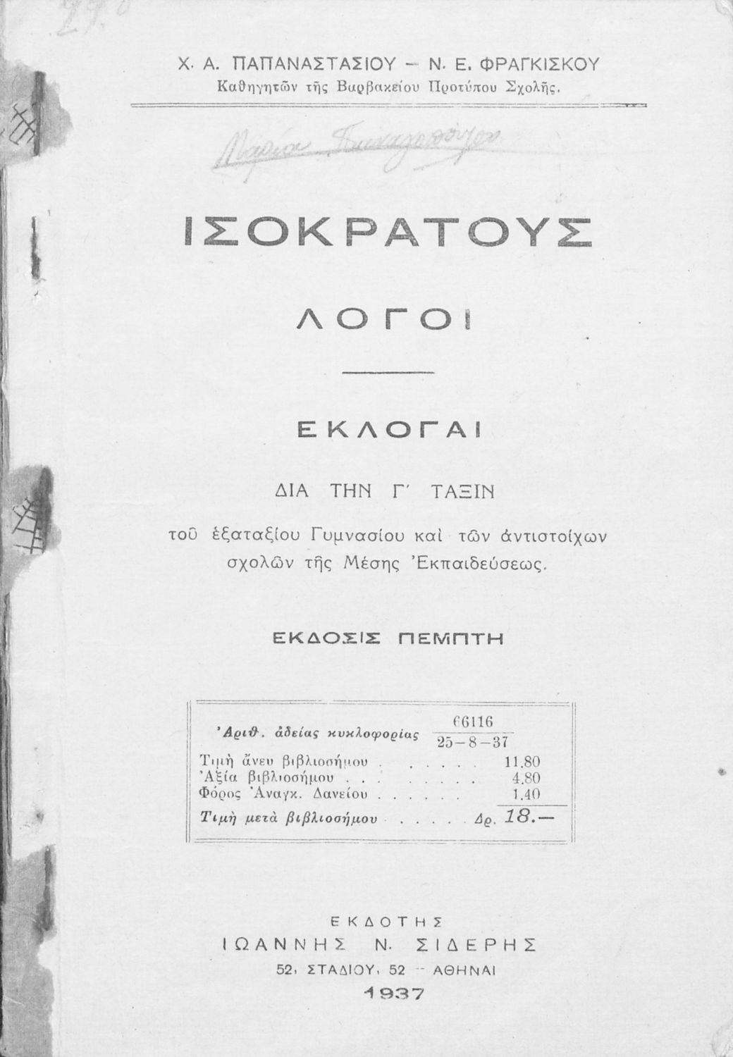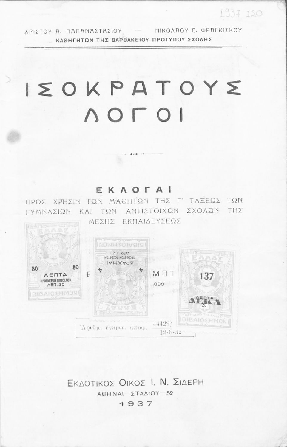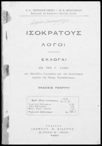 Κωδικός αναγνώρισης: 02-01277 Τίτλος: Ισοκράτους Λόγοι Εκλογαί δια την Γ΄ τάξιν του Εξαταξίου Γυμνασίου και των αντίστοιχων σχολών της Μέσης Εκπαίδευσης. Συγγραφέας: Ισοκράτης, Χρήστος Α. Παπαναστασίου, Νικόλαος Ε. Φραγκίσκος (σχόλια) Μέγεθος και υπόστρωμα: Σχολικό εγχειρίδιο, 88 σελίδες. Σκίτσα (ασπρόμαυρα). |