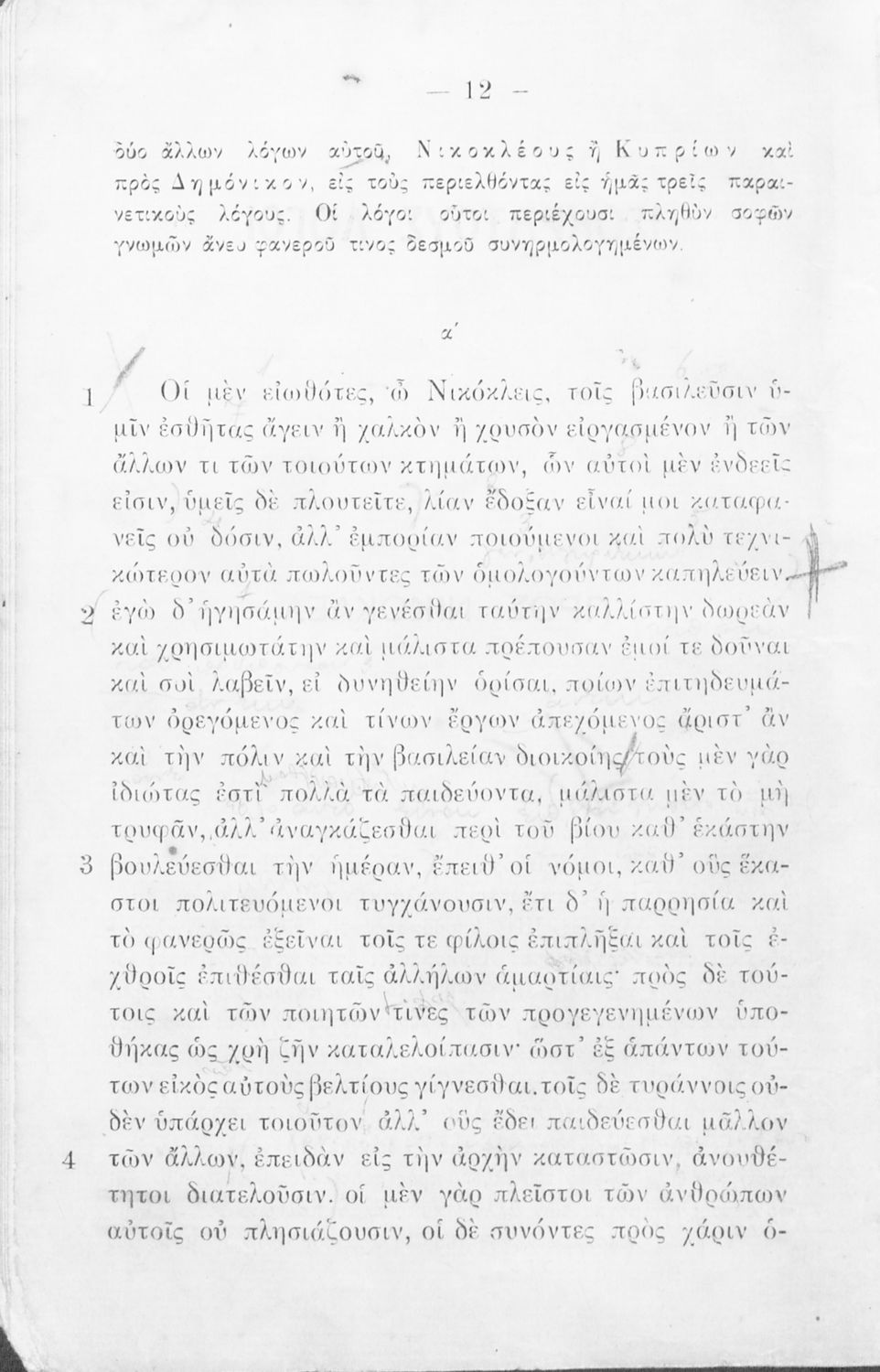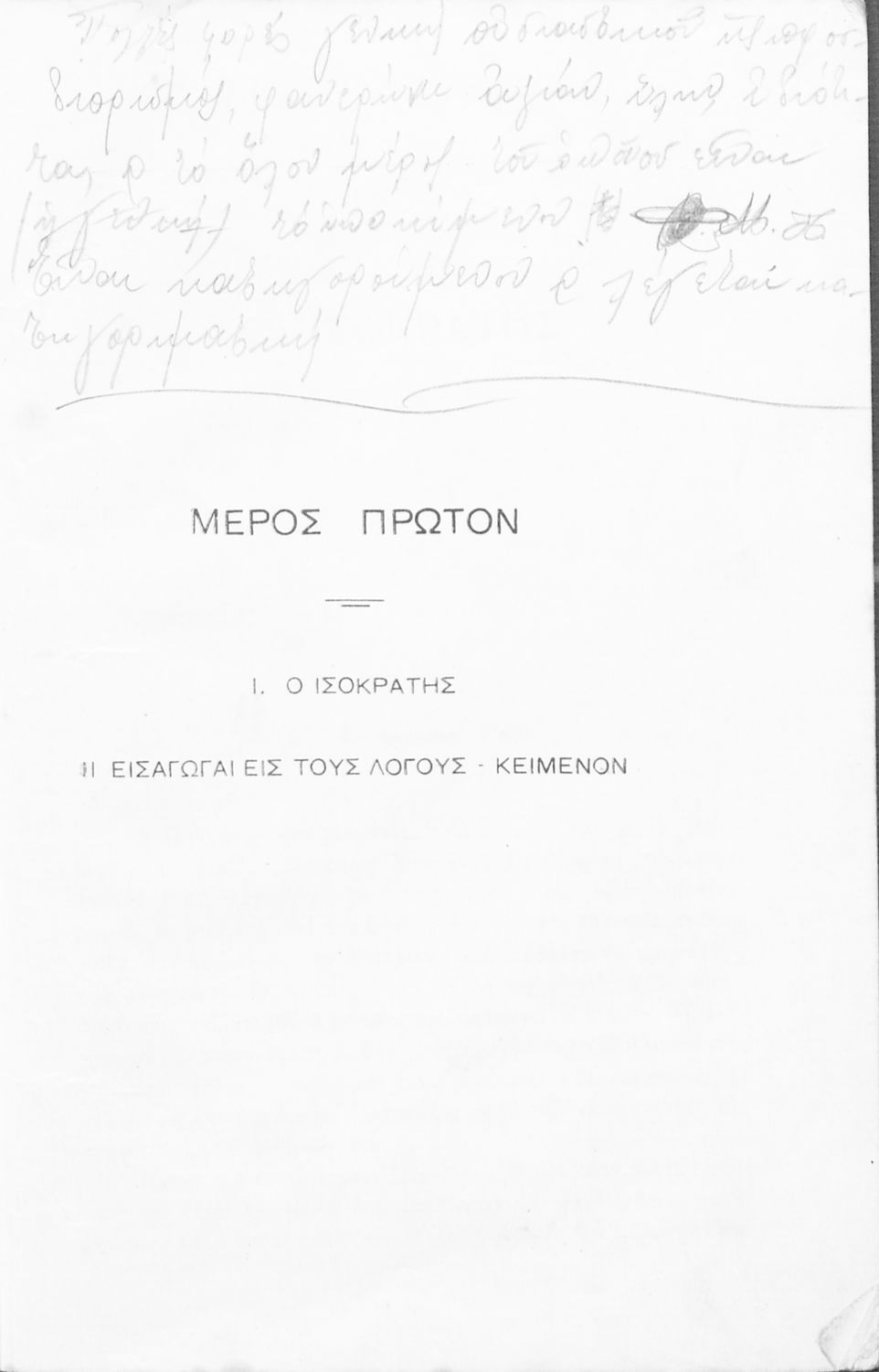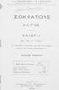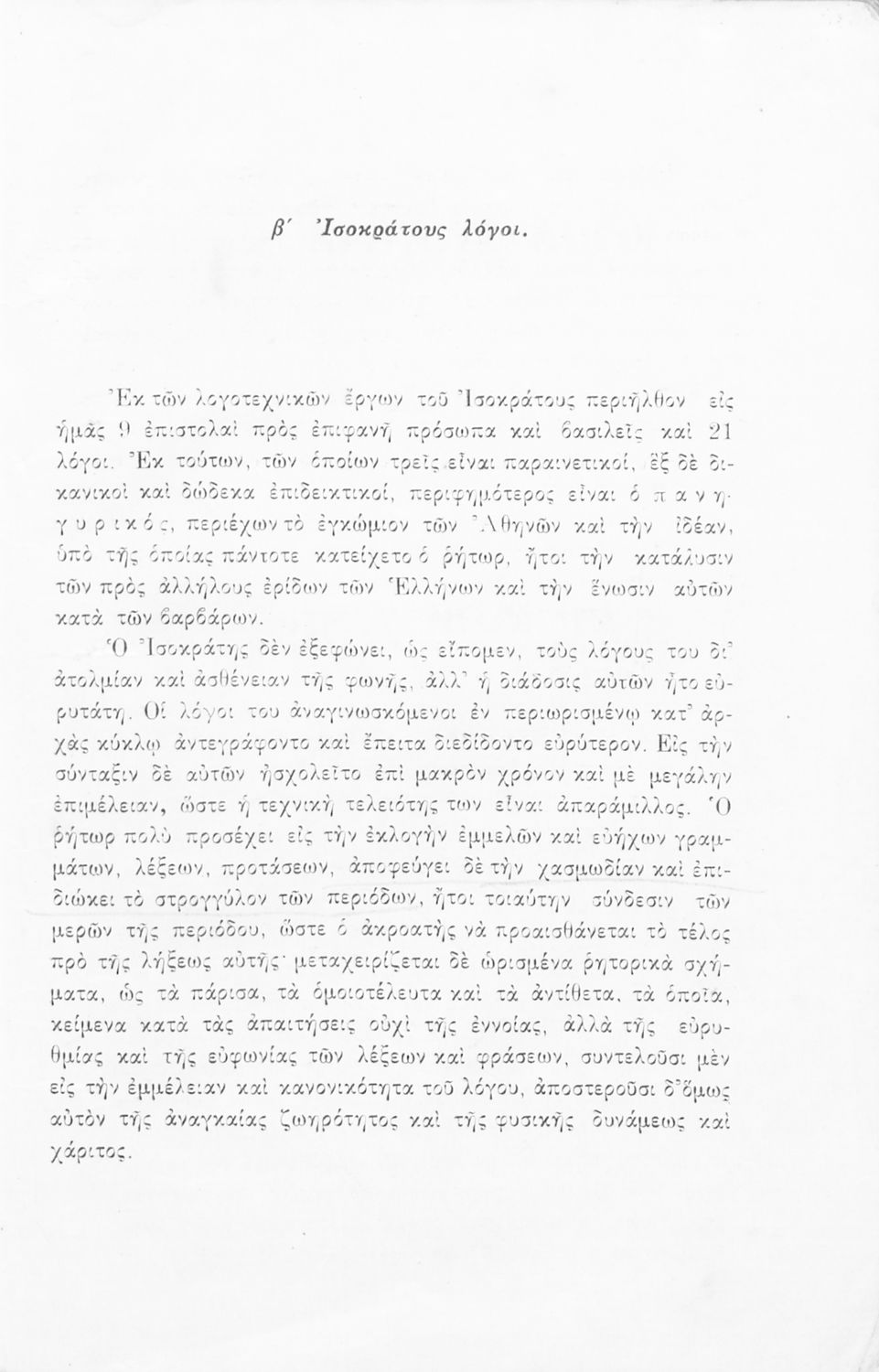 Βαθμίδα εκπαίδευσης: Δευτεροβάθμια Τάξη: Γ' Γυμνασίου Μάθημα: Αρχαία Ελληνικά Γλώσσα: Καθαρεύουσα Παρουσίαση περιεχομένου: Σχολικό εγχειρίδιο Αρχαίων Ελληνικών Γ΄ Γυμνασίου που περιλαμβάνει σύντομο βιογραφικό σημείωμα του Ισοκράτη, τους Λόγους του Προς Νικοκλέα και Ευαγόρας και ερμηνευτικά και λεξιλογικά σχόλια. |