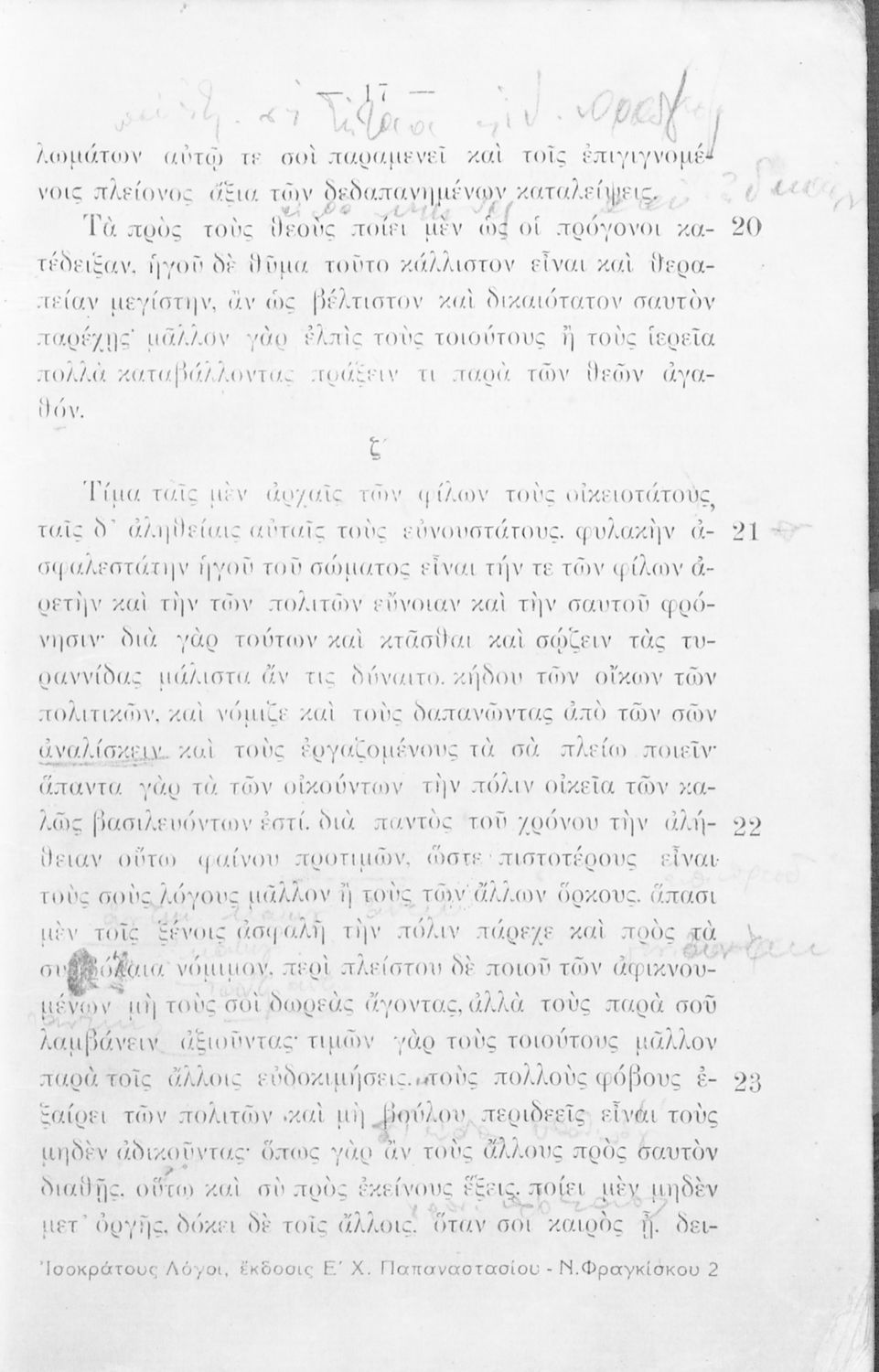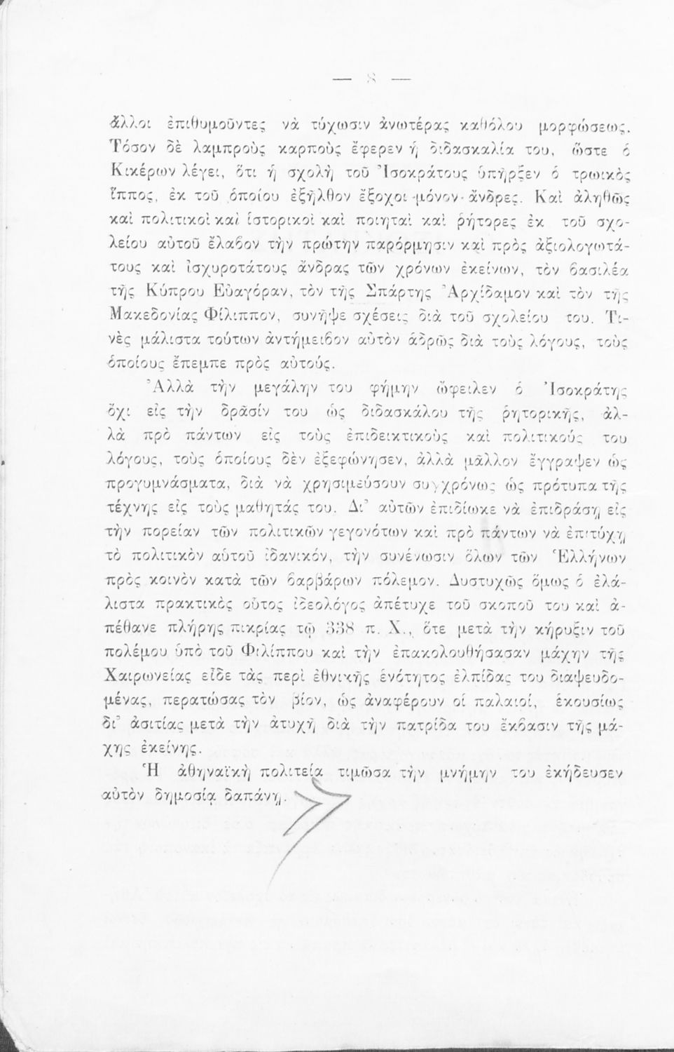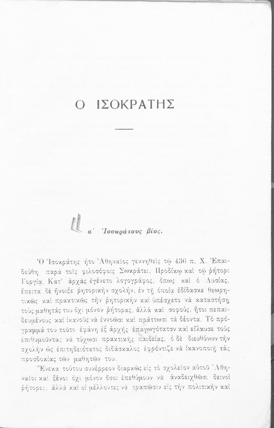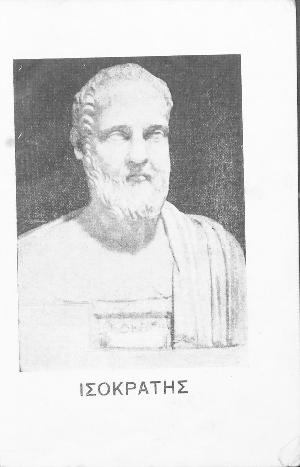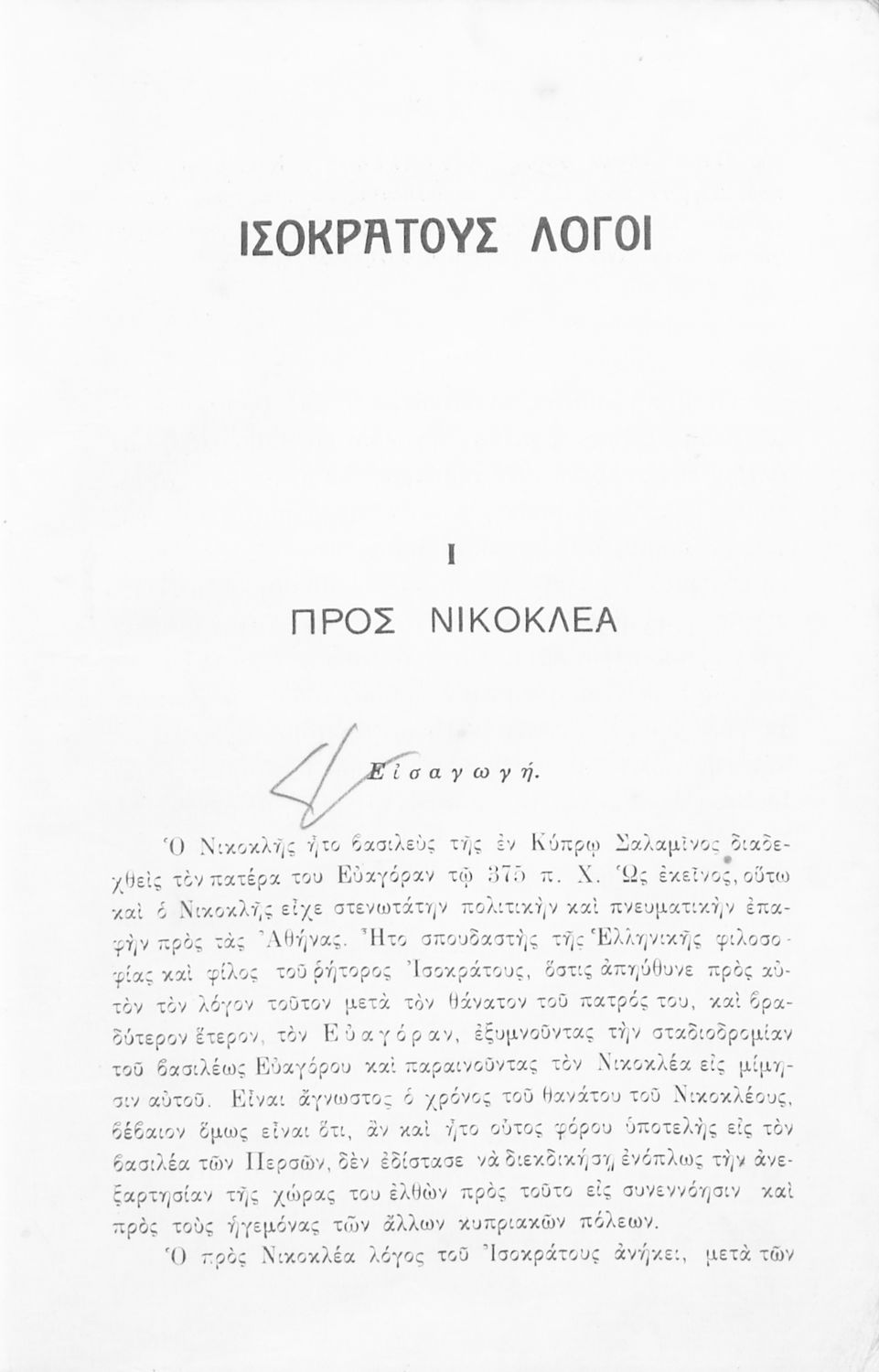 Σχολικό εγχειρίδιο Αρχαίων Ελληνικών Γ΄ Γυμνασίου που περιλαμβάνει σύντομο βιογραφικό σημείωμα του Ισοκράτη, τους Λόγους του Προς Νικοκλέα και Ευαγόρας και ερμηνευτικά και λεξιλογικά σχόλια.
