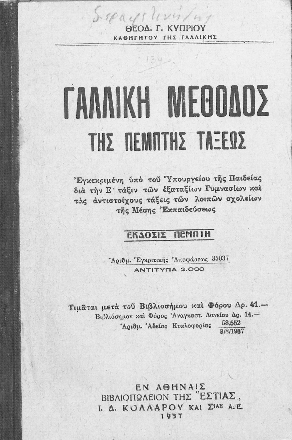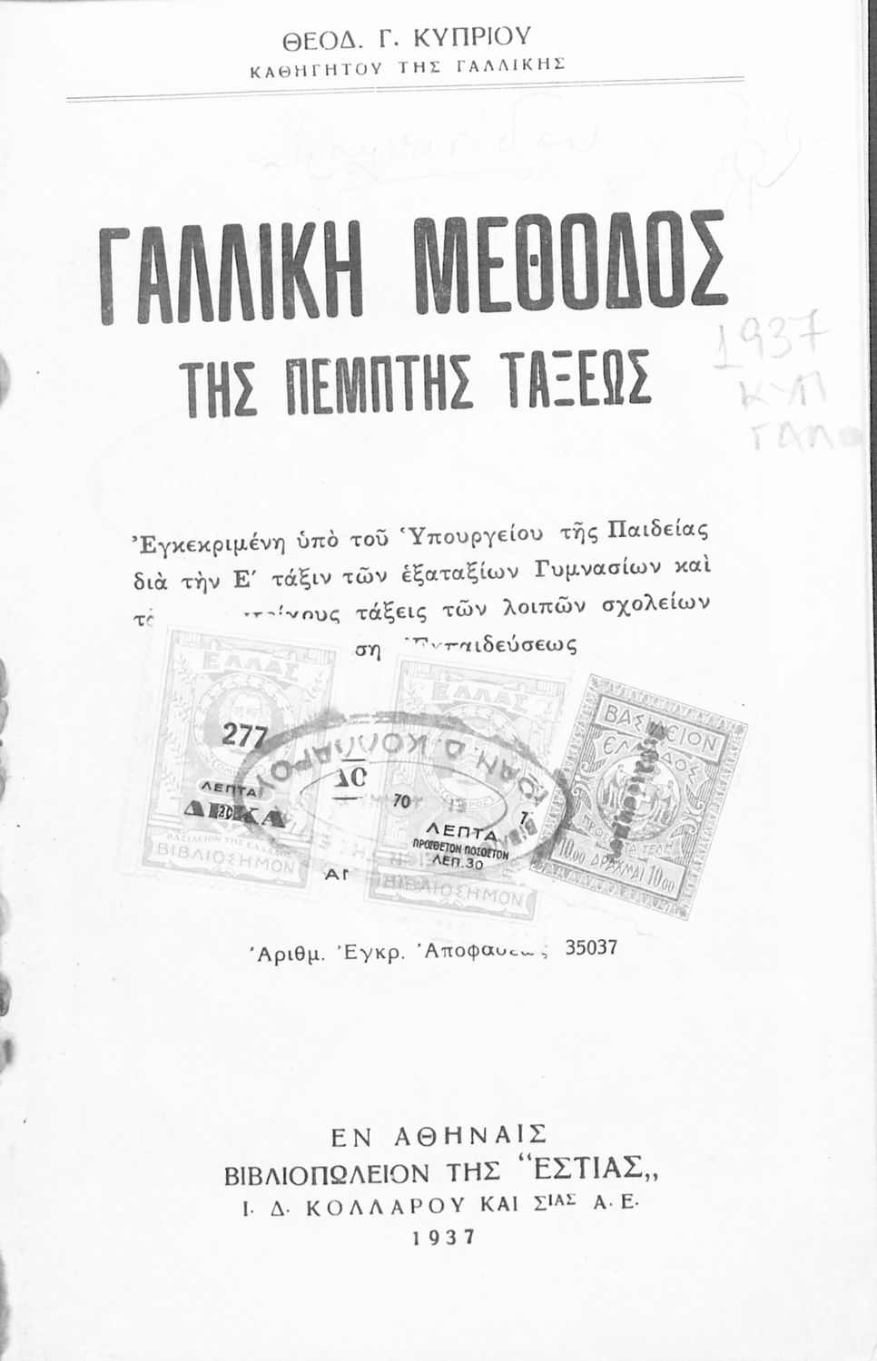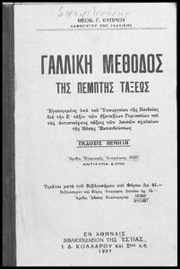 Τίτλος: Γαλλική μέθοδος της πέμπτης τάξεως εγκεκριμένη υπό του Υπουργείου της Παιδείας δια την Ε΄ τάξιν των Εξαταξίων Γυμνασίων και τας αντιστοίχους τάξεις των Εκπαιδεύσεως
