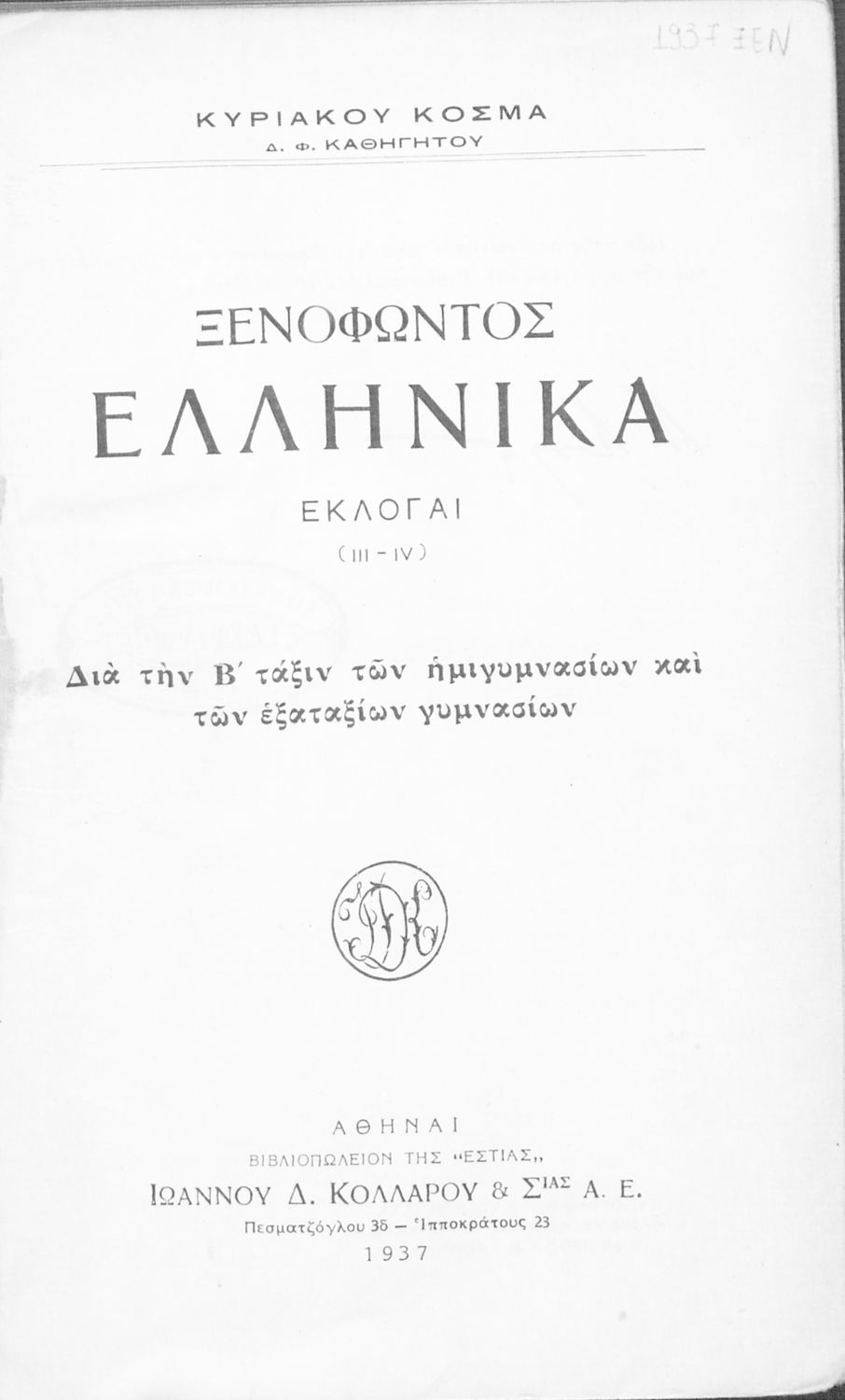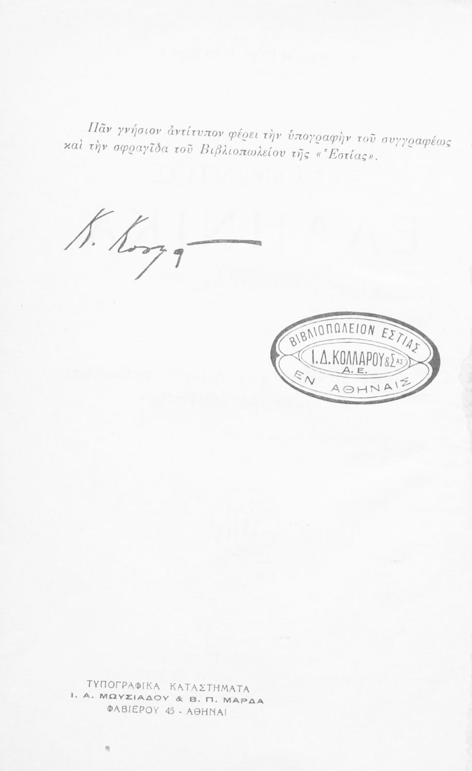 Εκδότης: Ιωάννης Δ. Κολλάρος και ΣΙΑ ΑΕ Έτος έκδοσης: 1937 Τόπος έκδοσης: Αθήνα |