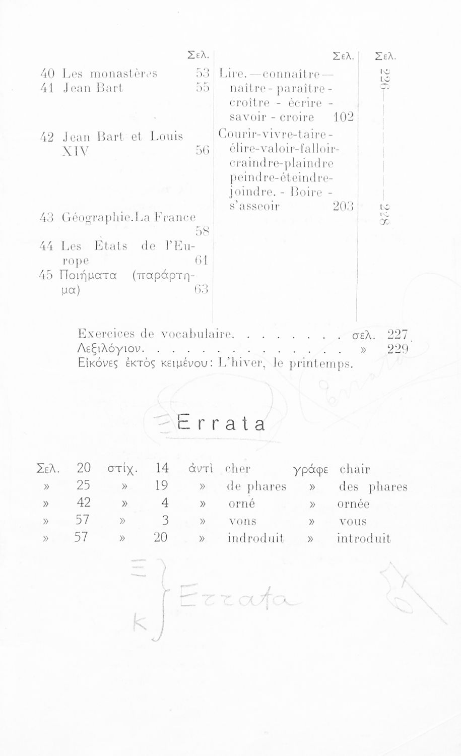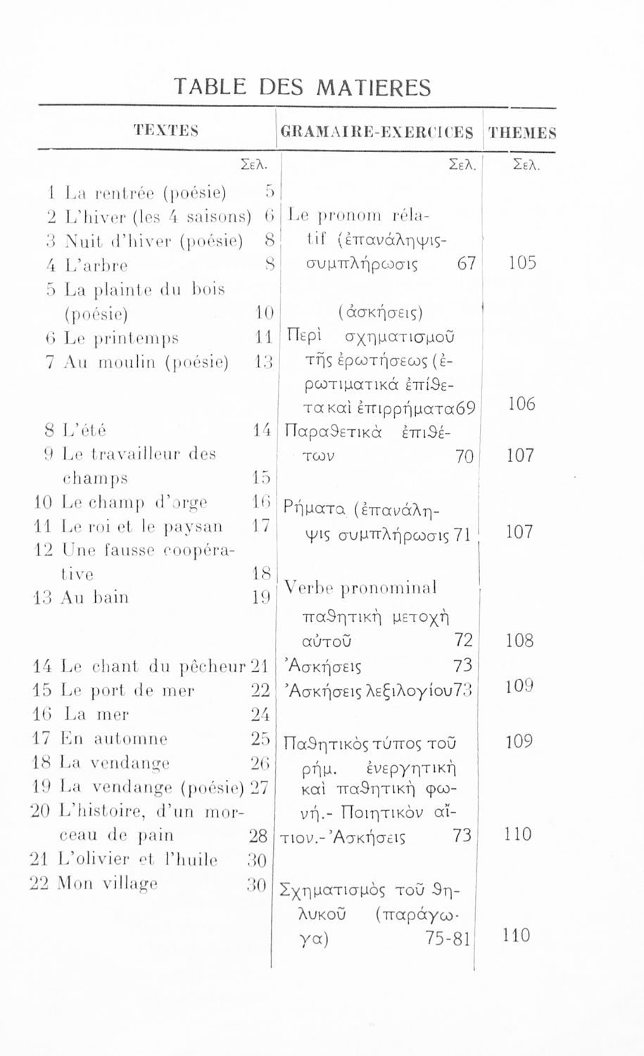 Σχολικό εγχειρίδιο Γαλλικών Γυμνασίου που περιλαμβάνει κείμενα στα γαλλικά και ελληνικά, θεωρία, λεξιλόγιο και βιογραφικά σημειώματα των συγγραφέων. Ο συγγραφέας ήταν καθηγητής της Βαρβακείου πρότυπης σχολής