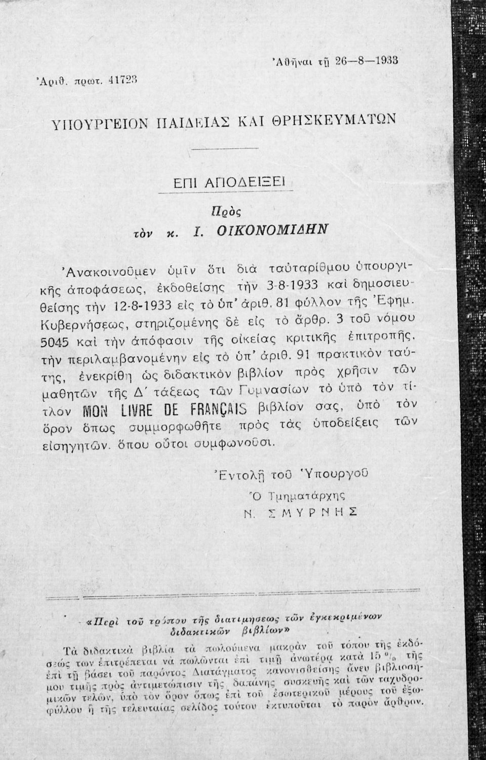 Τίτλος: Mon livre de francais, Βιβλίον 3ον διά την Δ΄ τάξιν του Γυμνασίου (Τρίτον έτος της διδασκαλίας των Γαλλικών)