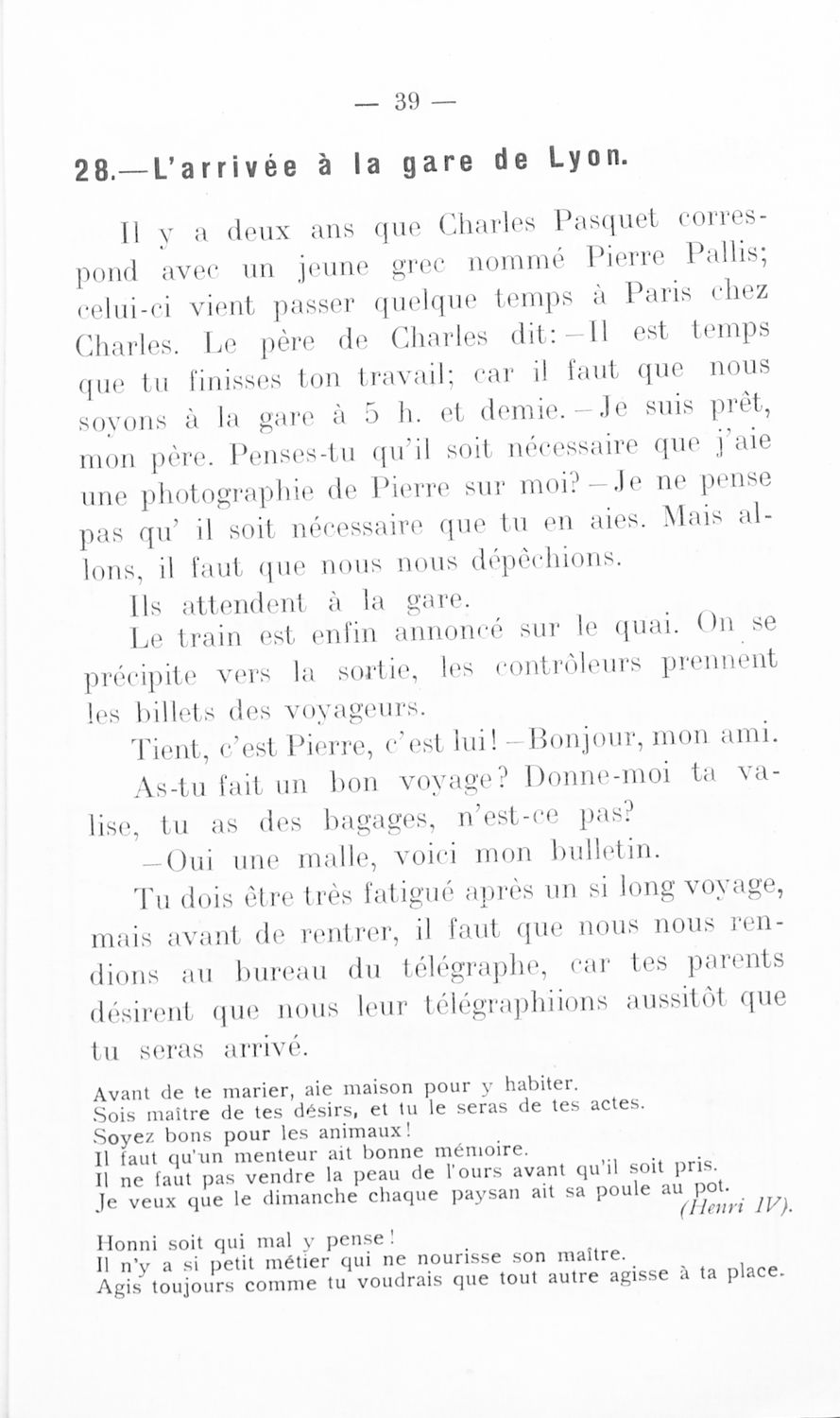 Σχολικό εγχειρίδιο Γαλλικών Γυμνασίου που περιλαμβάνει κείμενα στα γαλλικά και ελληνικά, θεωρία, λεξιλόγιο και βιογραφικά σημειώματα των συγγραφέων. Ο συγγραφέας ήταν καθηγητής της Βαρβακείου πρότυπης σχολής