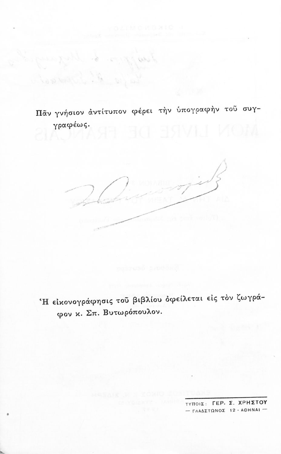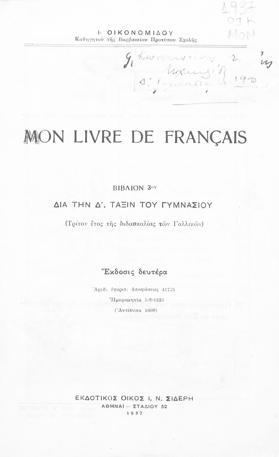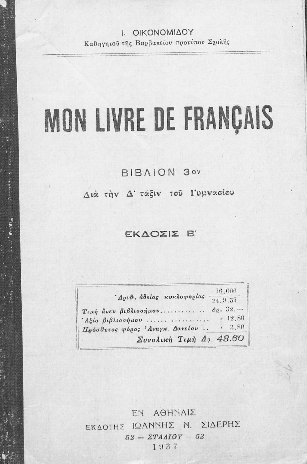 Κωδικός αναγνώρισης: 02-01290 Τίτλος: Mon livre de francais, Βιβλίον 3ον διά την Δ΄ τάξιν του Γυμνασίου (Τρίτον έτος της διδασκαλίας των Γαλλικών) Συγγραφέας: Ι. Οικονομίδης Εικονογράφος: Σπ. Βυτωρόπουλος Μέγεθος και υπόστρωμα: Σχολικό εγχειρίδιο, σκληρό εξώφυλλο, 148 σελίδες. Σκίτσα (ασπρόμαυρα). |
