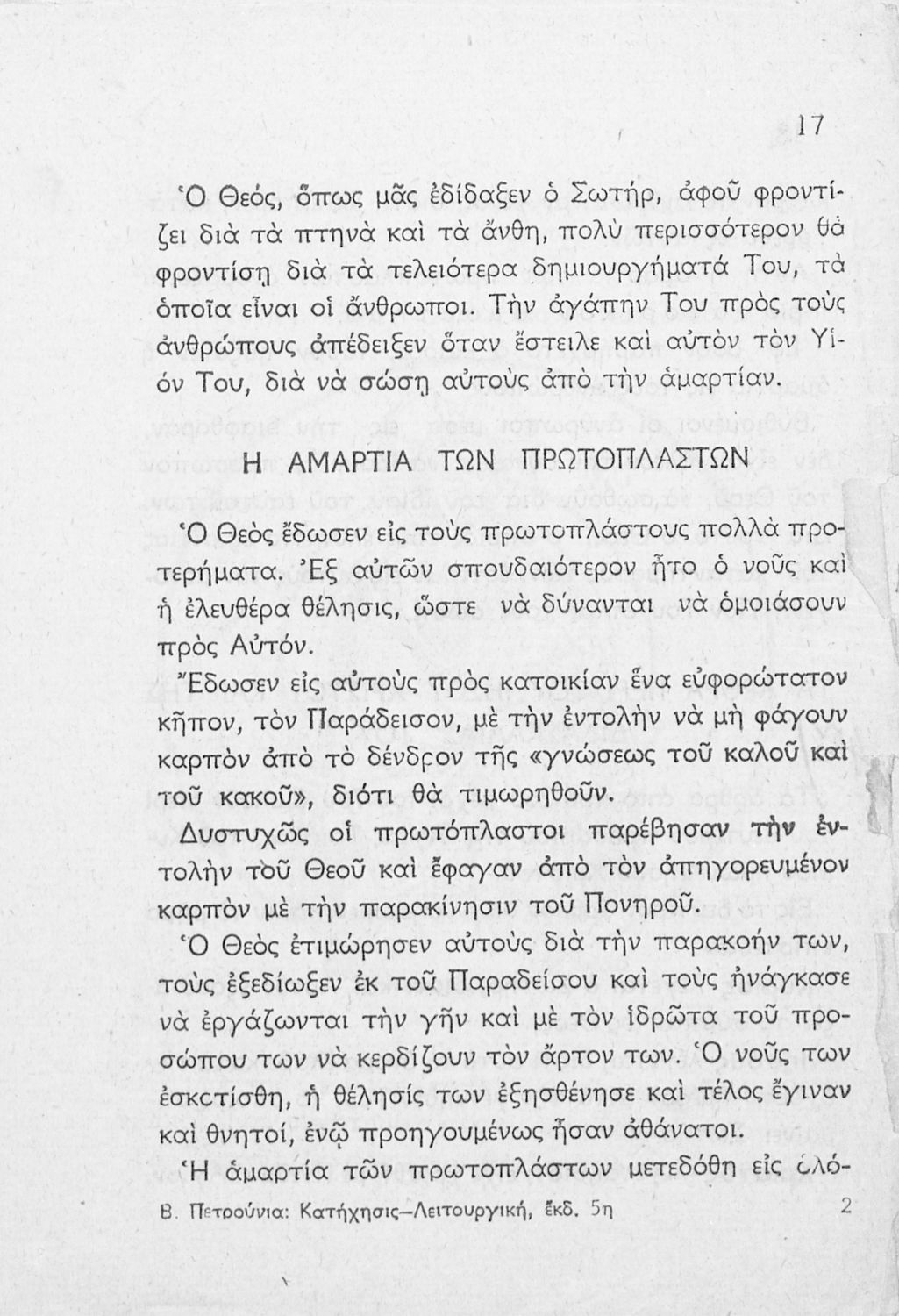 Κωδικός αναγνώρισης: 02-01296 Τίτλος: Κατήχησις-Λειτουργική. ΣΤ΄ Δημοτικού Συγγραφέας: Βασίλειος Ε. Πετρούνιας Μέγεθος και υπόστρωμα: Μαθητικό βοήθημα, μαλακό εξώφυλλο, 116 σελίδες. Εικόνες (ασπρόμαυρες), σκίτσα (ασπρόμαυρα). |