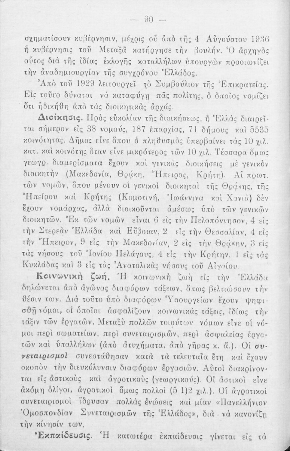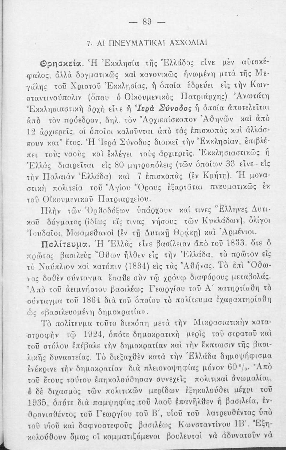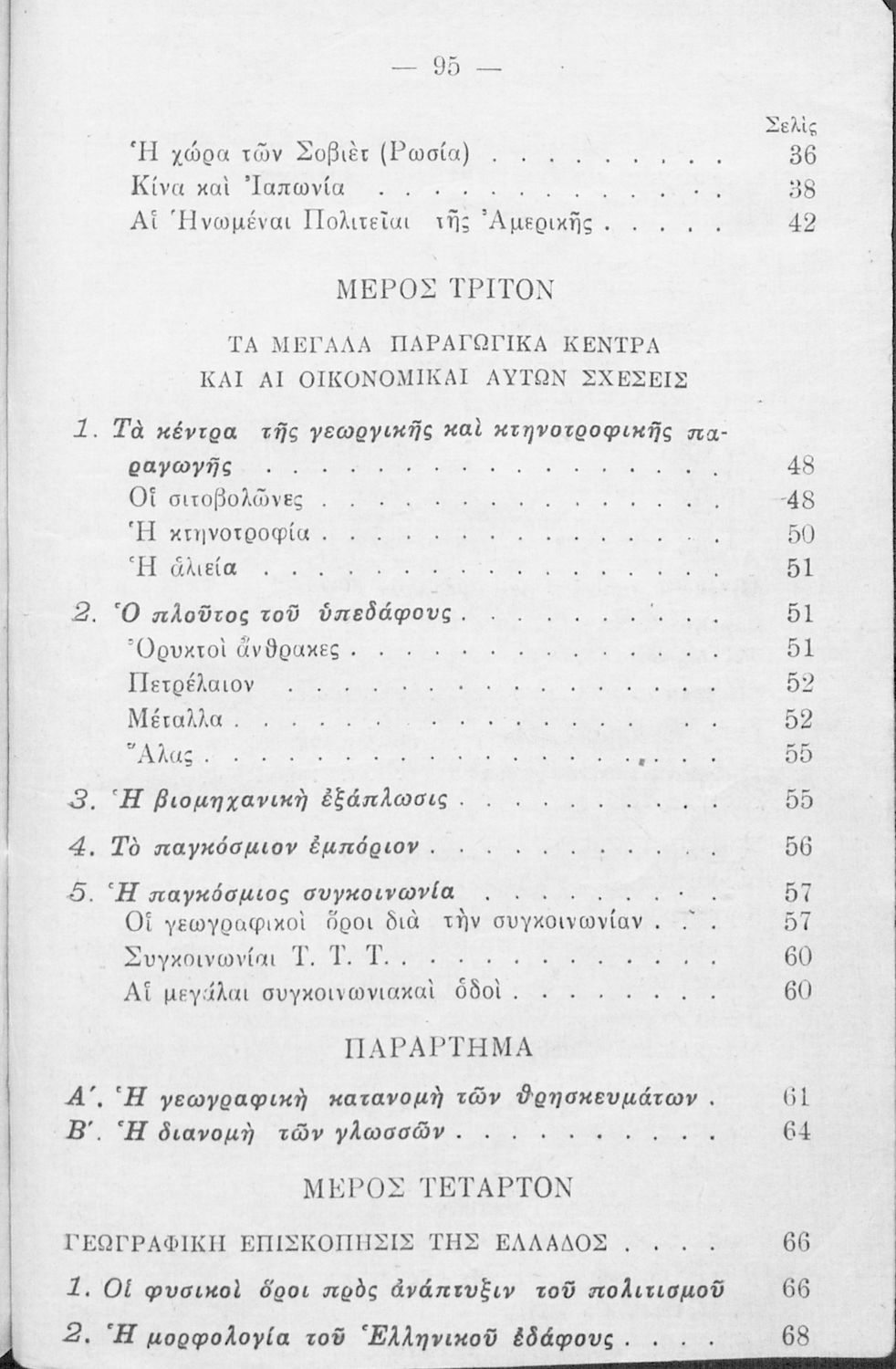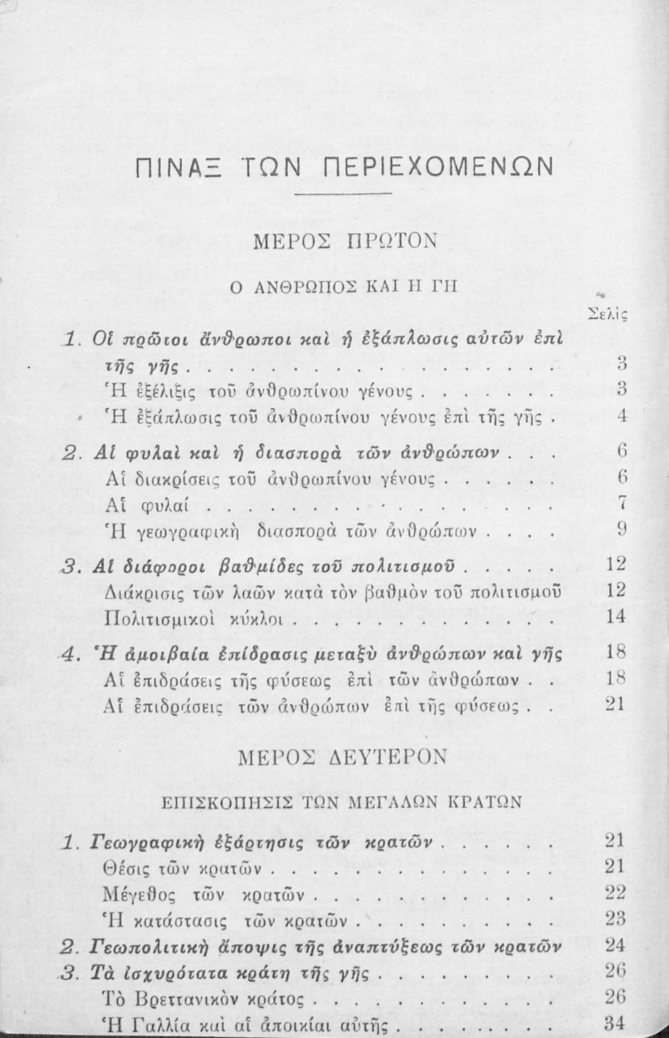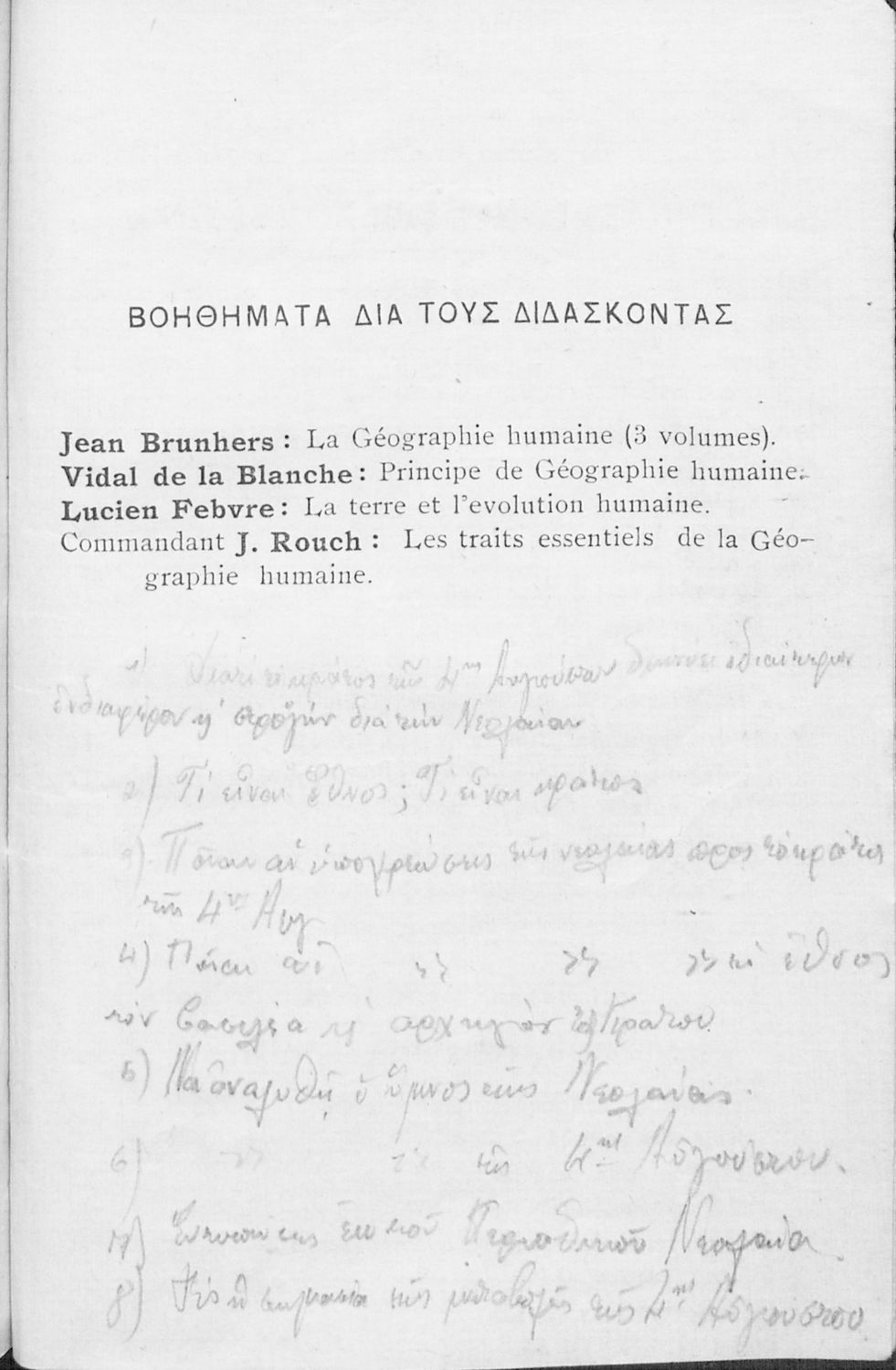 Πρόκειται για σχολικό εγχειρίδιο το οποίο μέσα από πλούσια εικονογράφηση προοριζόταν για τη διδασκαλία του μαθήματος της Ανθρωπογεωγραφίας της Ελλάδας στο Γυμνάσιο και τα πρακτικά Λύκεια. Φέρει κάποιες προσωπικές σημειώσεις του μαθητή.
