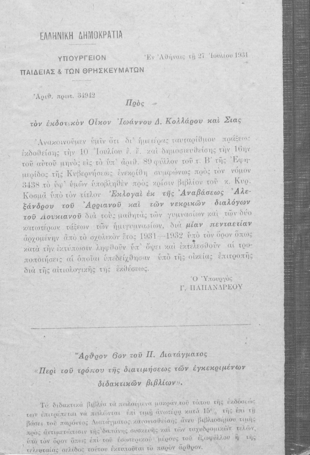 Εκδότης: Ιωάννης Δ. Κολλάρος και ΣΙΑ ΑΕ Έτος έκδοσης: 1936 Τόπος έκδοσης: Αθήνα Έκδοση: 5η Υπουργική απόφαση / Σύμβαση: 34942/27-7-1931 |