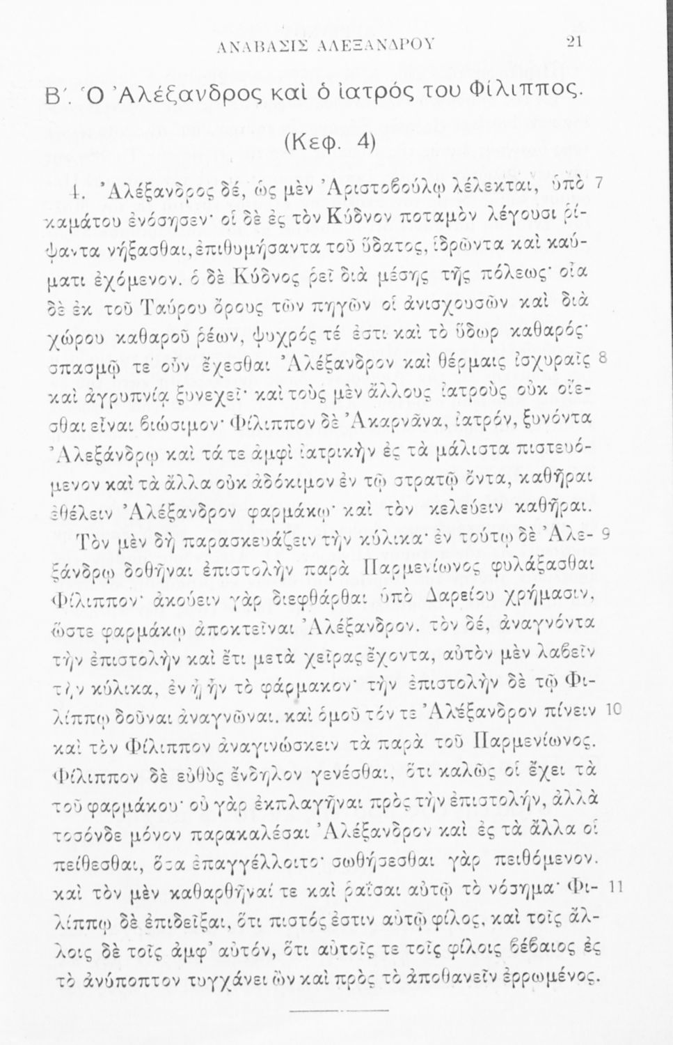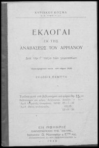 Βαθμίδα εκπαίδευσης: Δευτεροβάθμια Τάξη: Γ' Γυμνασίου Μάθημα: Αρχαία Ελληνικά Γλώσσα: Καθαρεύουσα Παρουσίαση περιεχομένου: Σχολικό εγχειρίδιο Αρχαίων Ελληνικών Γ΄ Γυμνασίου που περιλαμβάνει σύντομο βιογραφικό σημείωμα του Αρριανού, εισαγωγή στο έργο, αποσπάσματα από το πρώτο και δεύτερο βιβλίο της Ανάβασης του Αλέξανδρου και ετυμολογικές σημειώσεις |