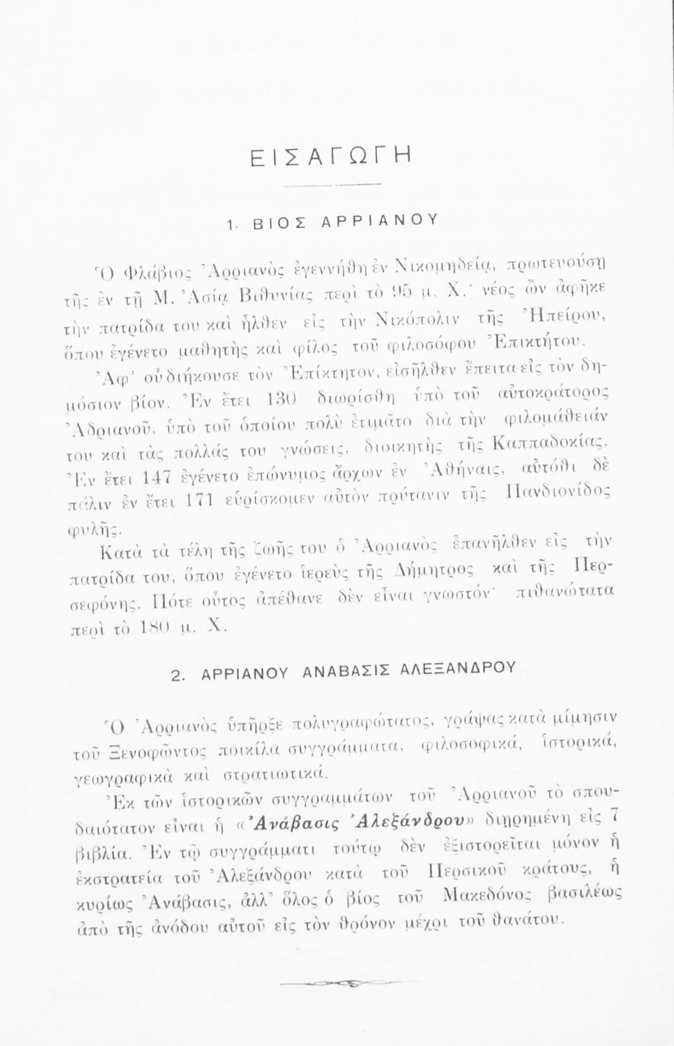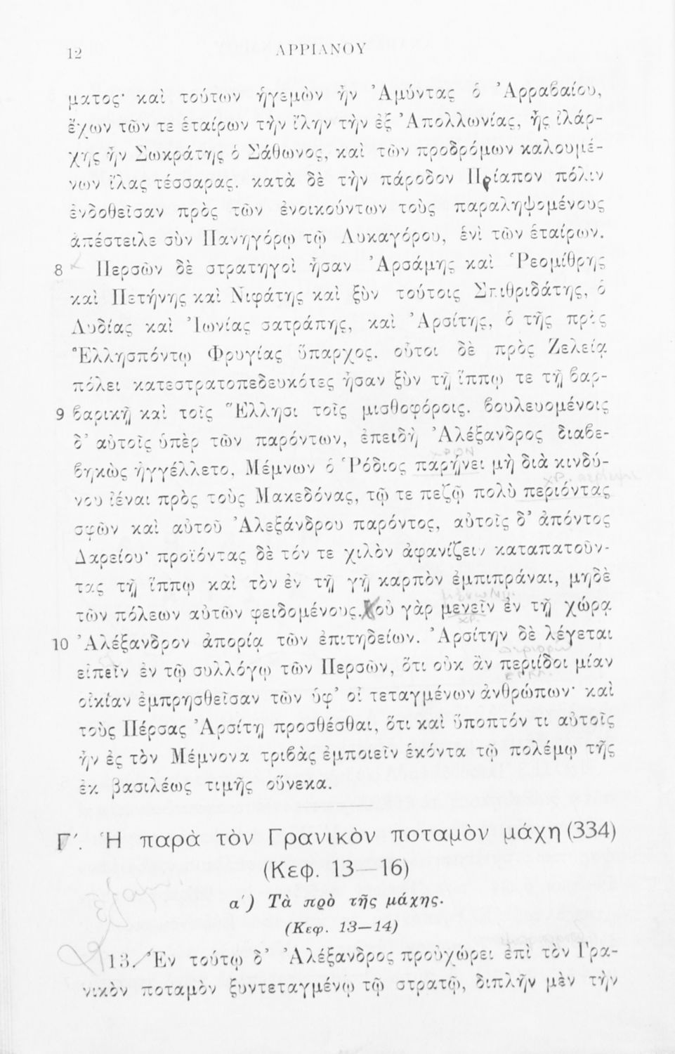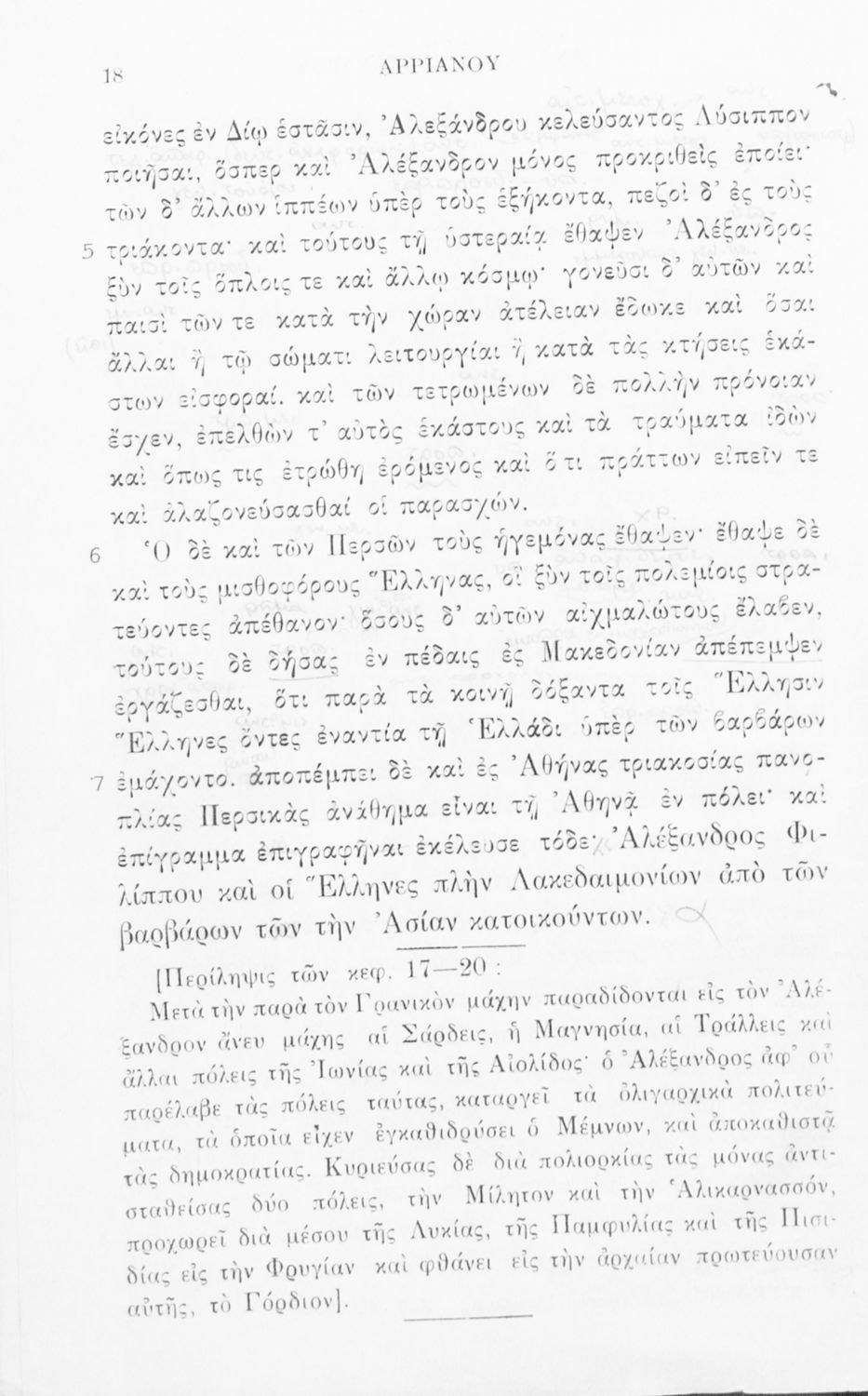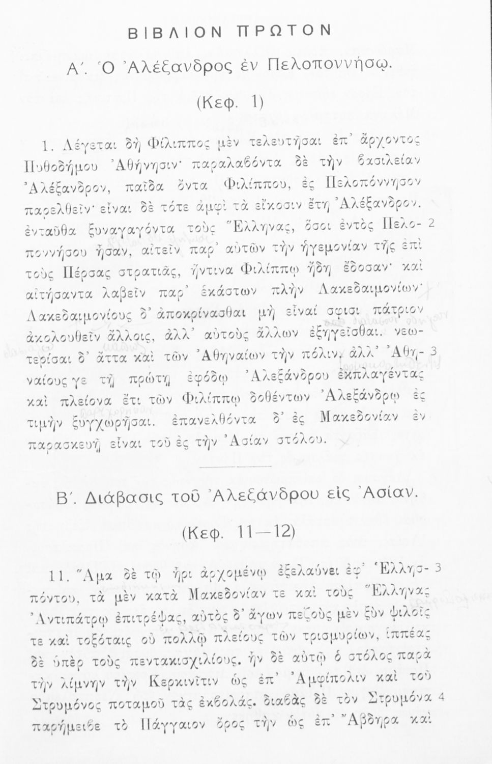 Σχολικό εγχειρίδιο Αρχαίων Ελληνικών Γ΄ Γυμνασίου που περιλαμβάνει σύντομο βιογραφικό σημείωμα του Αρριανού, εισαγωγή στο έργο, αποσπάσματα από το πρώτο και δεύτερο βιβλίο της Ανάβασης του Αλέξανδρου και ετυμολογικές σημειώσεις