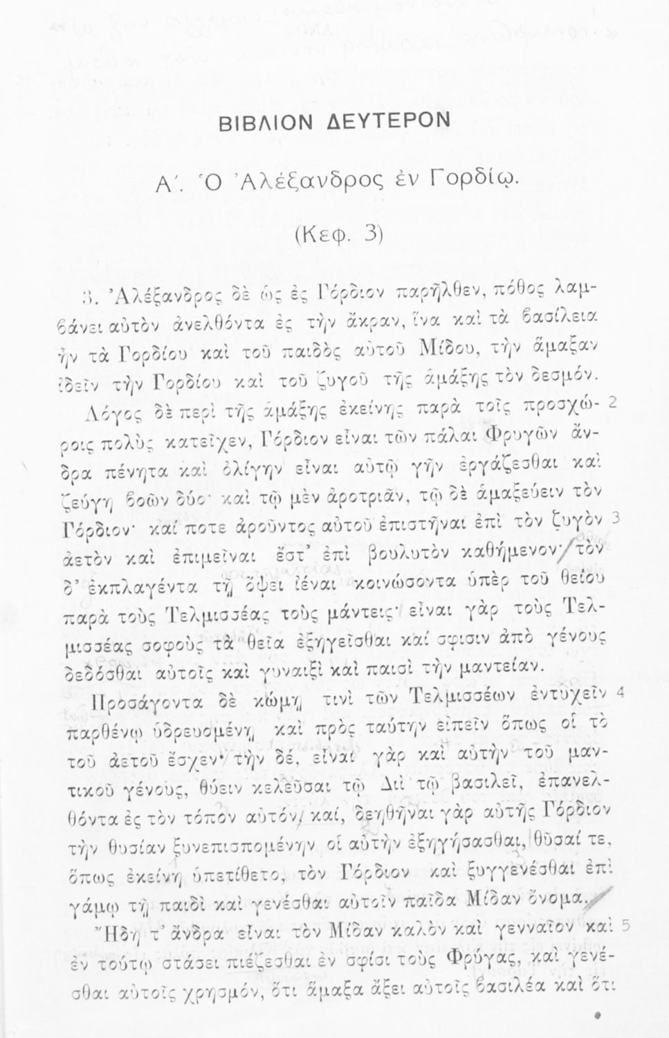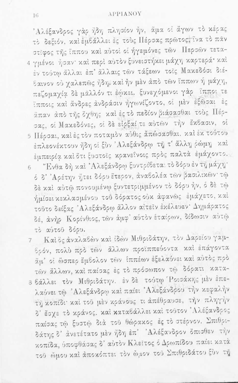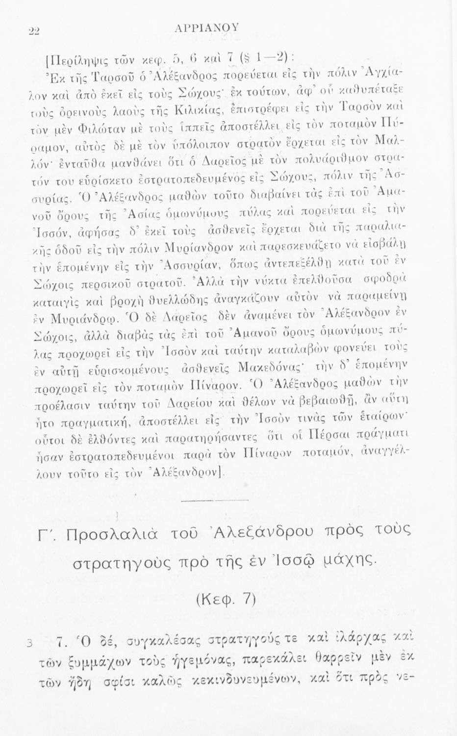 Σχολικό εγχειρίδιο Αρχαίων Ελληνικών Γ΄ Γυμνασίου που περιλαμβάνει σύντομο βιογραφικό σημείωμα του Αρριανού, εισαγωγή στο έργο, αποσπάσματα από το πρώτο και δεύτερο βιβλίο της Ανάβασης του Αλέξανδρου και ετυμολογικές σημειώσεις