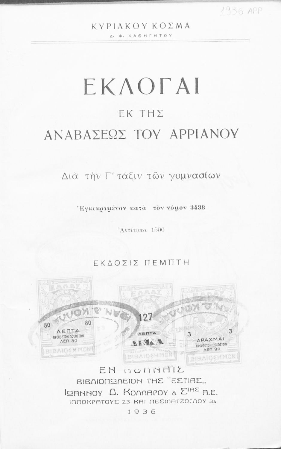 Εκδότης: Ιωάννης Δ. Κολλάρος και ΣΙΑ ΑΕ Έτος έκδοσης: 1936 Τόπος έκδοσης: Αθήνα Έκδοση: 5η Υπουργική απόφαση / Σύμβαση: 34942/27-7-1931 |