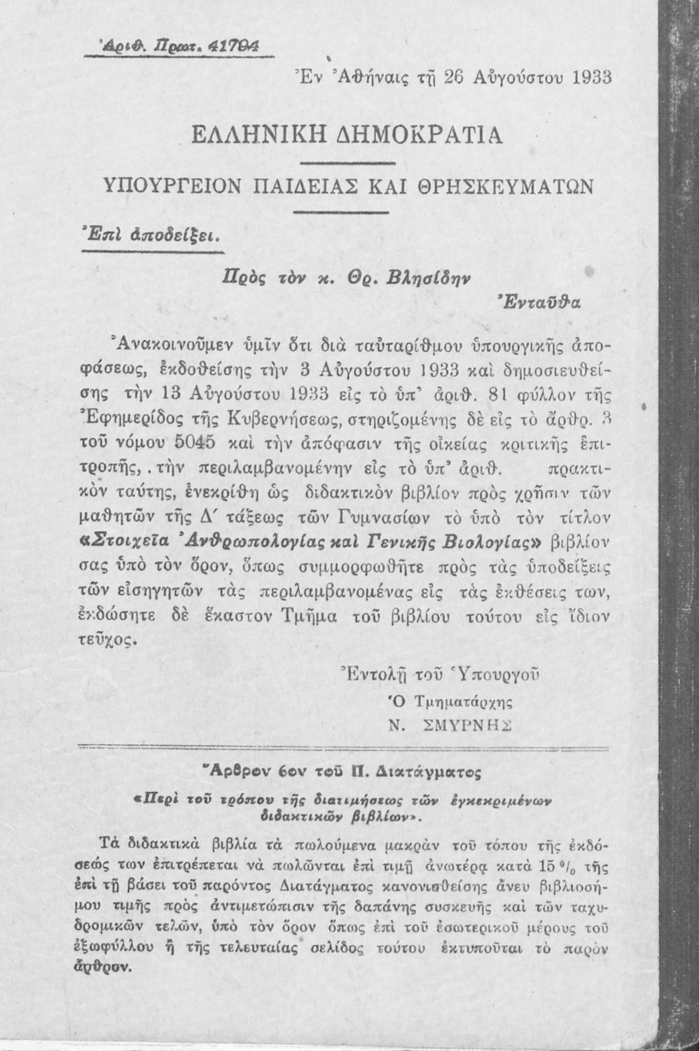 Υπουργική απόφαση / Σύμβαση: 41794/26-8-1933