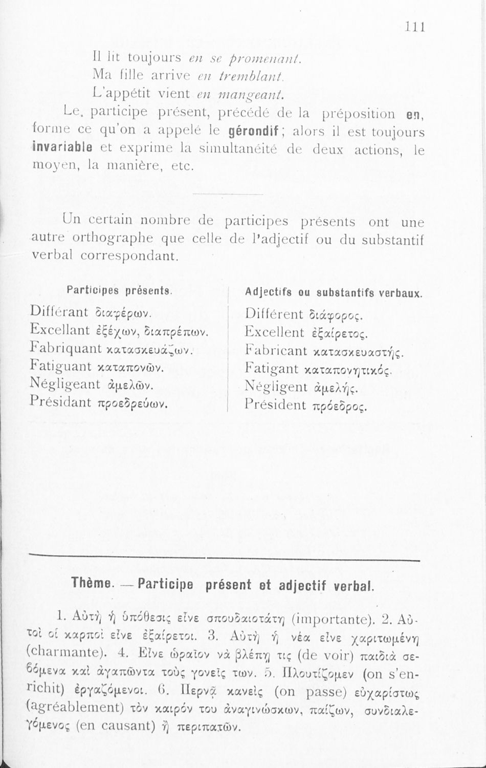 Σχολικό εγχειρίδιο Γαλλικών Γ΄ Γυμνασίου που περιλαμβάνει γραμματικούς και συντακτικούς κανόνες, κείμενα και τις μεταφράσεις τους στην καθαρεύουσα. Περιέχει και λεξιλόγιο.