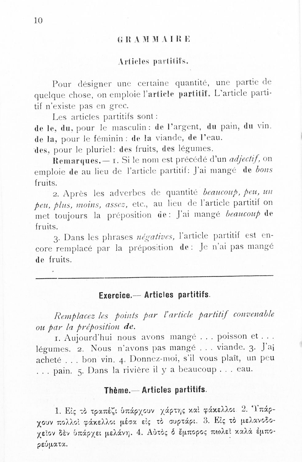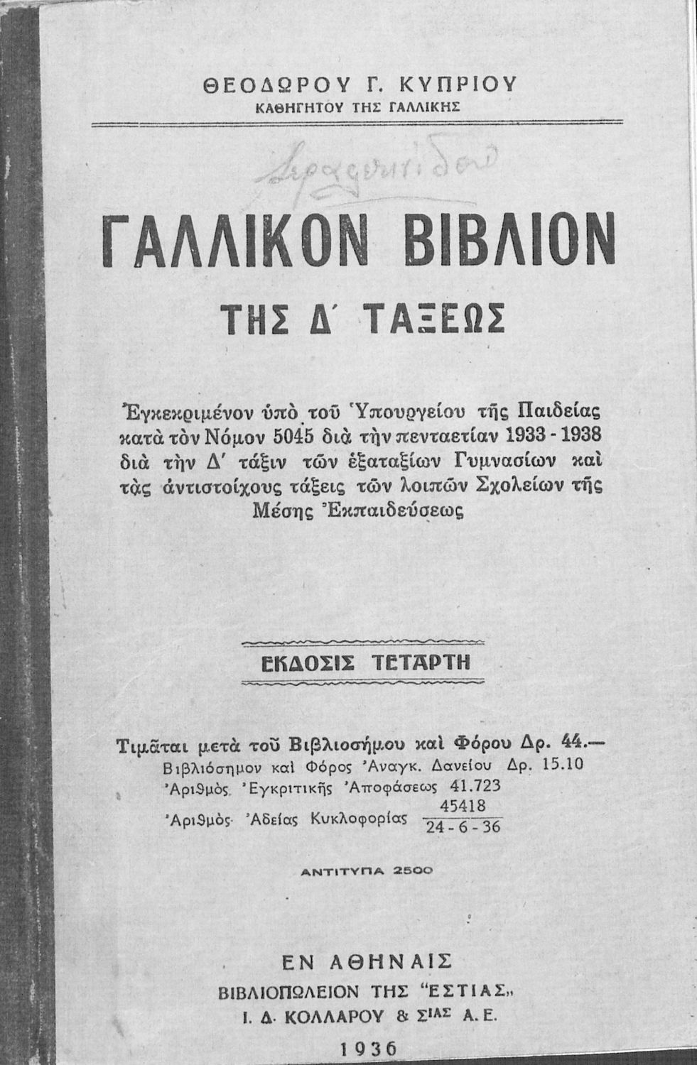Κωδικός αναγνώρισης: 02-01328 Τίτλος: Γαλλικόν βιβλίον της Δ΄ τάξεως, Εγκεκριμένον υπό του Υπουργείου της Παιδείας κατά τον Νόμον 5045 δια την πενταετίαν 1933-1938 διά την Δ΄ τάξιν των Εξαταξίων Γυμνασίων και τας αντιστοίχους τάξεις των λοιπών Σχολείων της Μέσης Εκπαιδεύσεως Συγγραφέας: Θεόδωρος Γ. Κύπριος Μέγεθος και υπόστρωμα: Σχολικό εγχειρίδιο, σκληρό εξώφυλλο, 212 σελίδες. Σκίτσα (ασπρόμαυρα). |