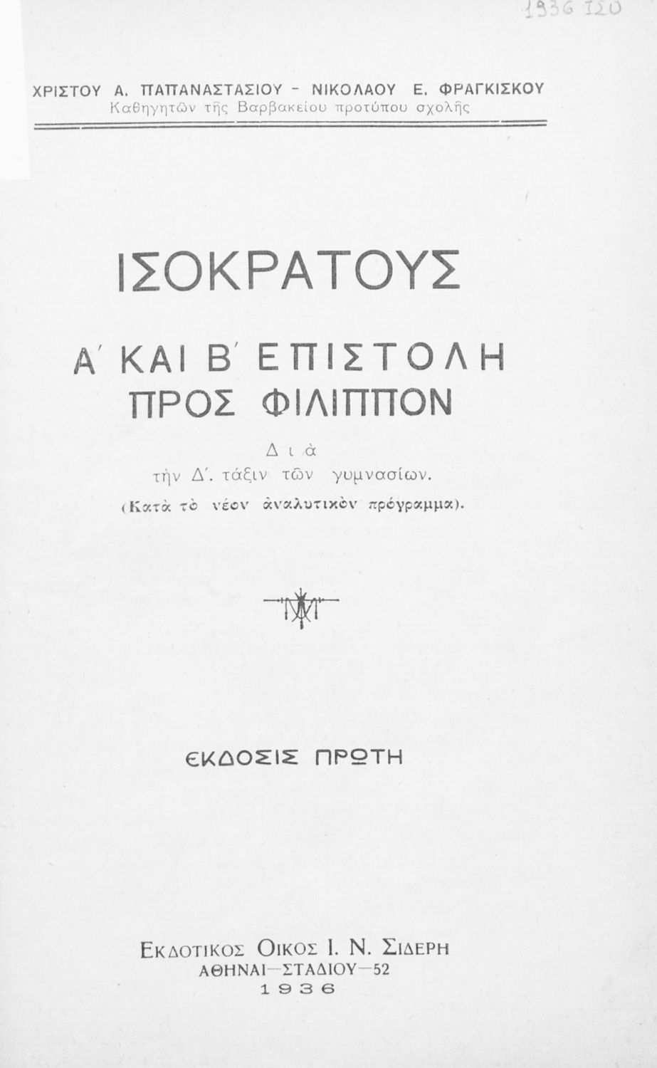 Τίτλος: Ισοκράτους Α΄ και Β΄ επιστολή προς Φίλιππον προς χρήσιν των μαθητών της Δ΄ τάξεως των Γυμνασίων και των αντίστοιχων σχολείων της Μέσης Εκπαιδεύσεως