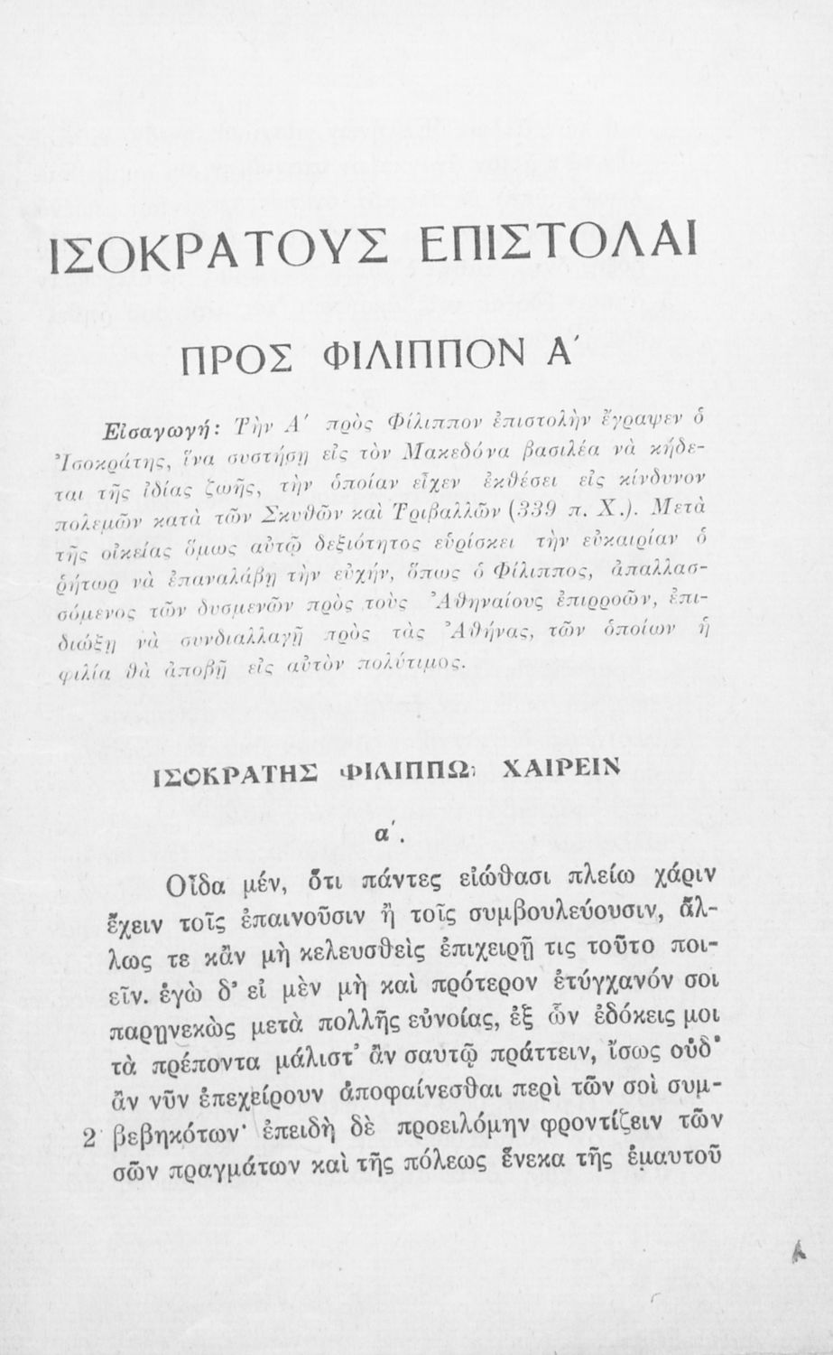 Ισοκράτους Α΄ και Β΄ επιστολή προς Φίλιππον προς χρήσιν των μαθητών της Δ΄ τάξεως των Γυμνασίων και των αντίστοιχων σχολείων της Μέσης Εκπαιδεύσεως