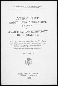 Κωδικός αναγνώρισης: 02-01334b Τίτλος: Ισοκράτους Α΄ και Β΄ επιστολή προς Φίλιππον προς χρήσιν των μαθητών της Δ΄ τάξεως των Γυμνασίων και των αντίστοιχων σχολείων της Μέσης Εκπαιδεύσεως Συγγραφέας: Ισοκράτης, Νικόλαος Ε. Φραγκίσκος, Χρίστος Α. Παπαναστασίου (σχόλια) Μέγεθος και υπόστρωμα: Μαθητικό βοήθημα, μαλακό εξώφυλλο, 34 σελίδες. |