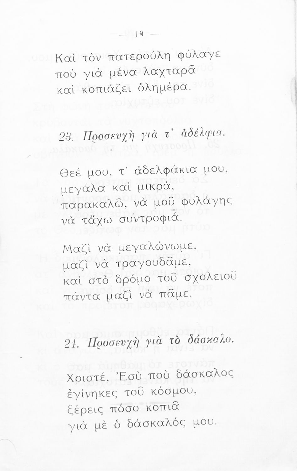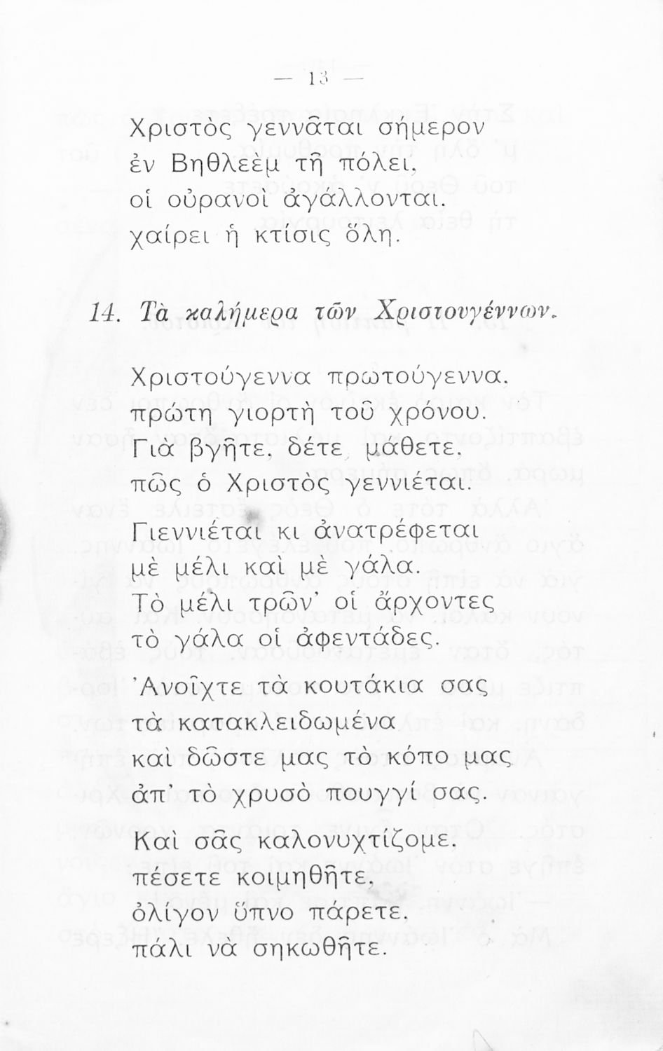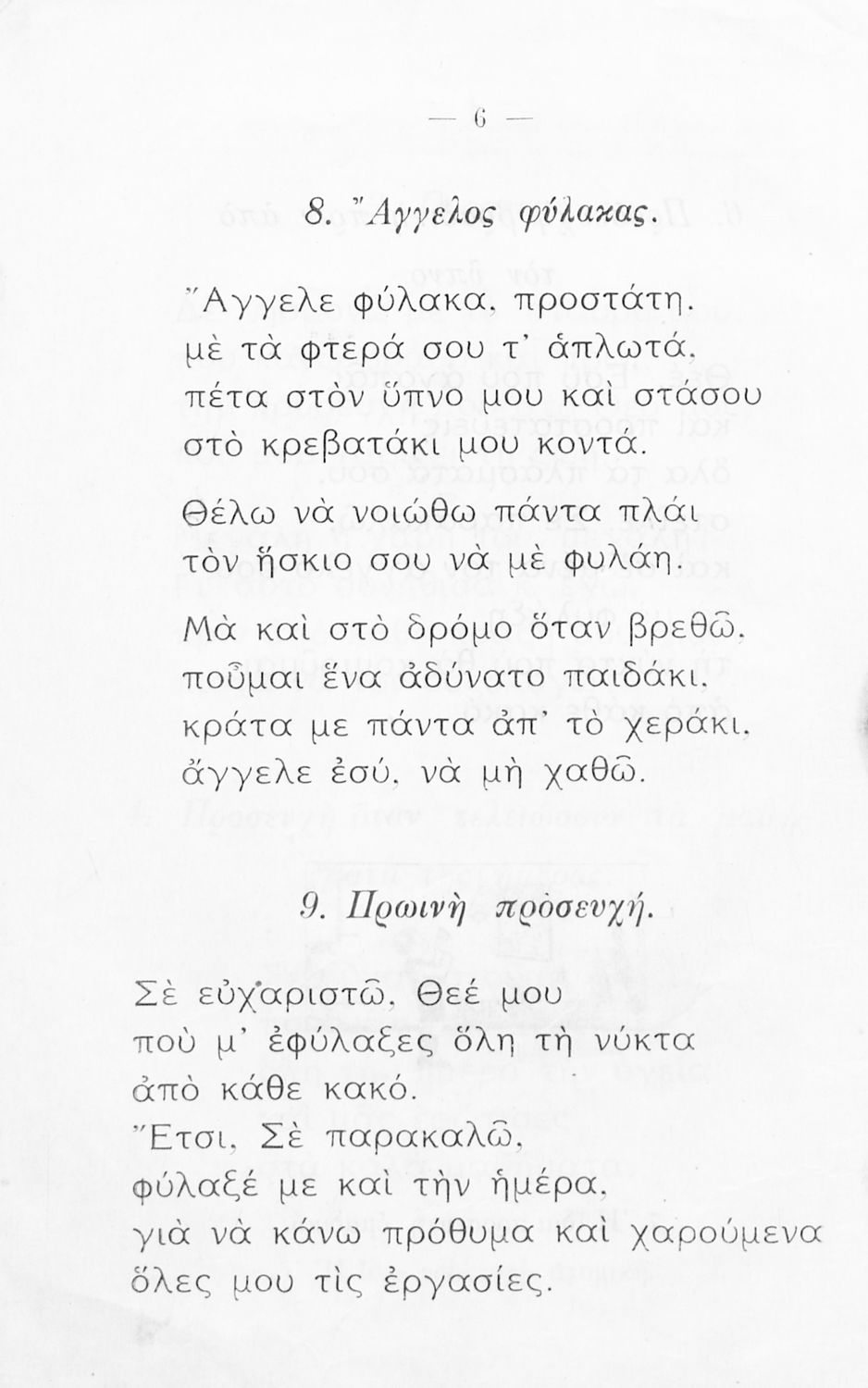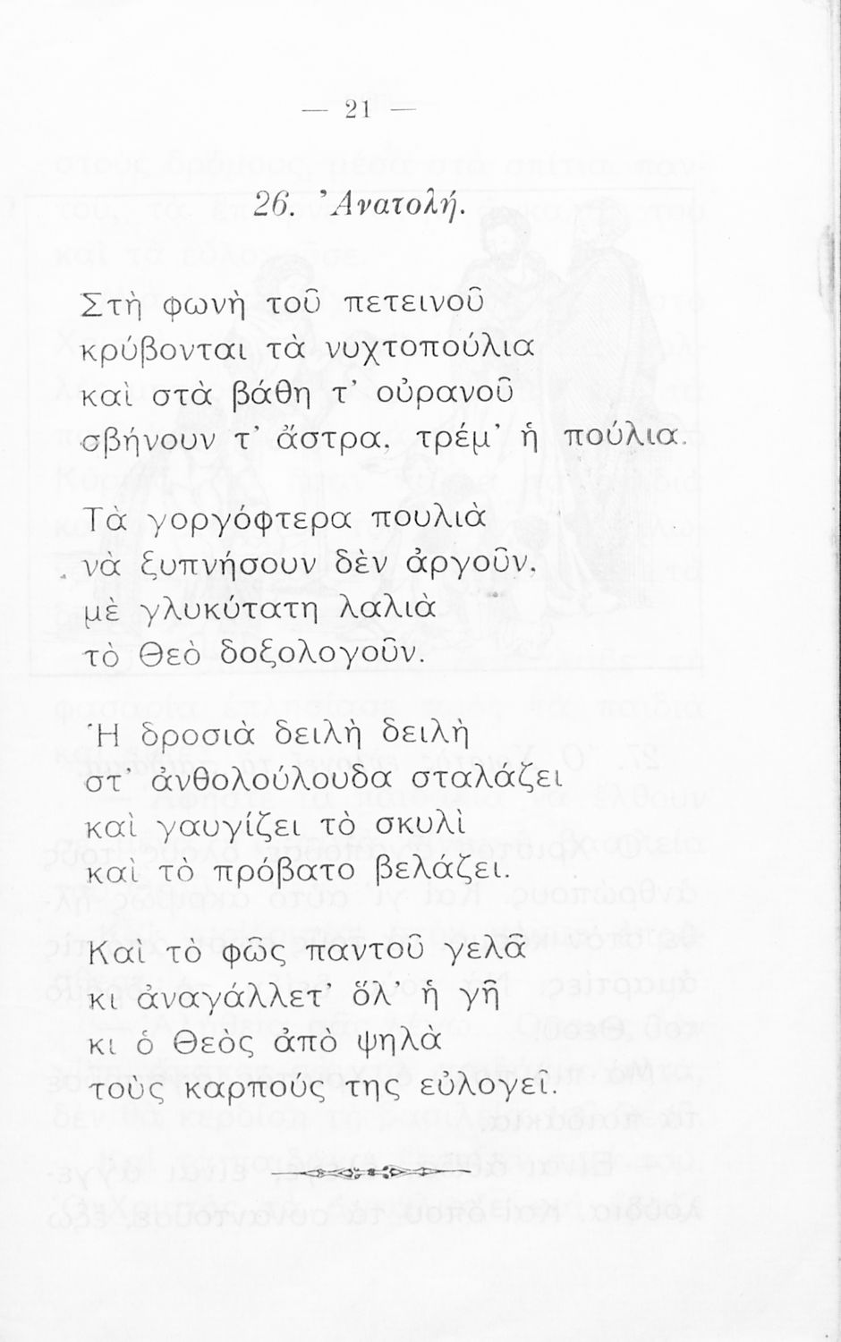 Μαθητικό βοήθημα Θρησκευτικών Α΄ και Β΄ Δημοτικού που περιλαμβάνει ποιήματα και πεζά χριστιανικού περιεχομένου. Φέρει την έγκριση της Ιεράς Συνόδου.