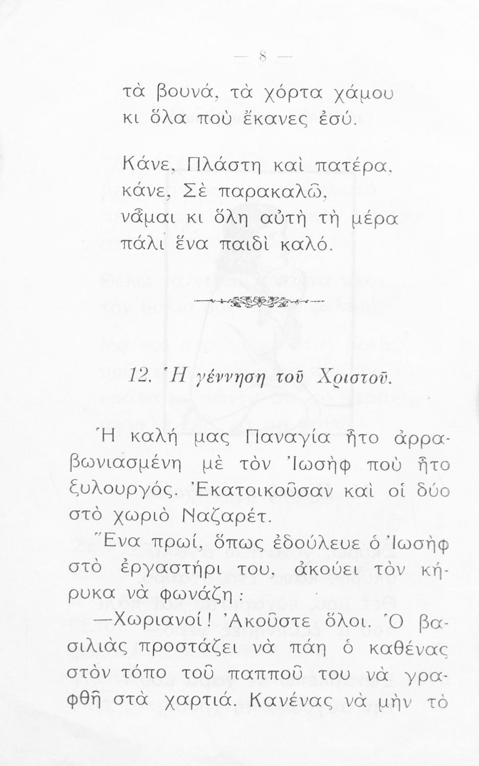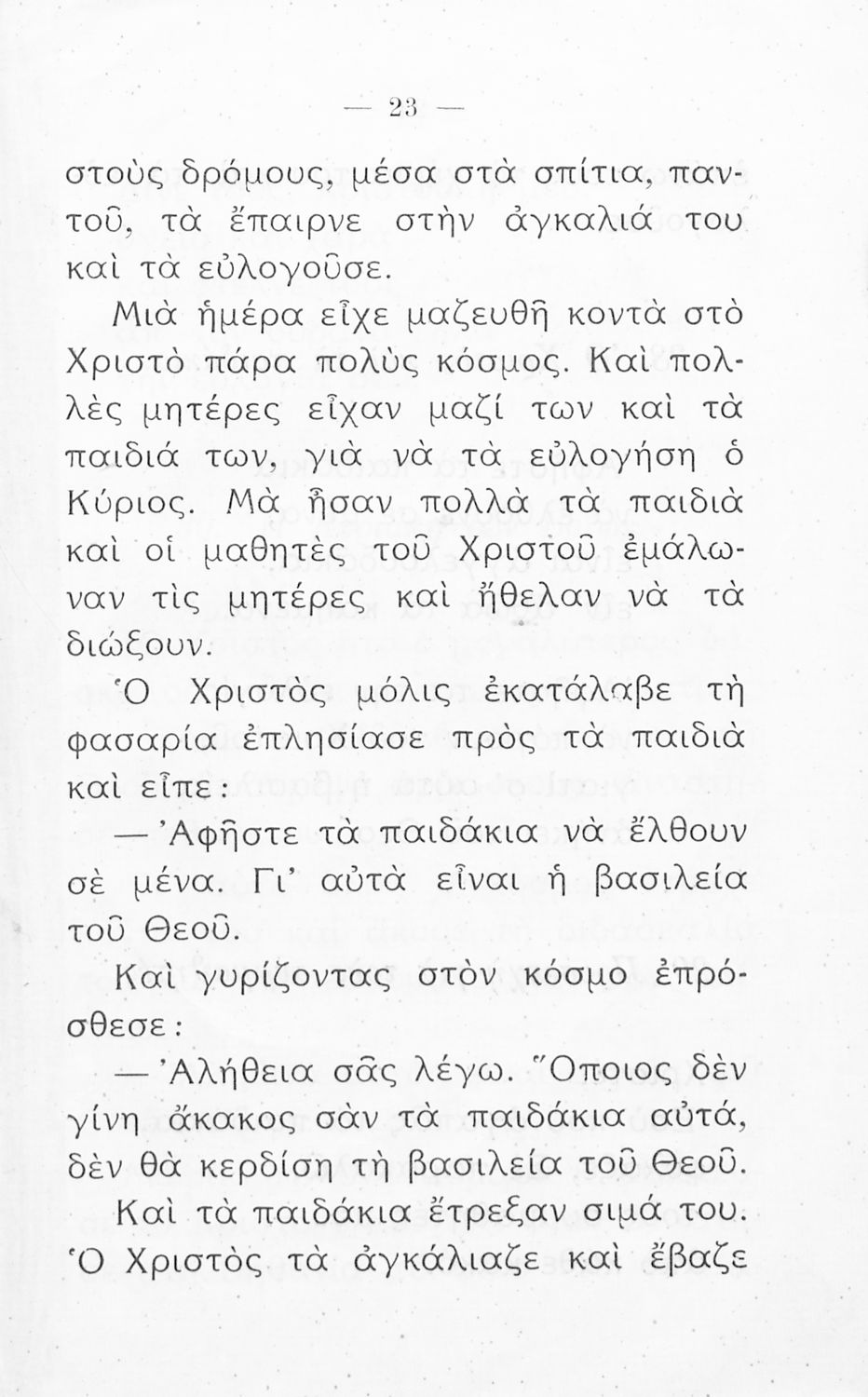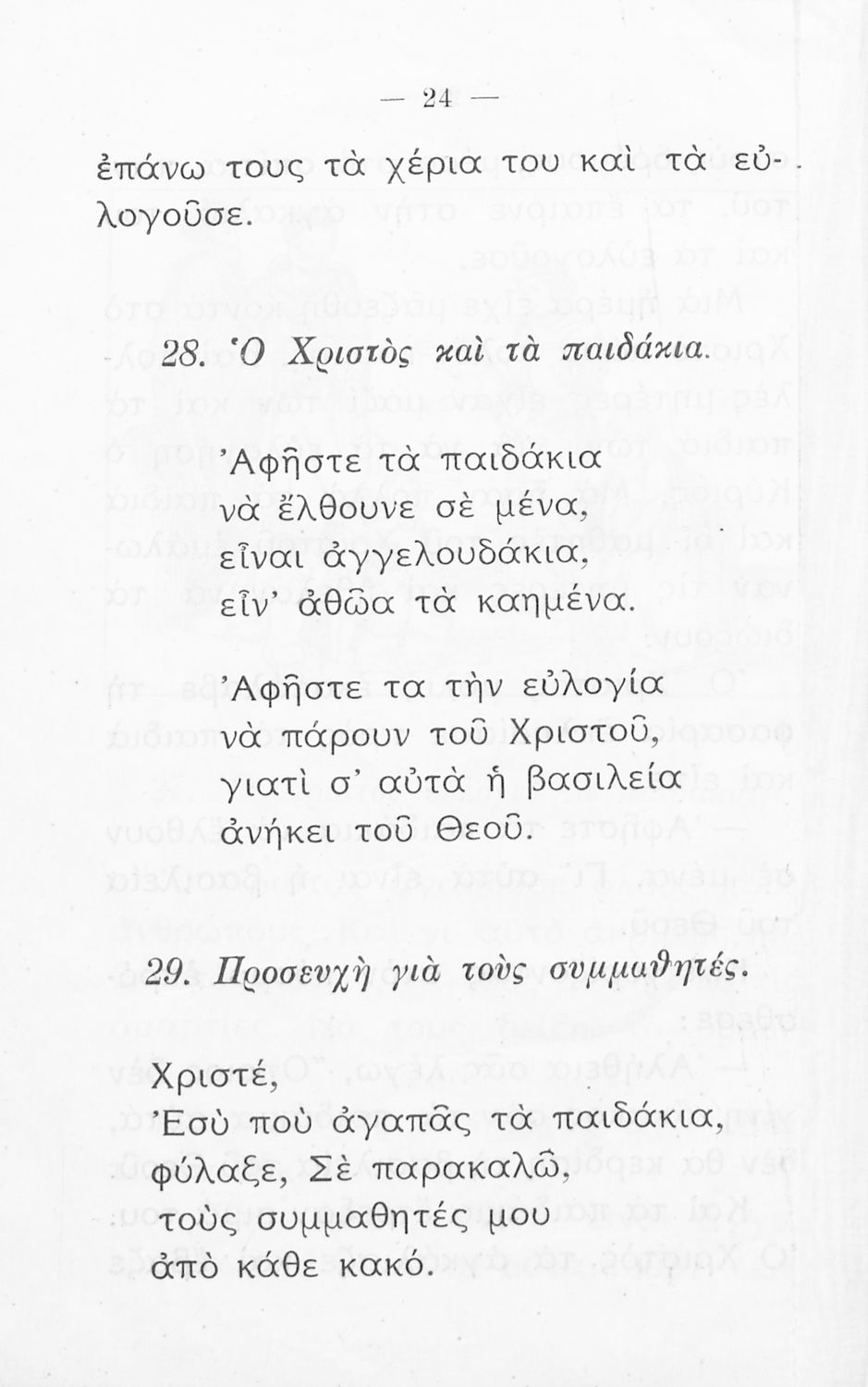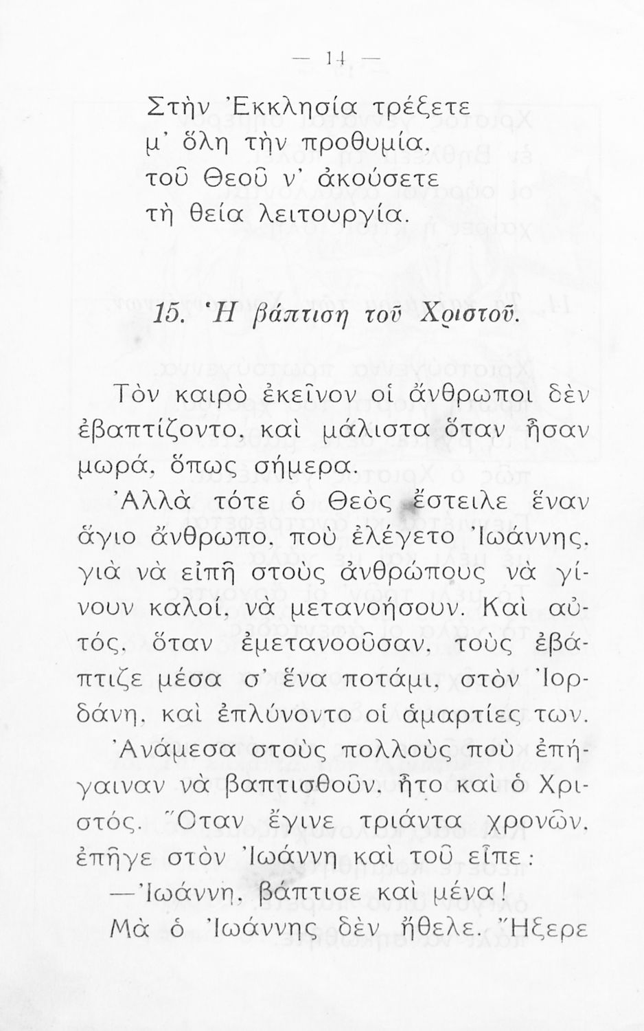 Μαθητικό βοήθημα Θρησκευτικών Α΄ και Β΄ Δημοτικού που περιλαμβάνει ποιήματα και πεζά χριστιανικού περιεχομένου. Φέρει την έγκριση της Ιεράς Συνόδου.