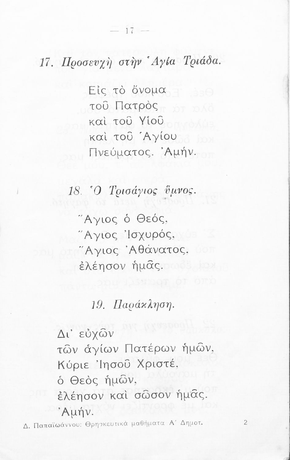 Βαθμίδα εκπαίδευσης: Πρωτοβάθμια Τάξη: Α' Δημοτικού / Β' Δημοτικού Μάθημα: Θρησκευτικά Γλώσσα: Δημοτική με στοιχεία καθαρεύουσας Παρουσίαση περιεχομένου: Μαθητικό βοήθημα Θρησκευτικών Α΄ και Β΄ Δημοτικού που περιλαμβάνει ποιήματα και πεζά χριστιανικού περιεχομένου. Φέρει την έγκριση της Ιεράς Συνόδου. |